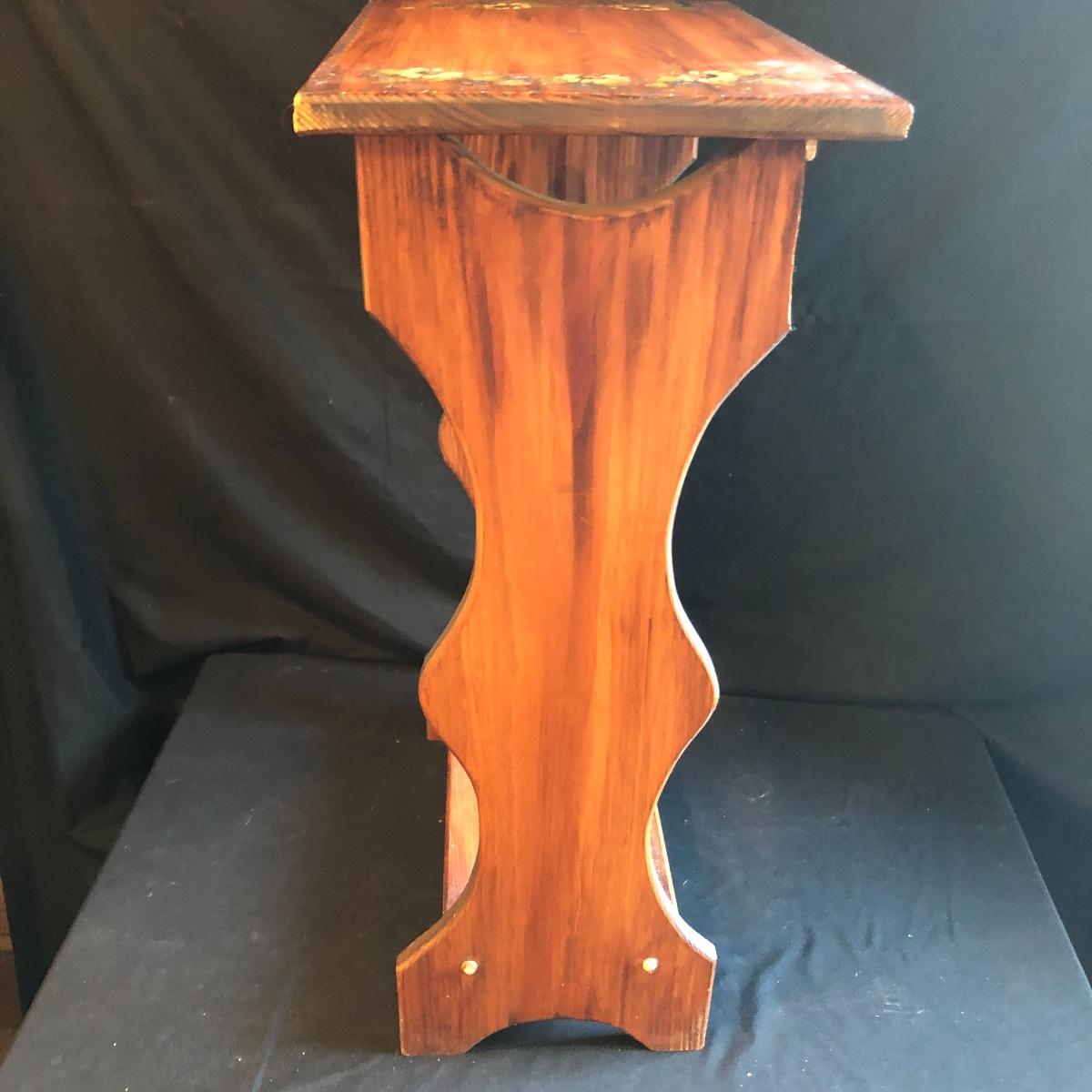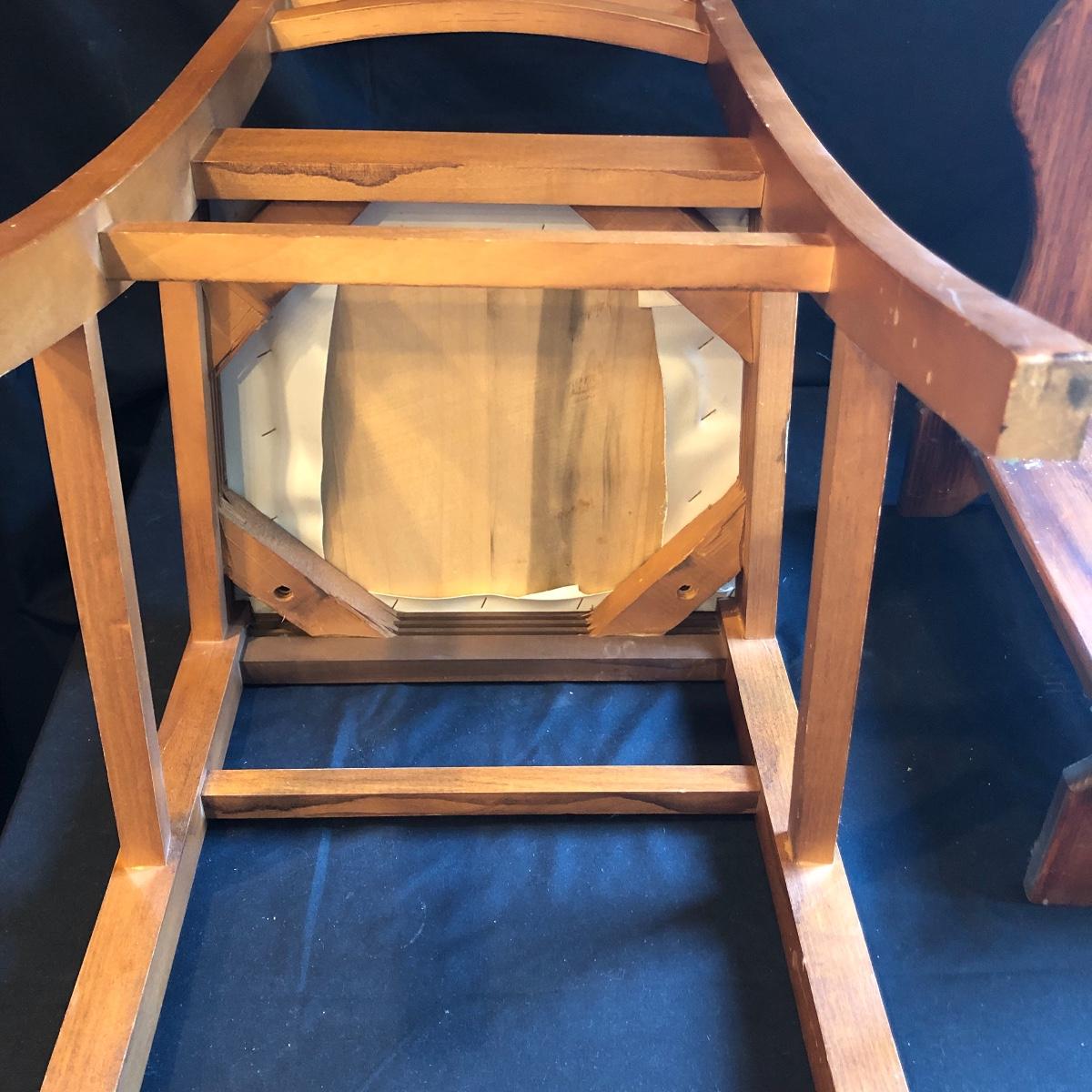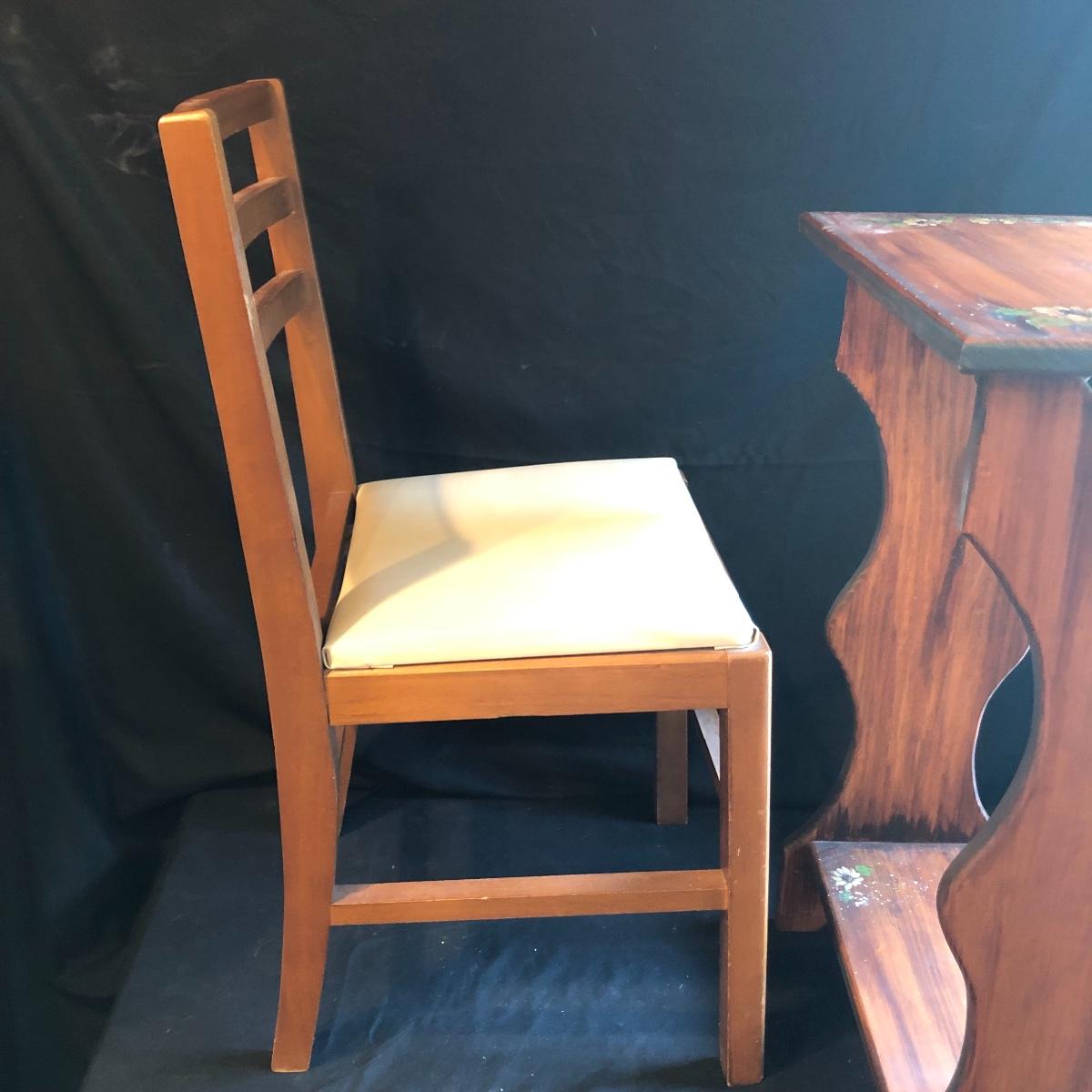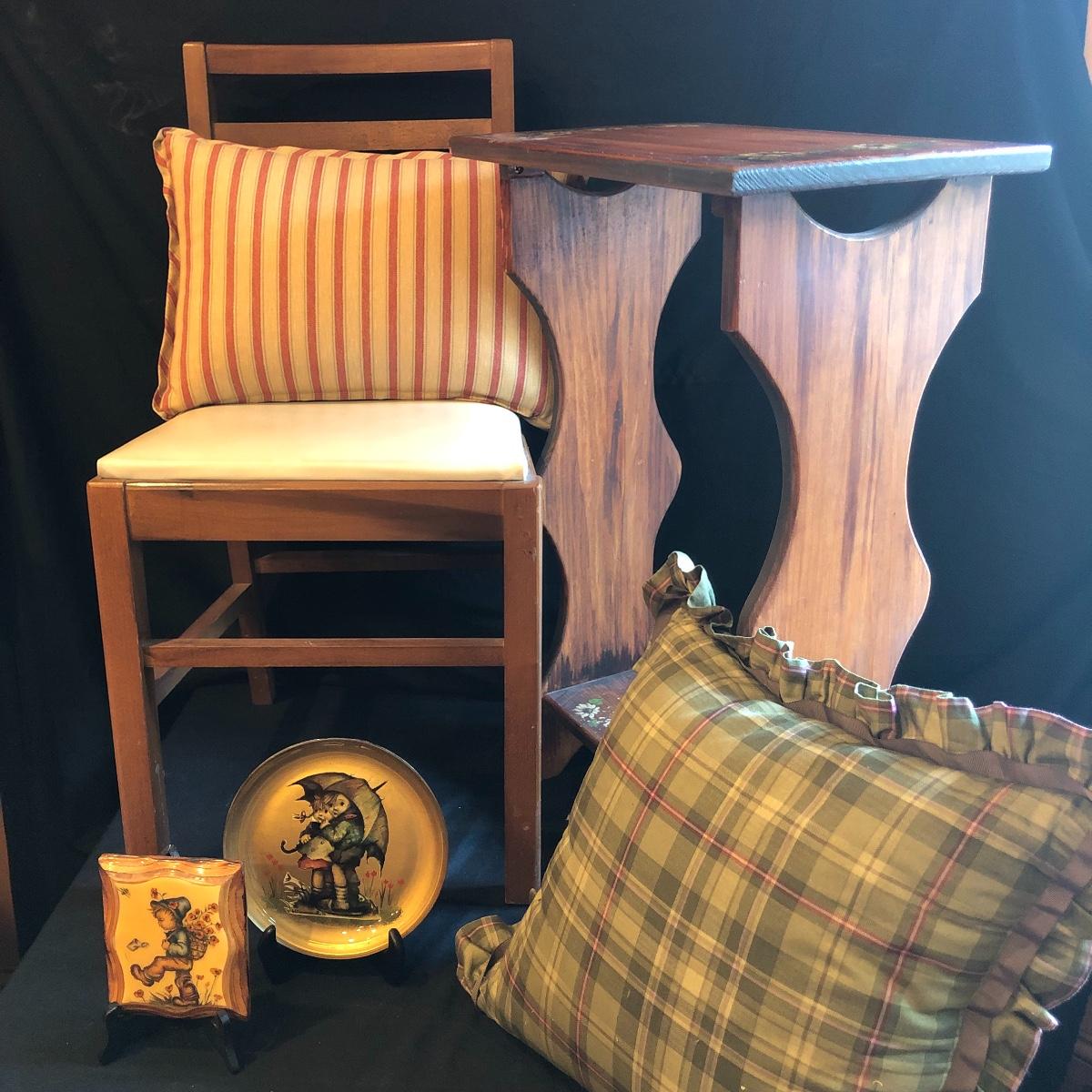 This great small chair has a simple and clean look about. It’s in good condition and measures 15” deep 15” wide x 31” tall with 17” seat height. Accompanying this chair are two accent cushions, a narrow wood side table with possibly hand painted floral design and a decorative plate and wooden piece.