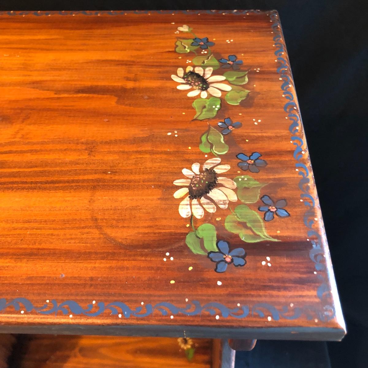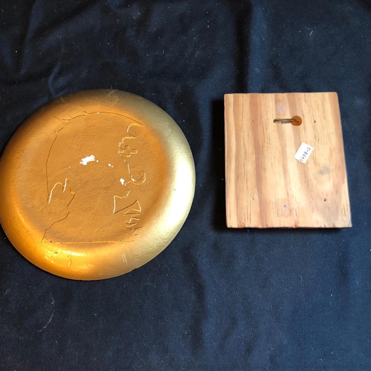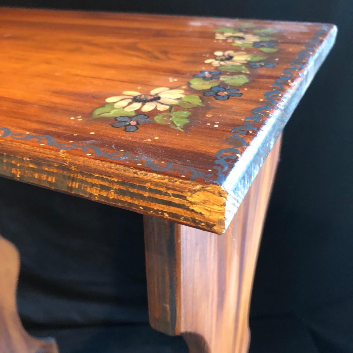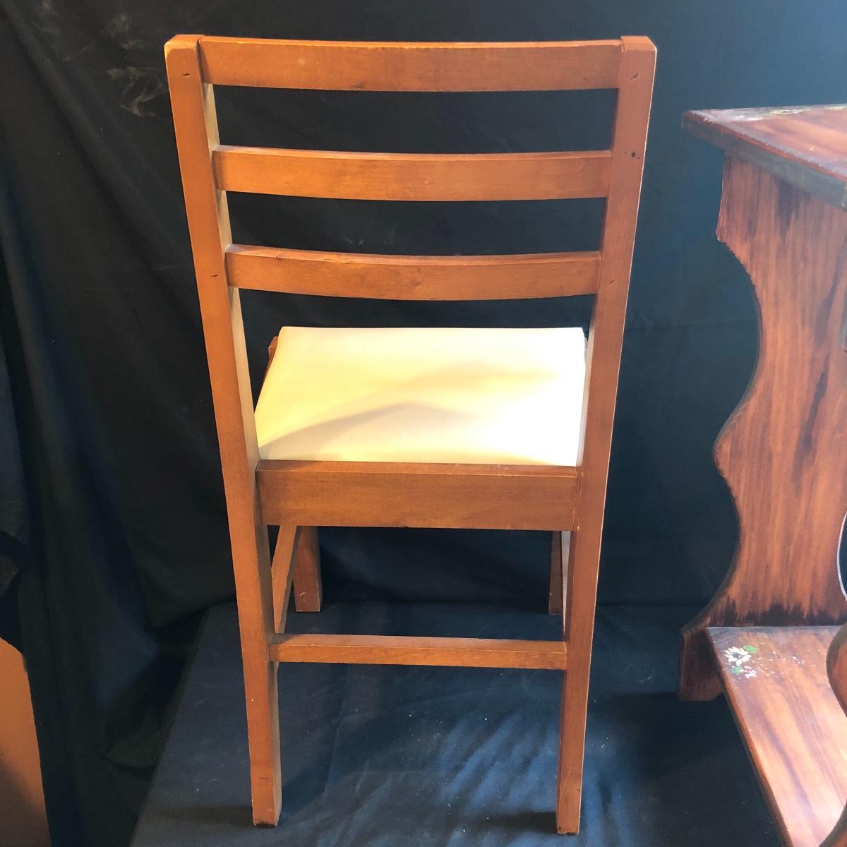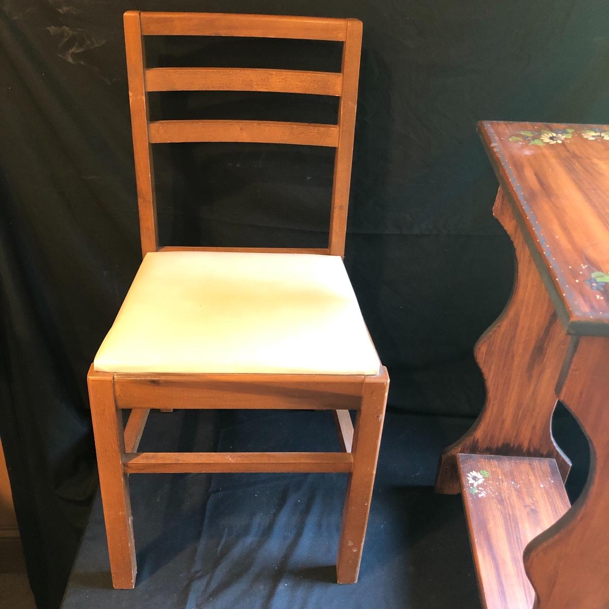 This great small chair has a simple and clean look about. It’s in good condition and measures 15” deep 15” wide x 31” tall with 17” seat height. Accompanying this chair are two accent cushions, a narrow wood side table with possibly hand painted floral design and a decorative plate and wooden piece.