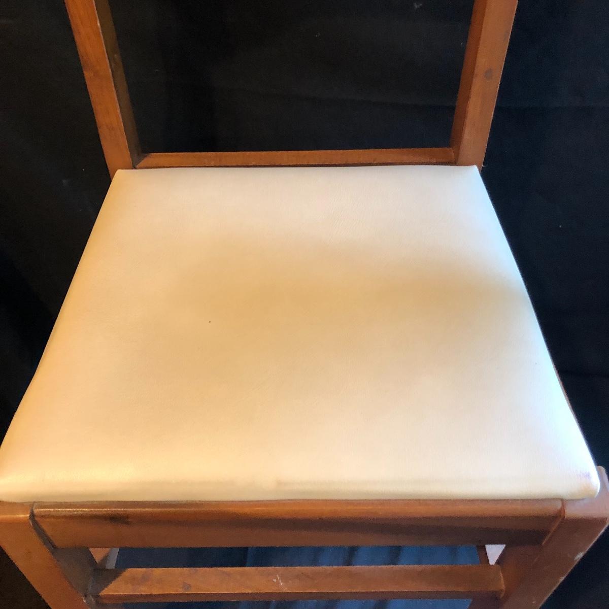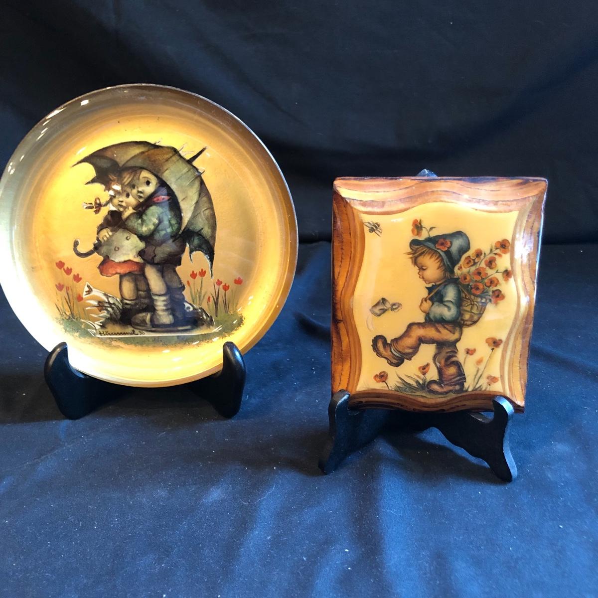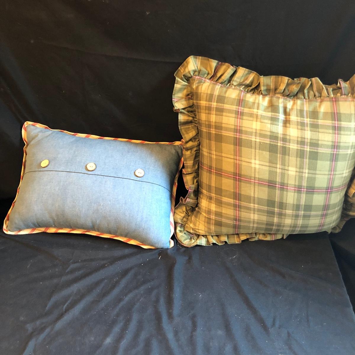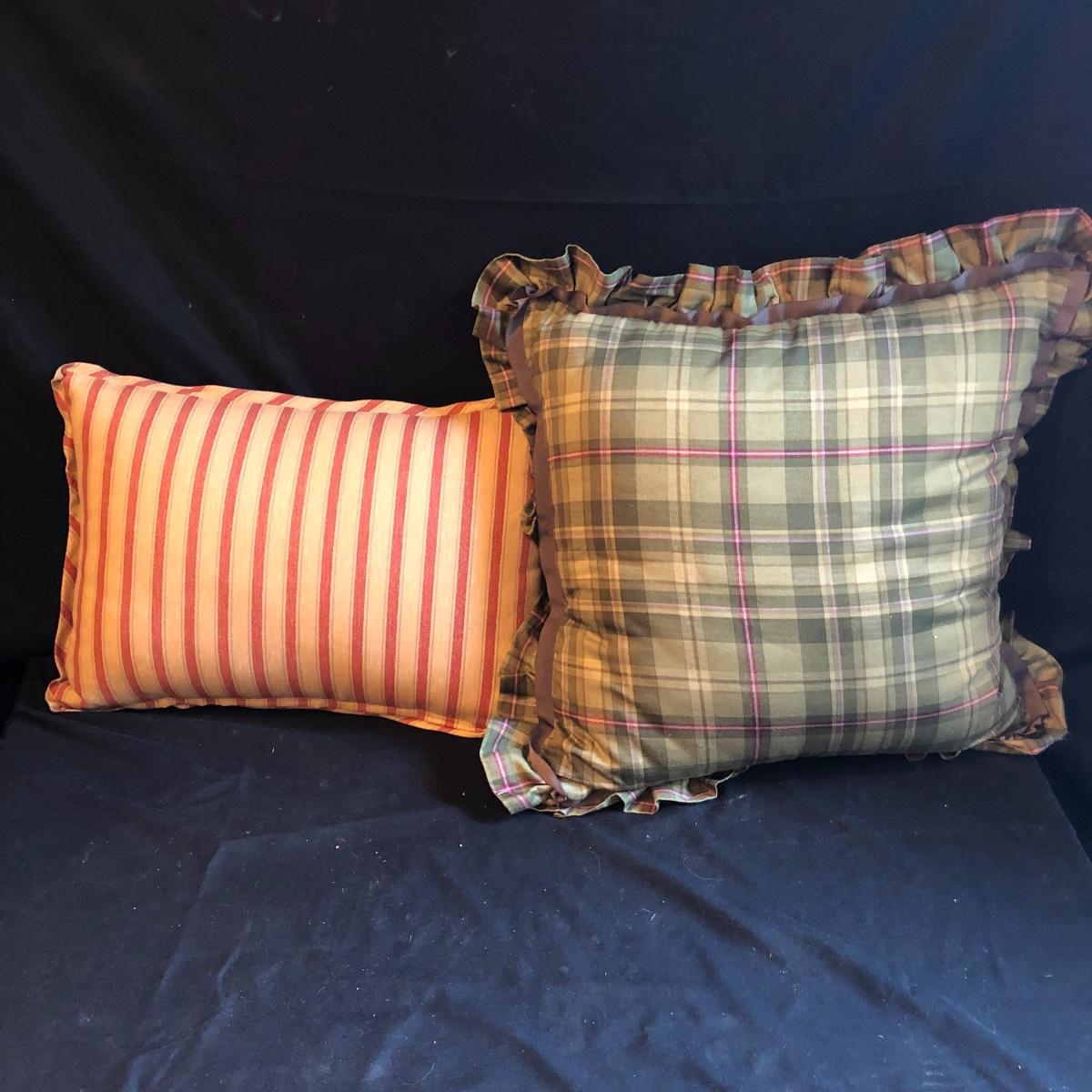 This great small chair has a simple and clean look about. It’s in good condition and measures 15” deep 15” wide x 31” tall with 17” seat height. Accompanying this chair are two accent cushions, a narrow wood side table with possibly hand painted floral design and a decorative plate and wooden piece.