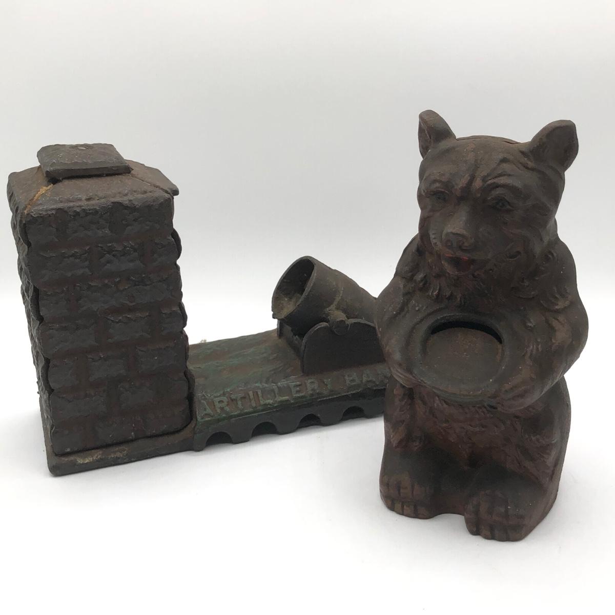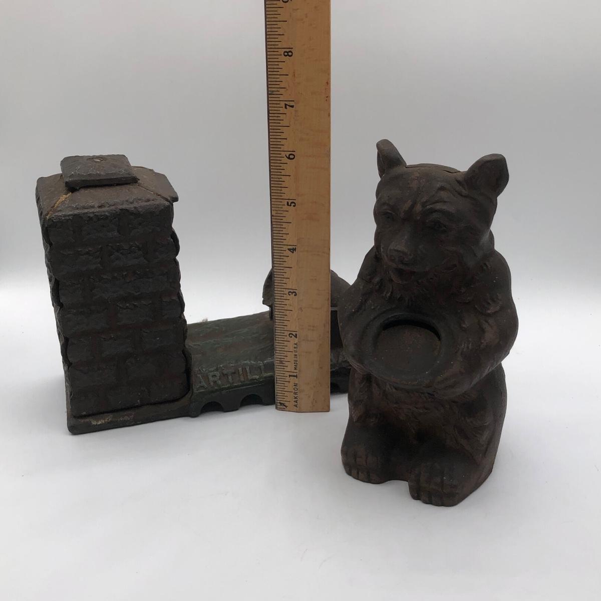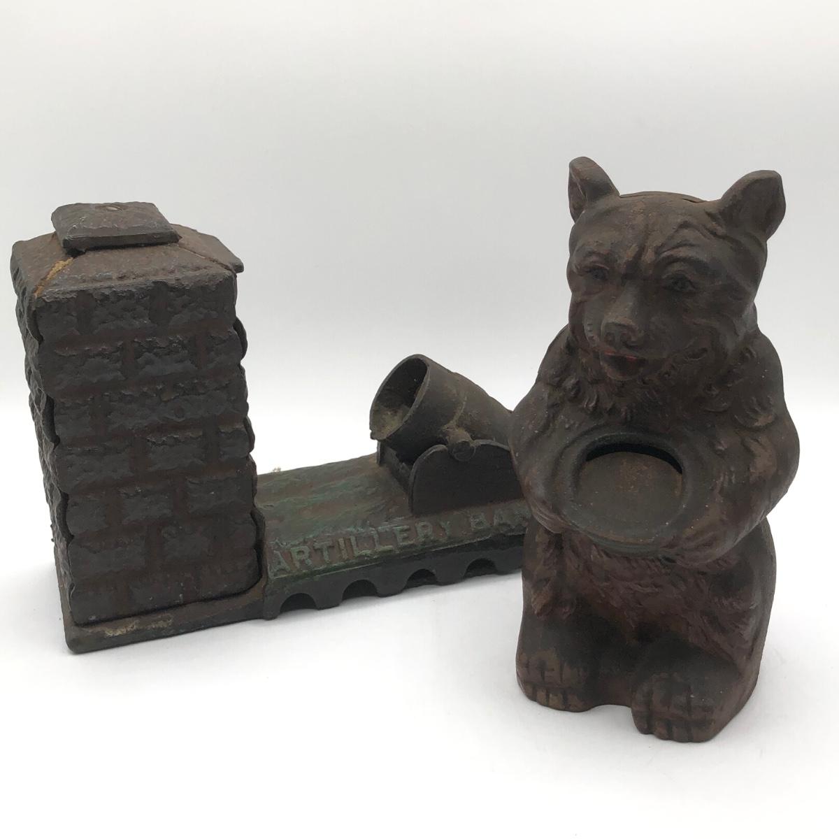 LOT 429K: Vintage Cast Iron Coin Banks - Hubley Bear / Dog & Artillery Bank