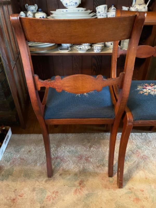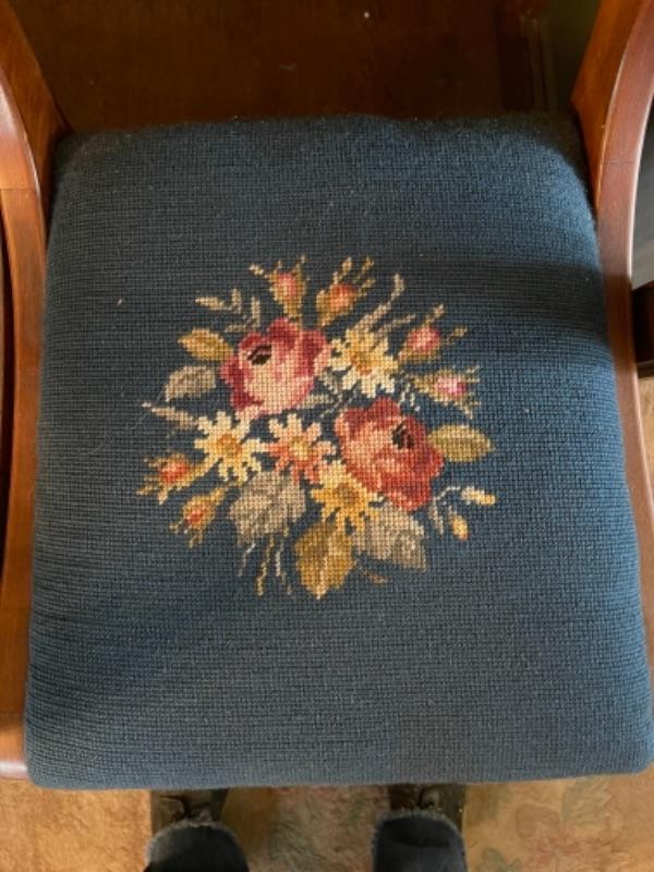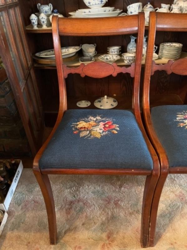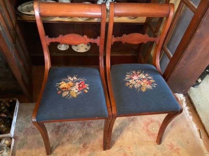 Lot 42DR. Pair of carved chairs with needlepoint cushions--$125