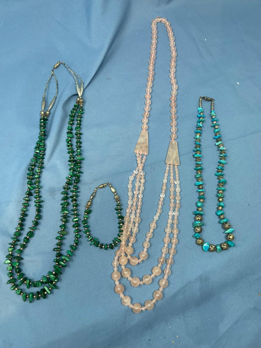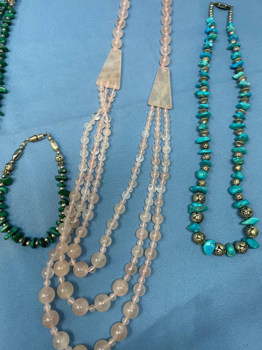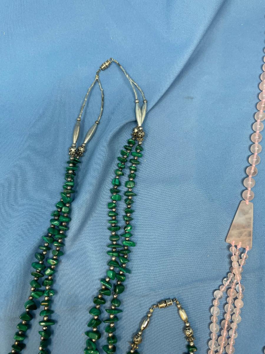 Malachite necklace & bracelet. Not silver. Rose quartz, & turquoise, not silver.