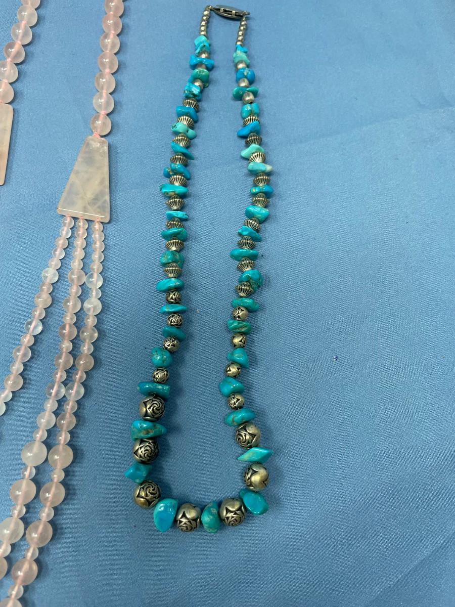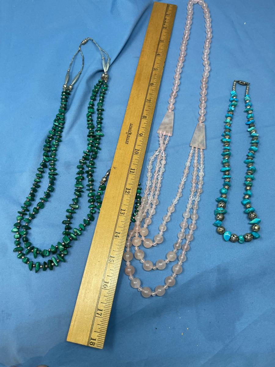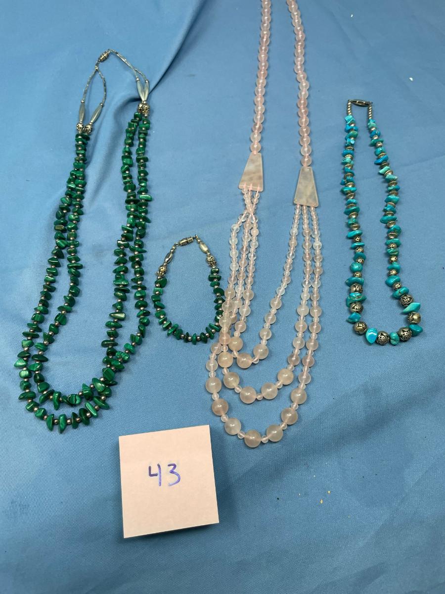 Malachite necklace & bracelet. Not silver. Rose quartz, & turquoise, not silver.