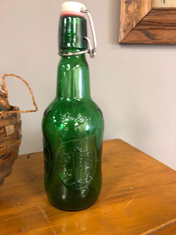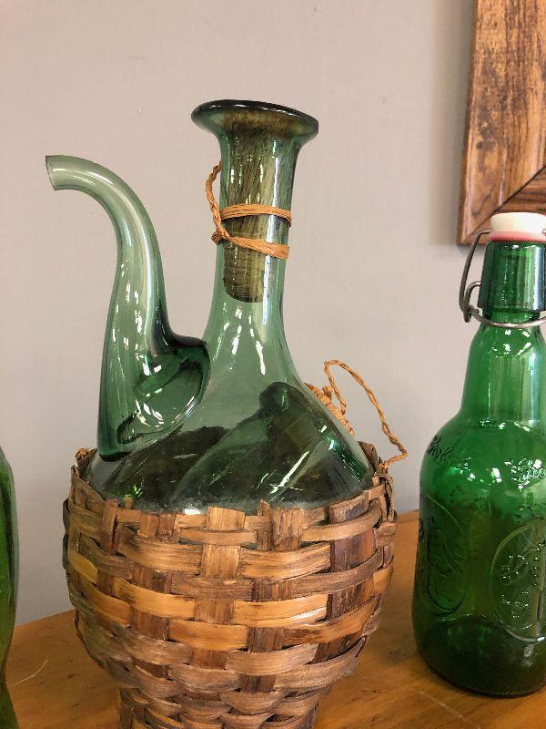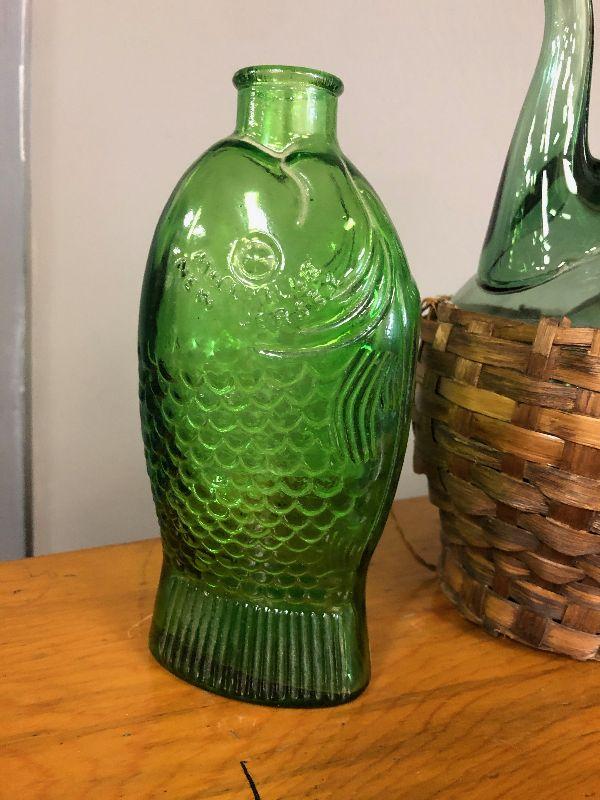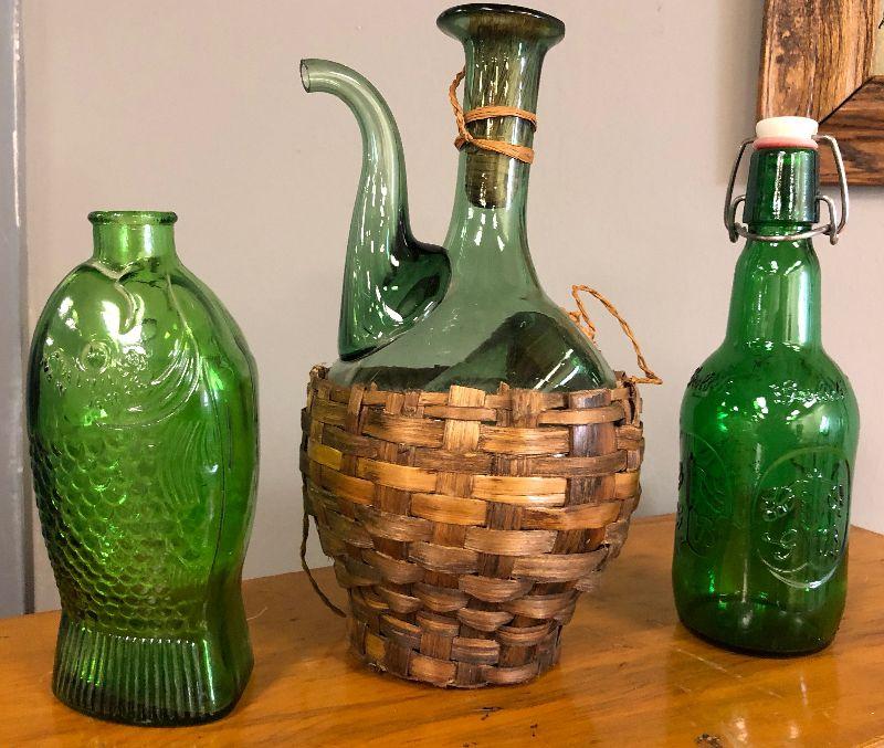 Lot #43 3 Green Glass Bottle Decanters with fish, basket, beer