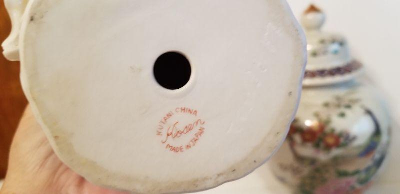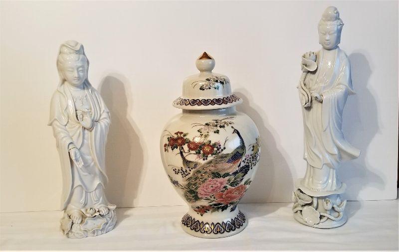 You get all you see here - 12" tall Ginger jar with 1970's Japan label - the taller Chinese Deity holds a lotus blossom and stands 14" tall, the smaller is 12" tall. All in good condition.
