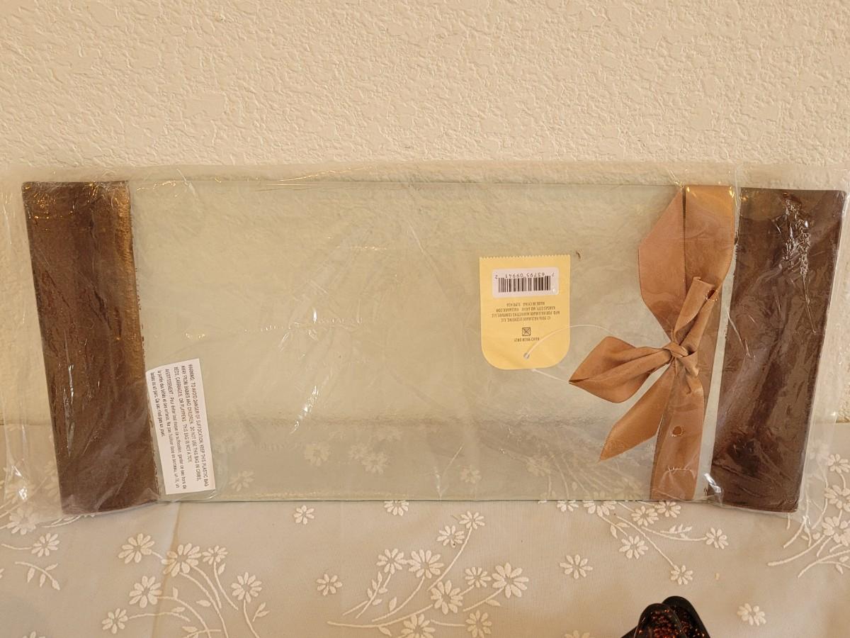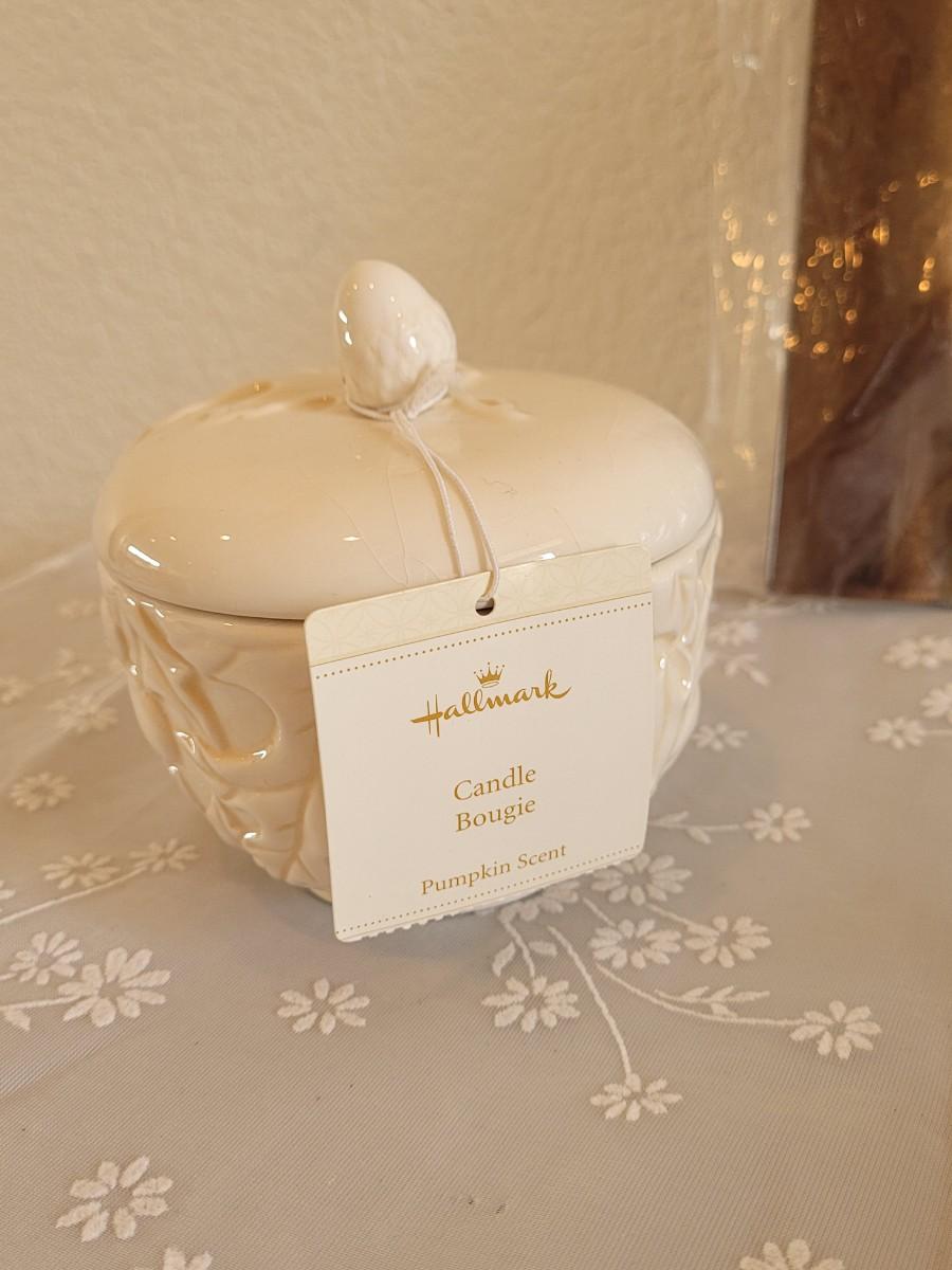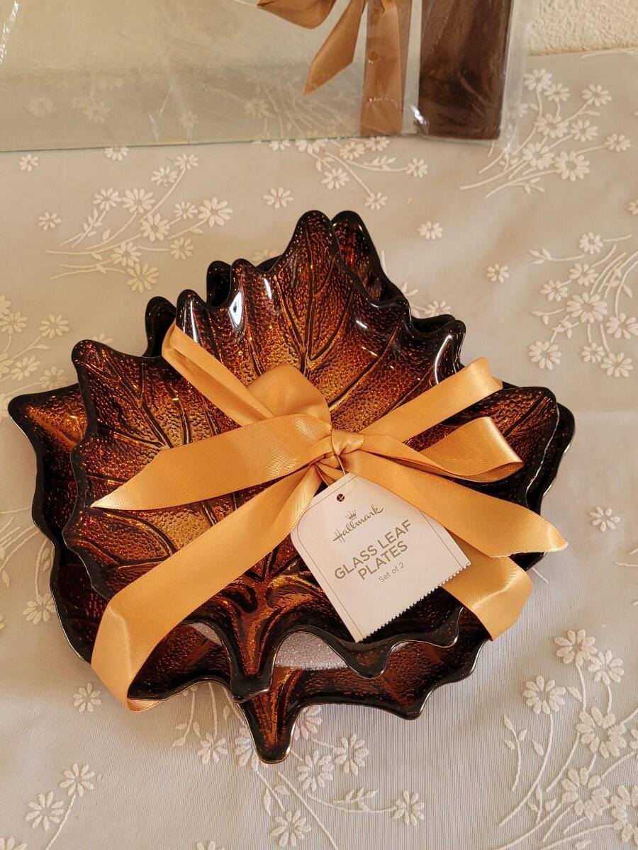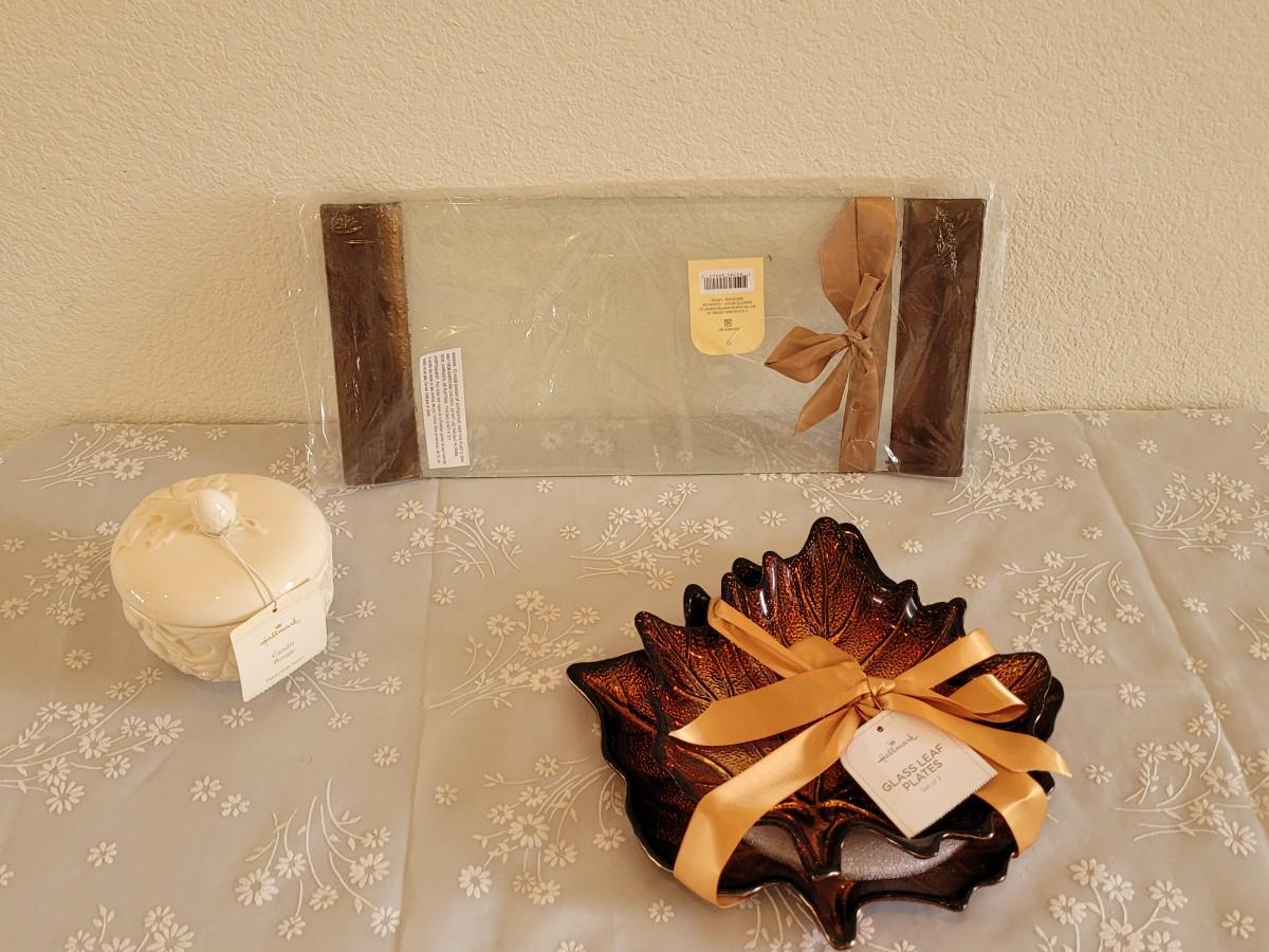 Lot 43: Glass Hallmark Appetizer Tray, Fall Leaf Plates and Pumpkin Spice Candle