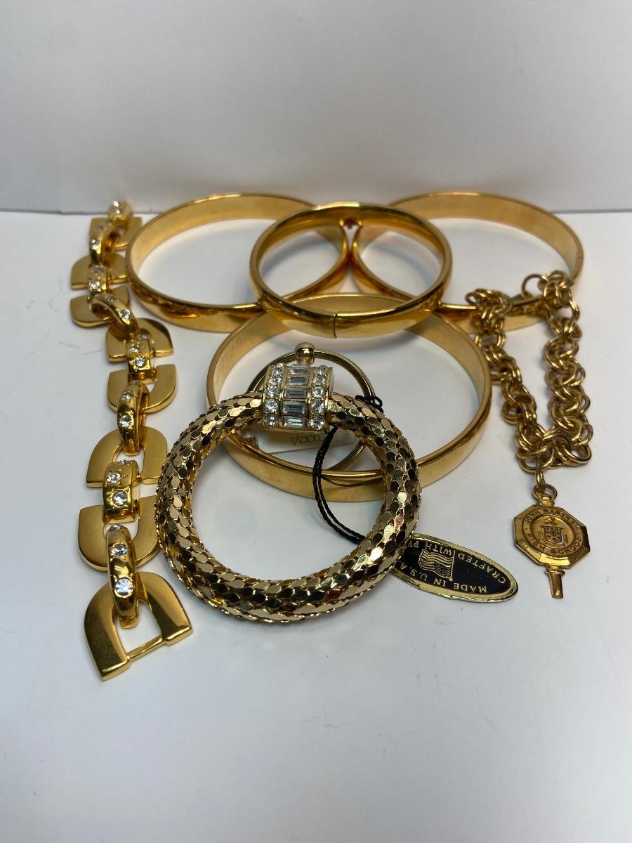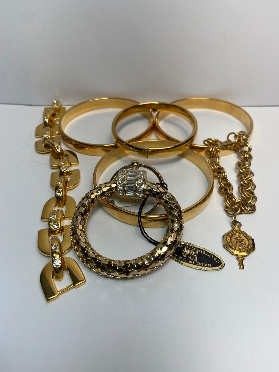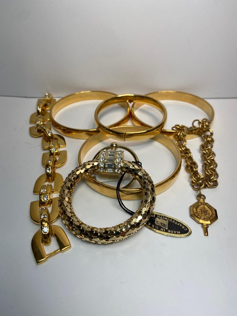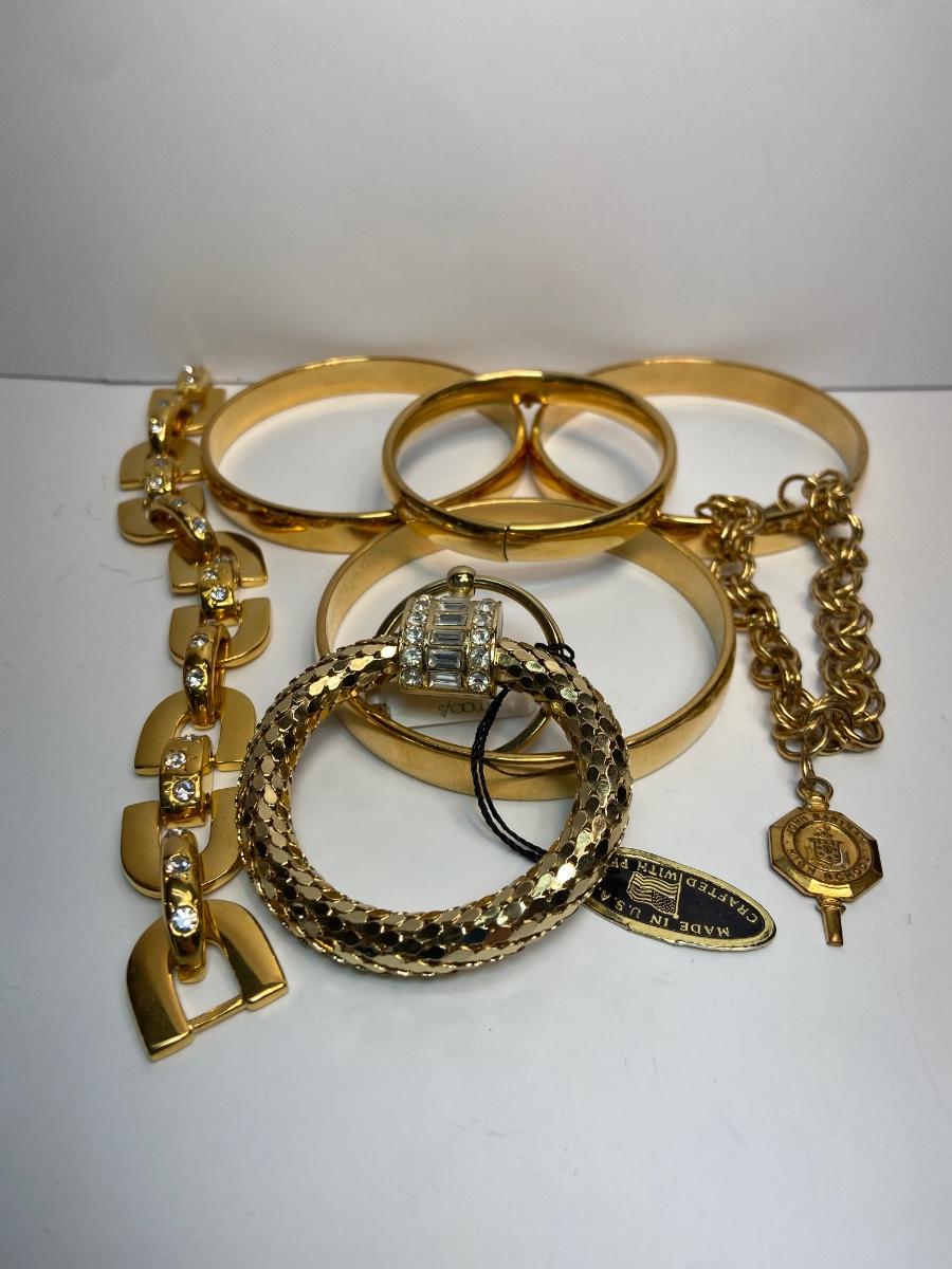 Lovely collection of gold tone Monet. Whiting & Davis bangles bracelets and keychain.