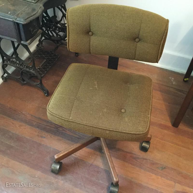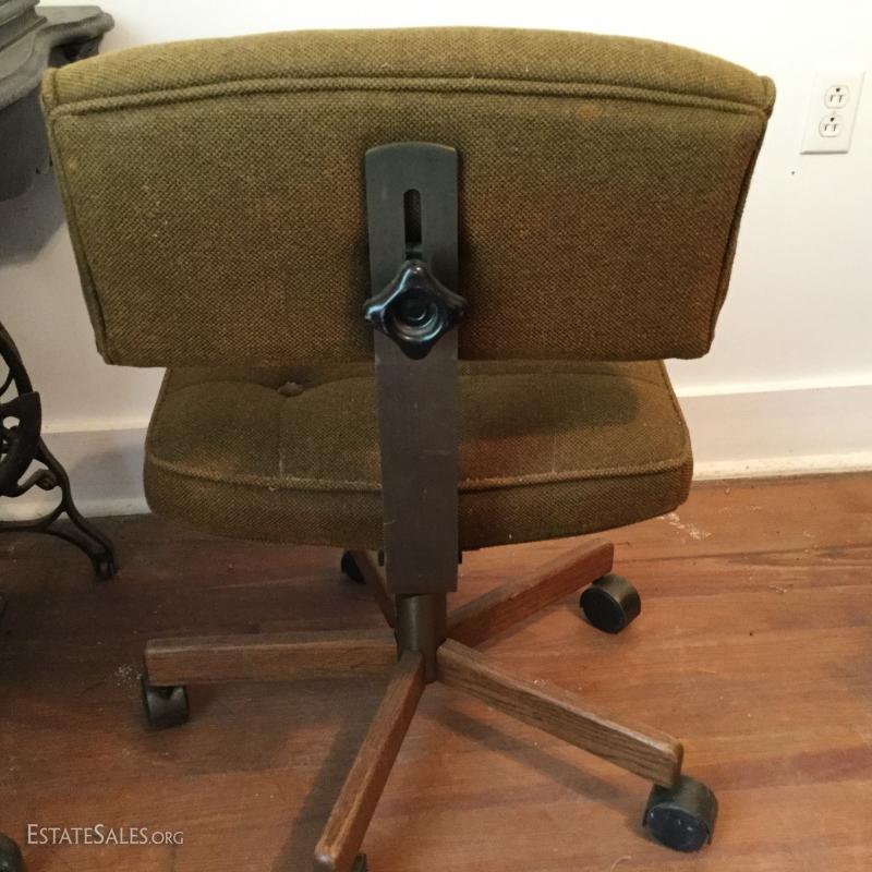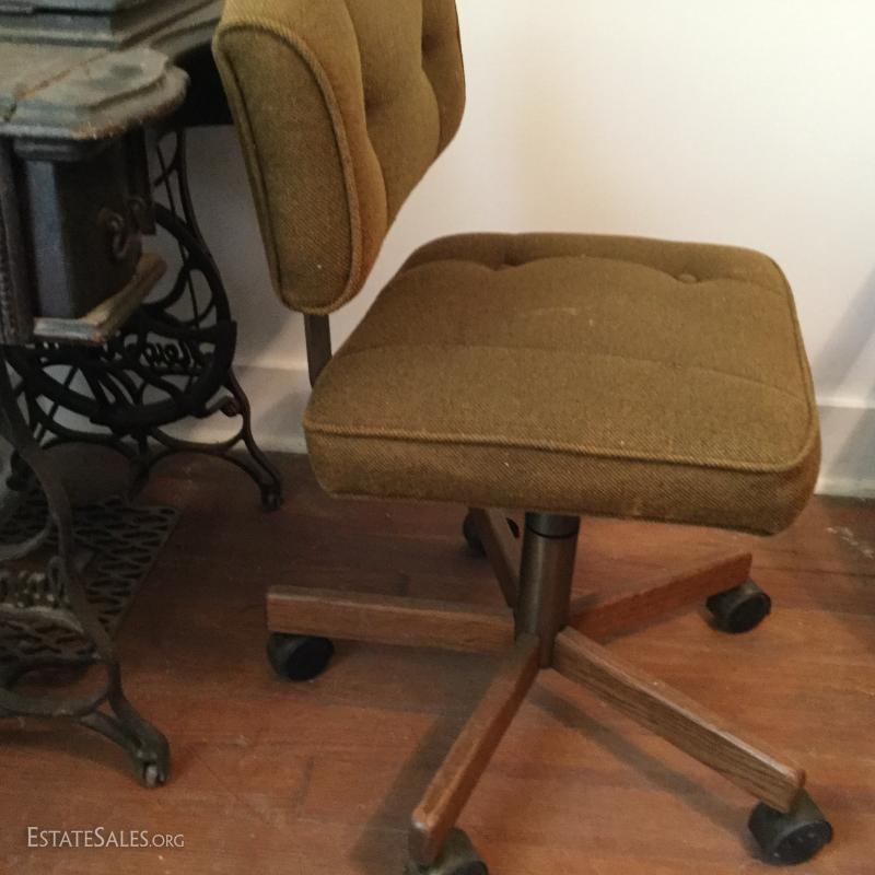 Antique Royal sewing machine in table and MCM office chair on wheels.