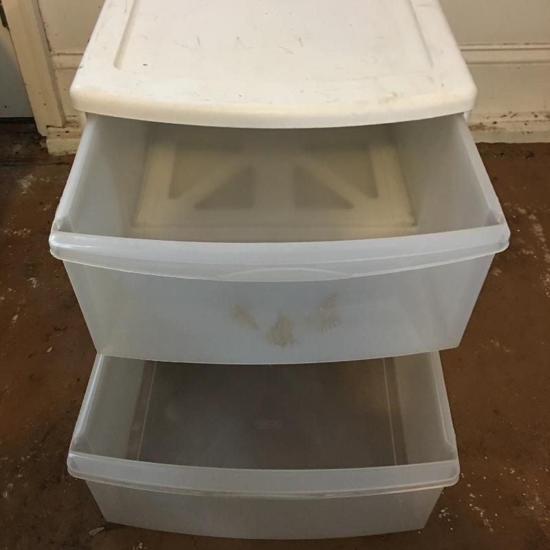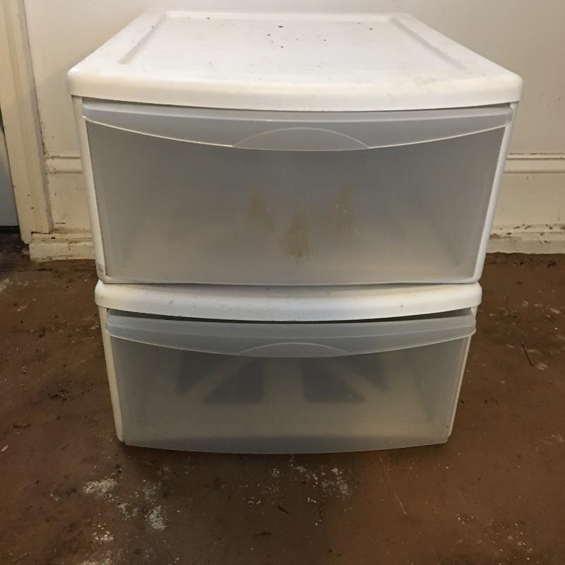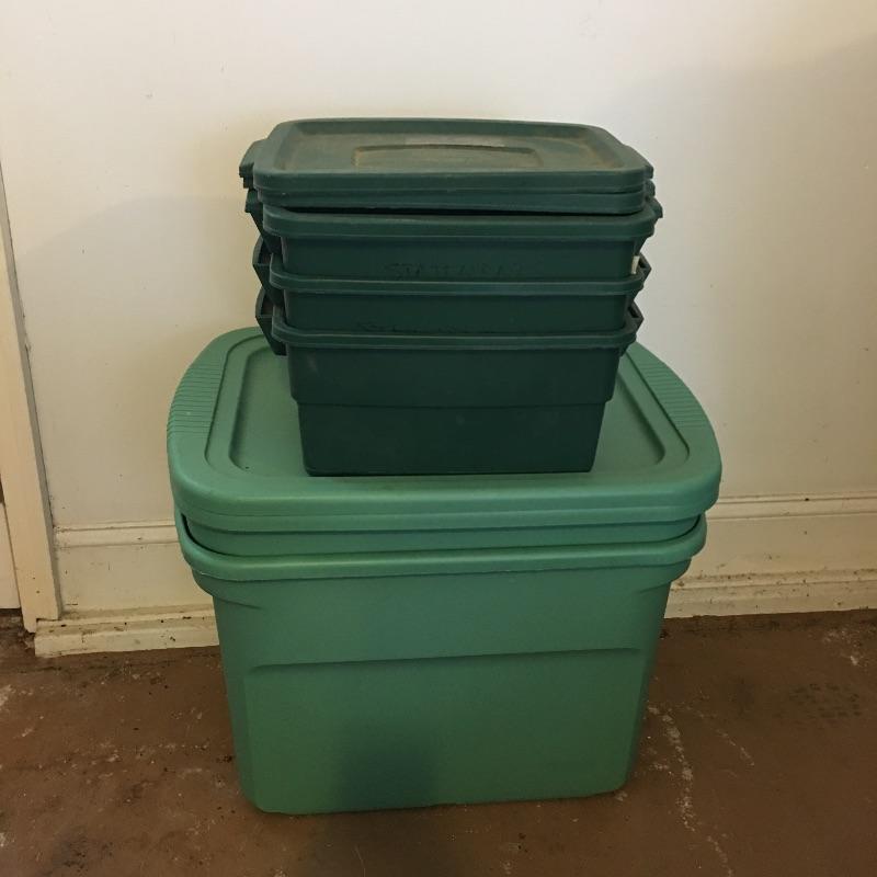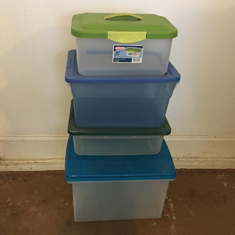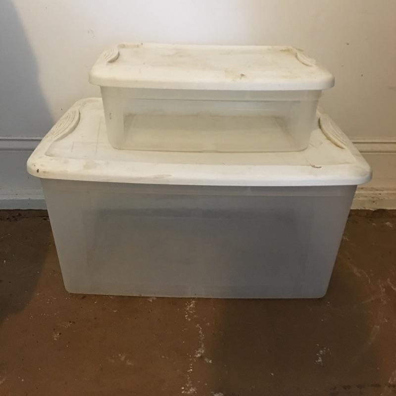 A great lot for all your storage needs. Lot includes eleven bins with lids in a variety of sizes and two boxes with drawers.