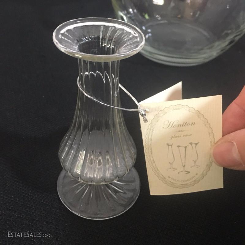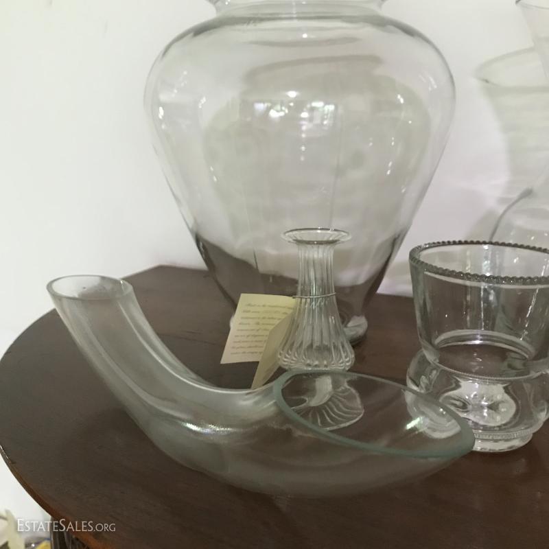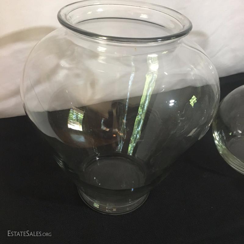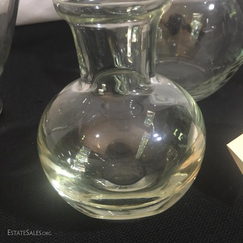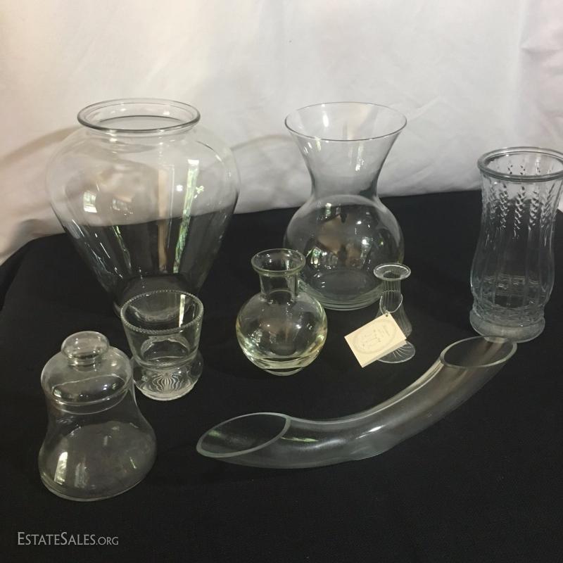8 assorted glass vases. One with top. One double sided tube like design. Largest one is 11" tall by 8"wide. Available for local pick up in Arden, NC.