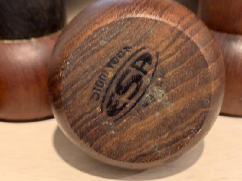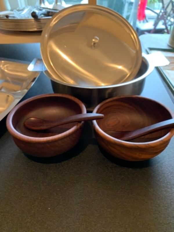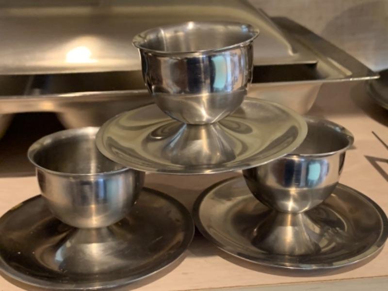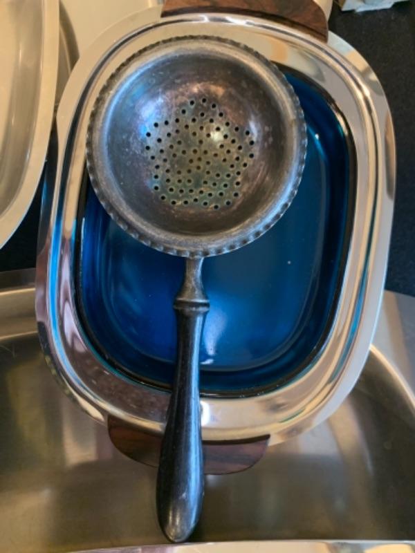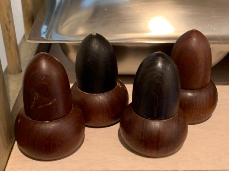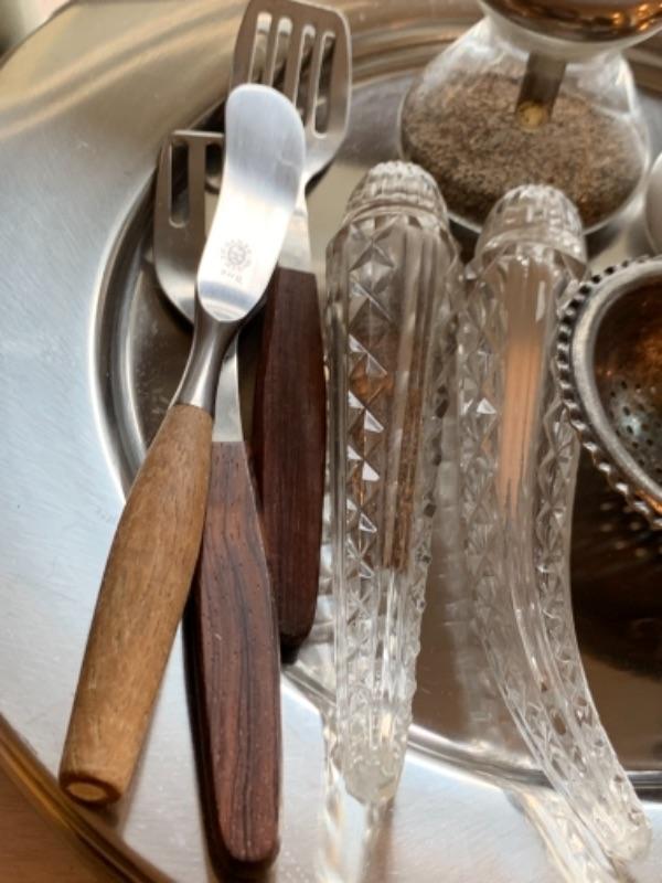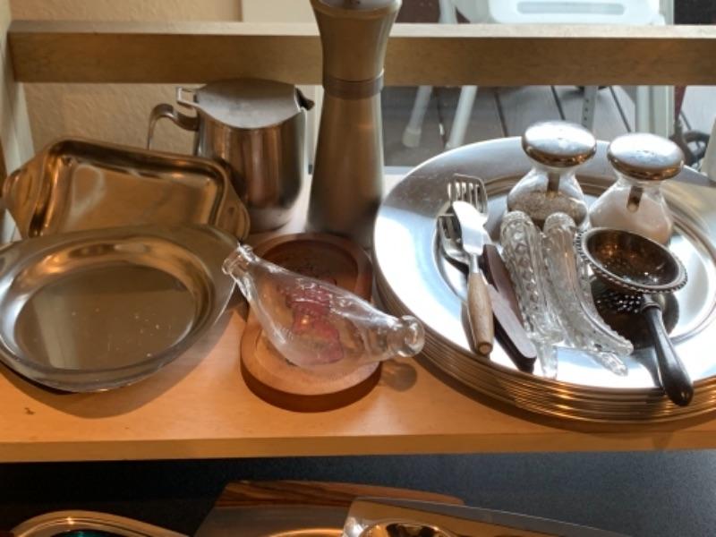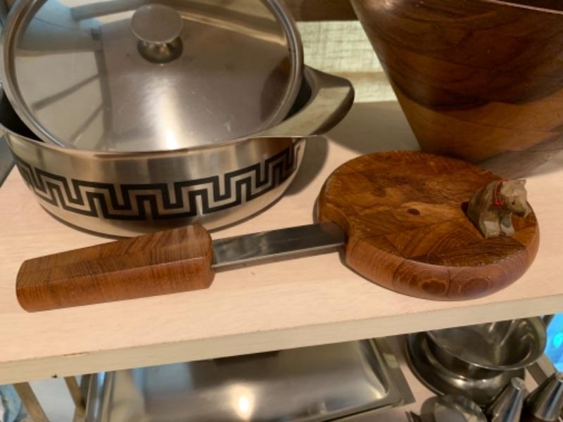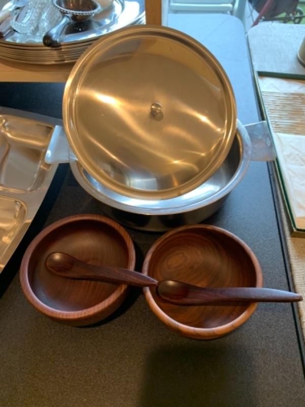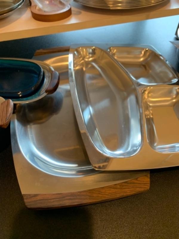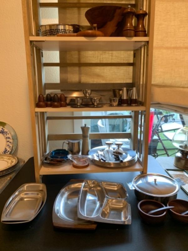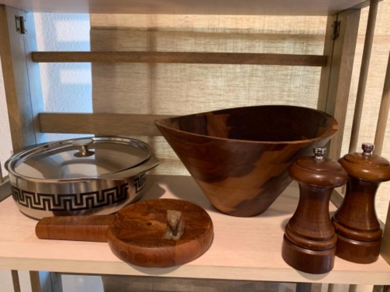 Lot 43. Assortment of mid-century wooden service pieces, stainless steel, chargers (8), wooden salad bowl, salt and pepper set with relish tray, etc.--$225