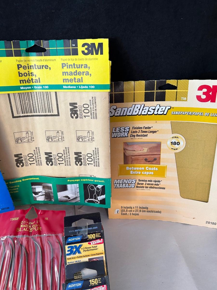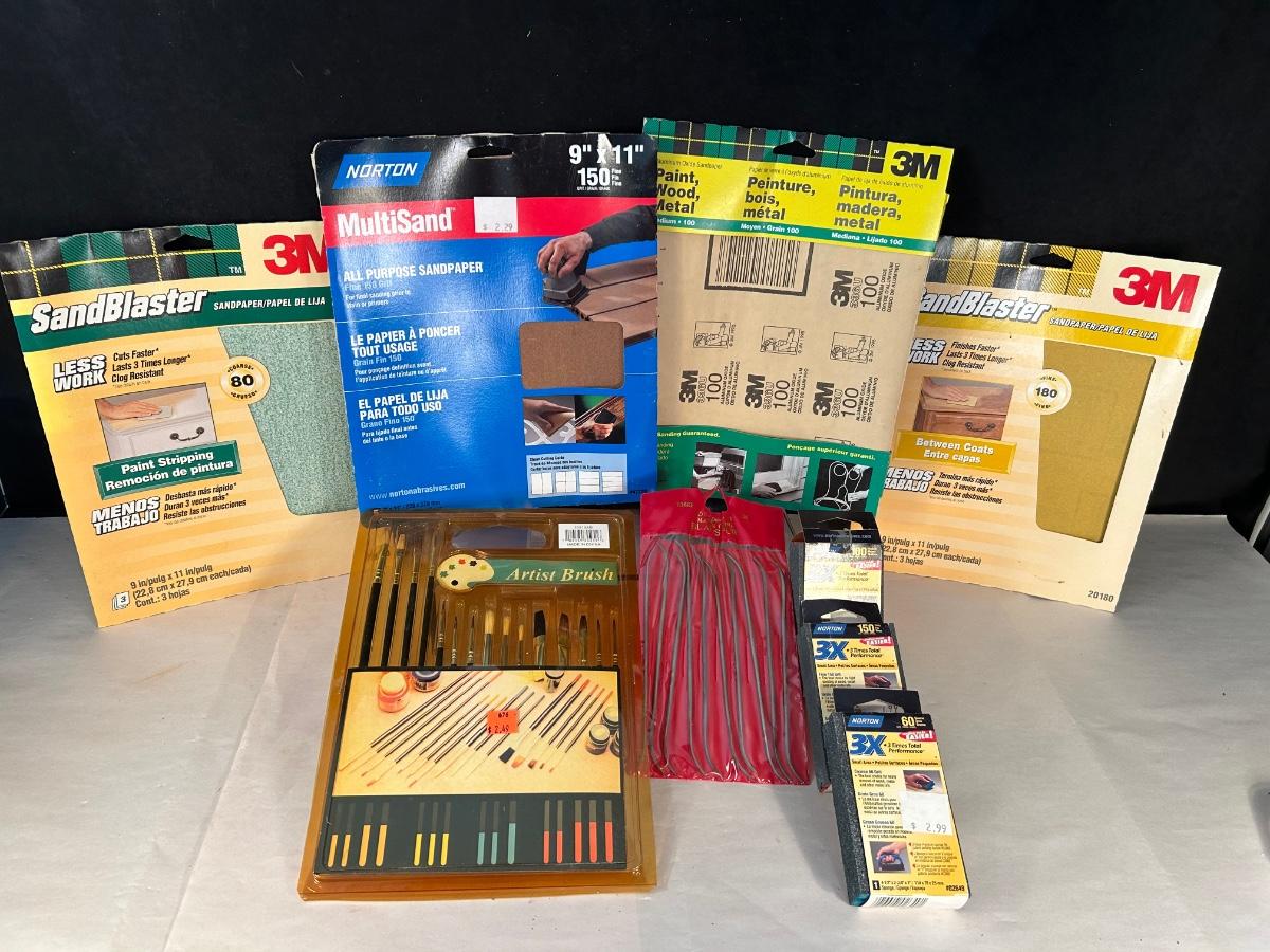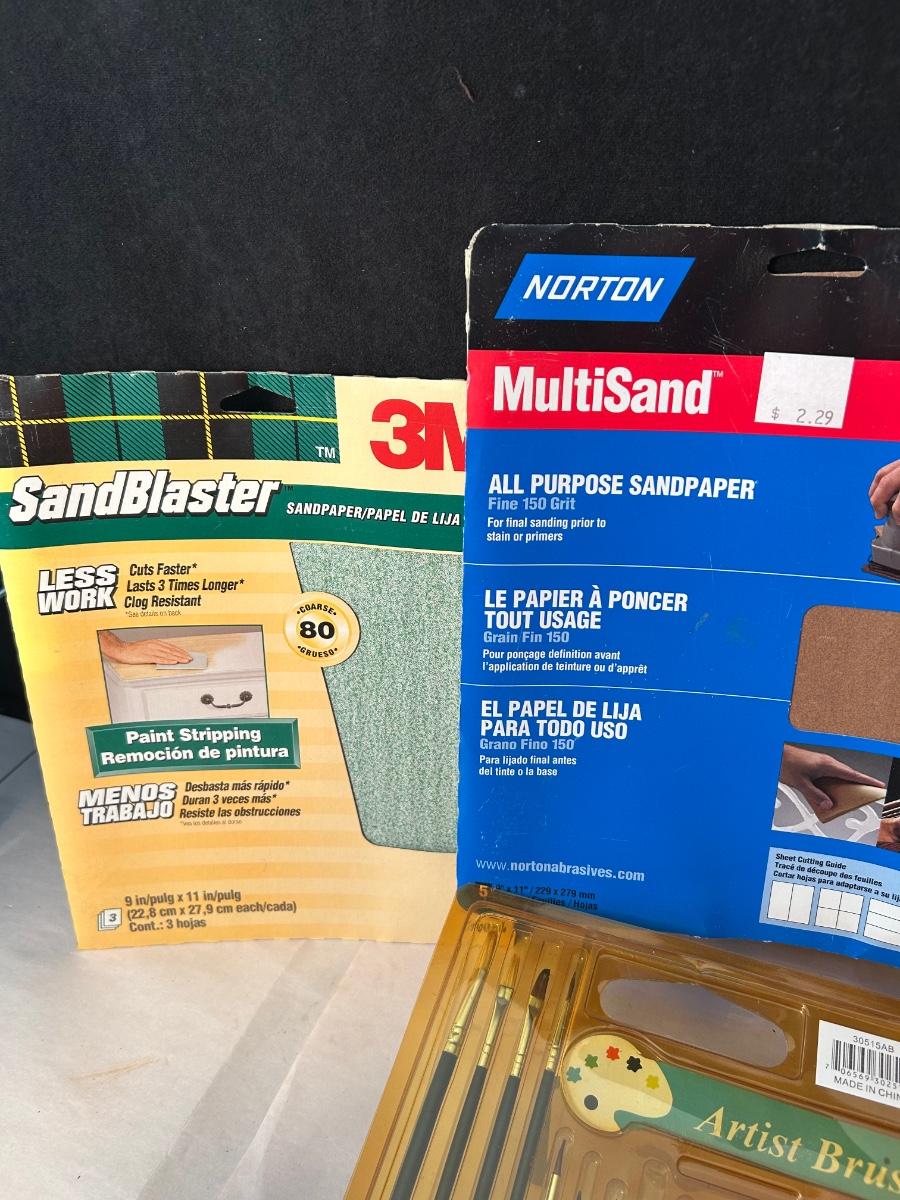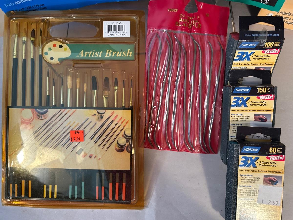 pack of artists brushes, 4 packs of sandpaper, sculpture tools and 3 sanding sponges