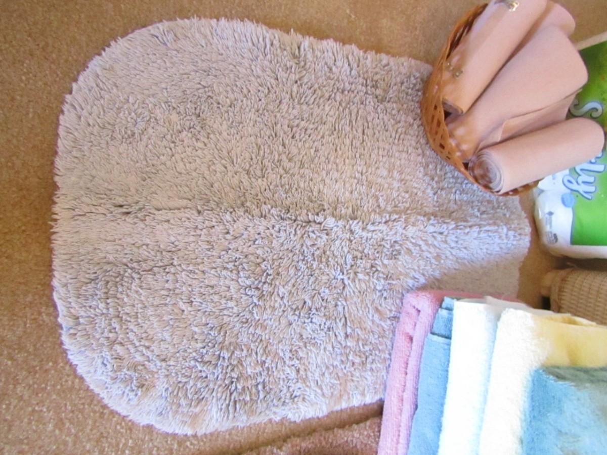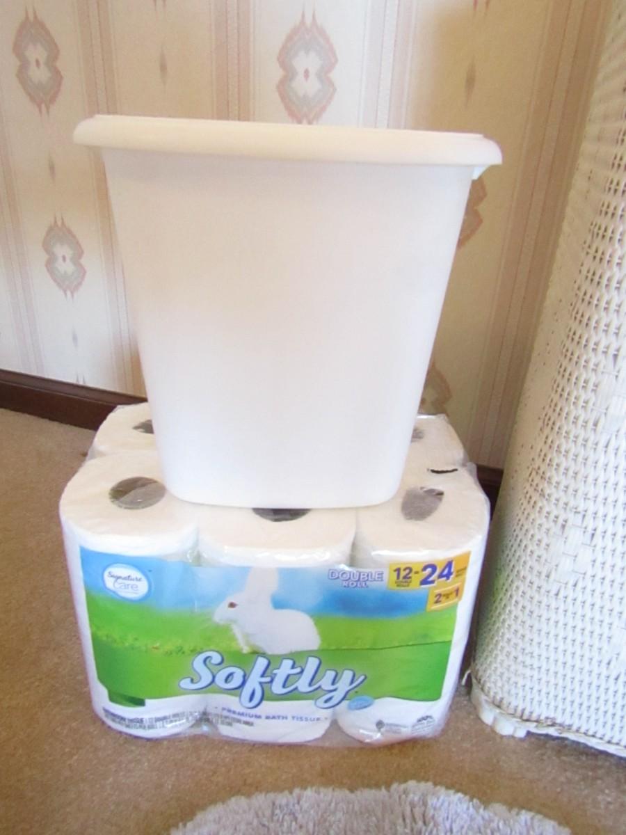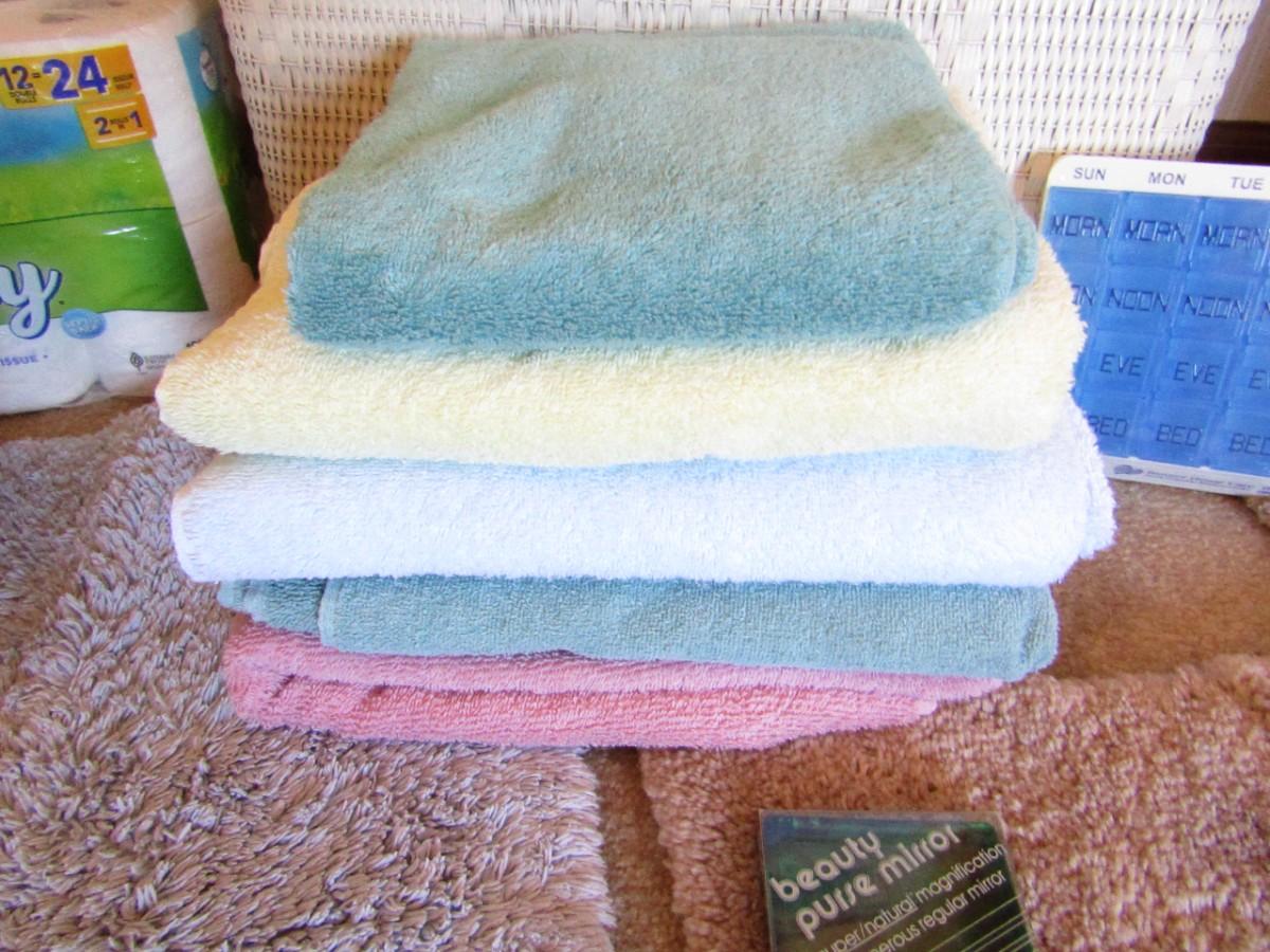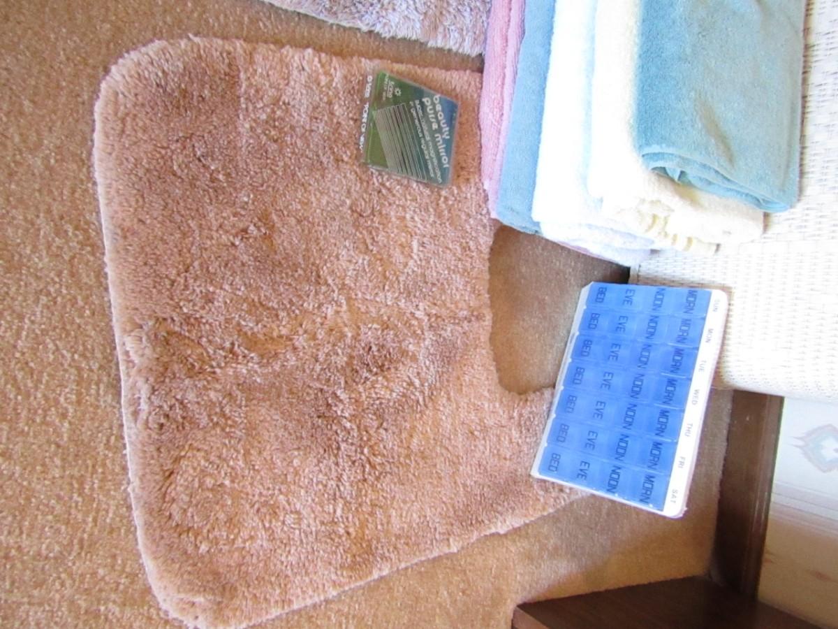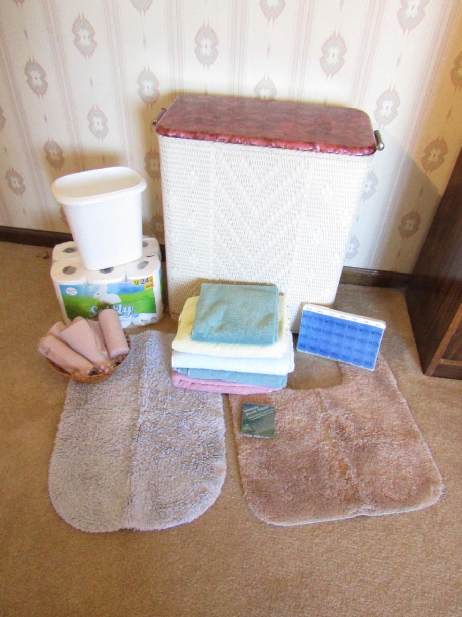 NEW 12 ROLLS OF TOILET PAPER, FEW TOWELS, BATH RUGS, NEW PILL ORGANIZER, ACE BANDAGES AND A WASTE CAN