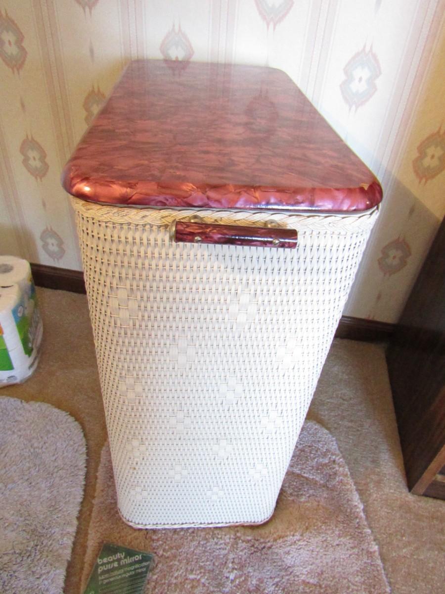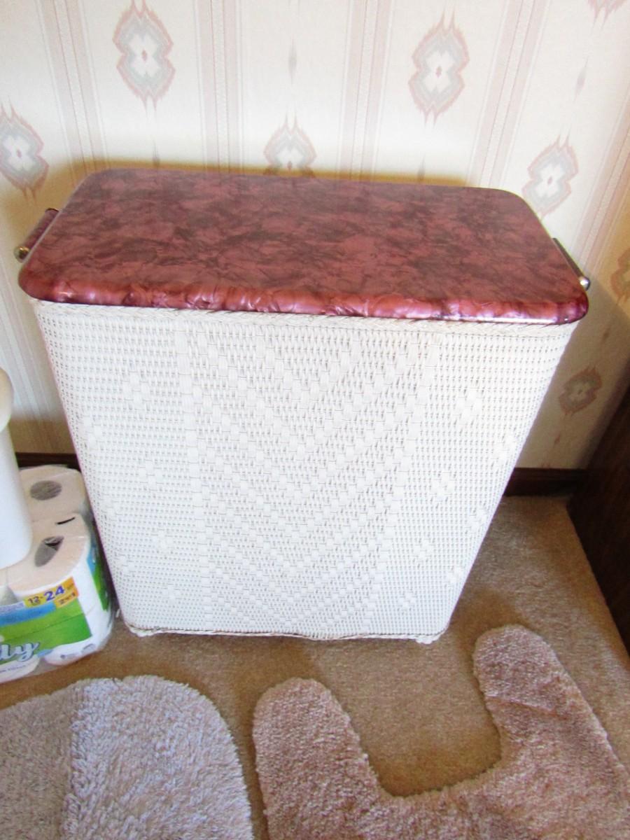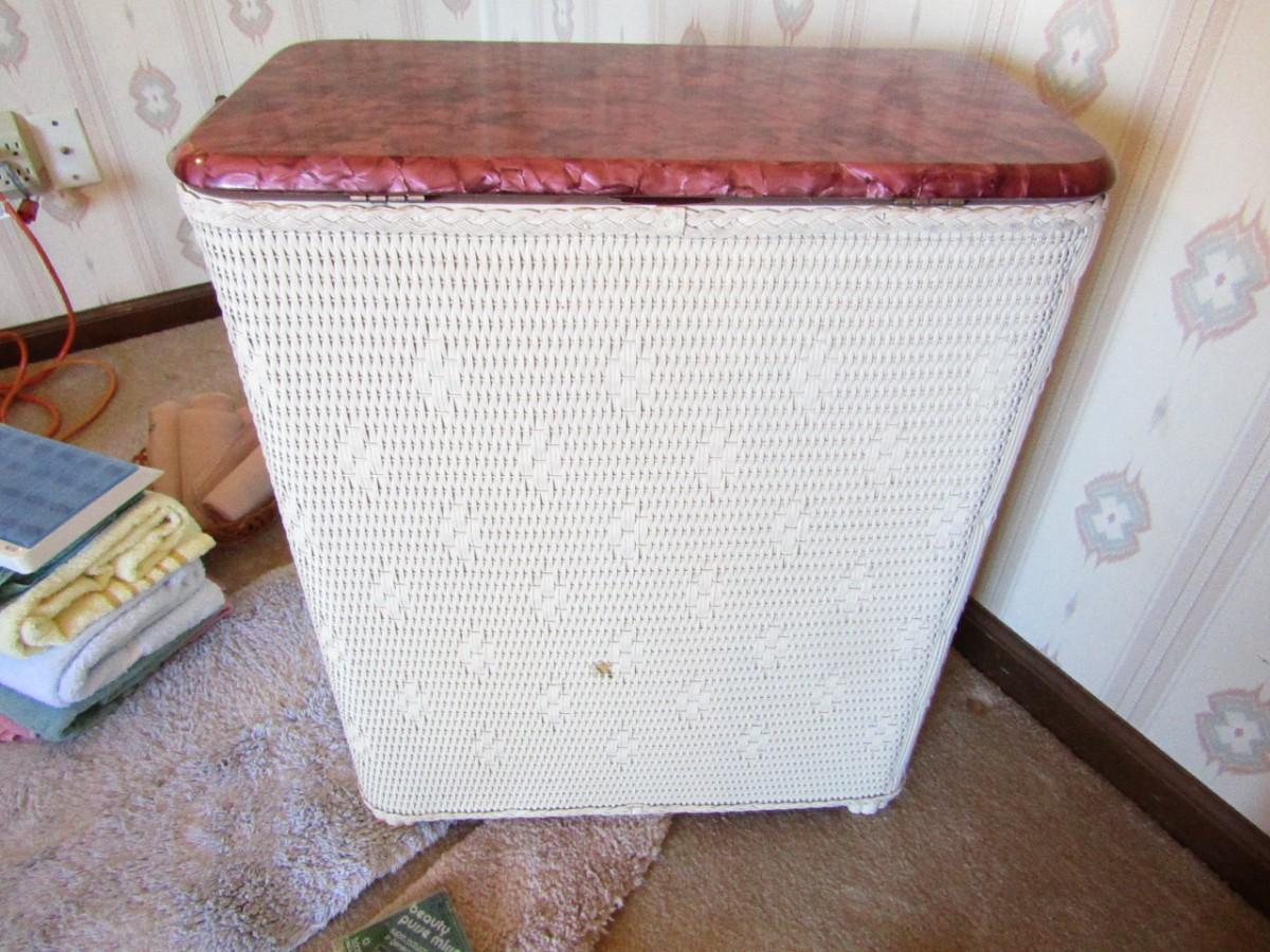 WICKER CLOTHES HAMPER WITH HARDTOP, IT HAS A SMALL TEAR ON THE BACKSIDE (SEE PIC)