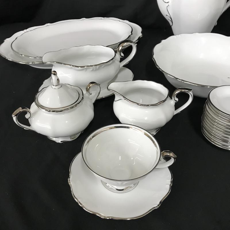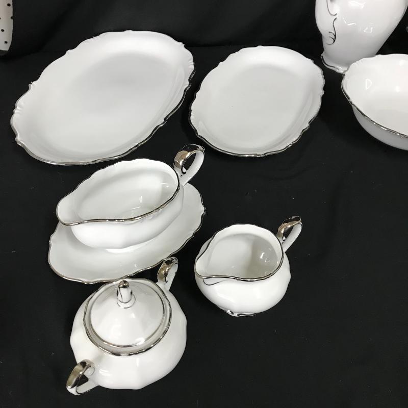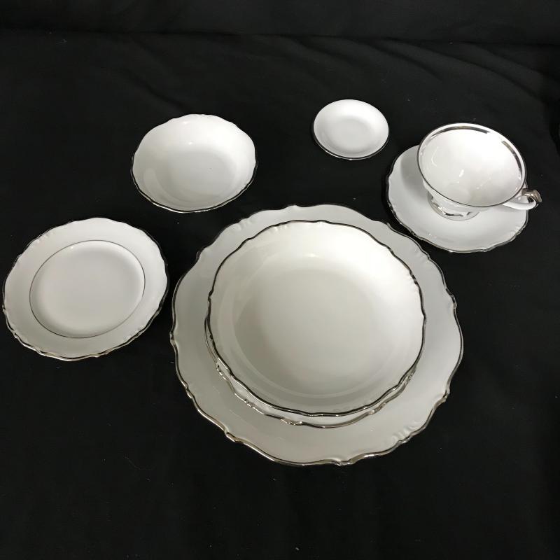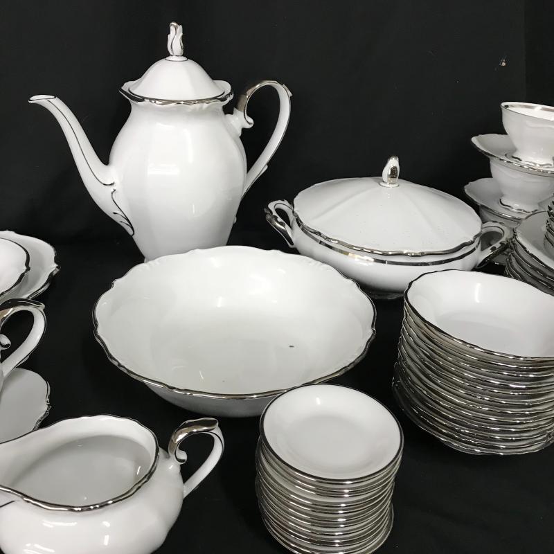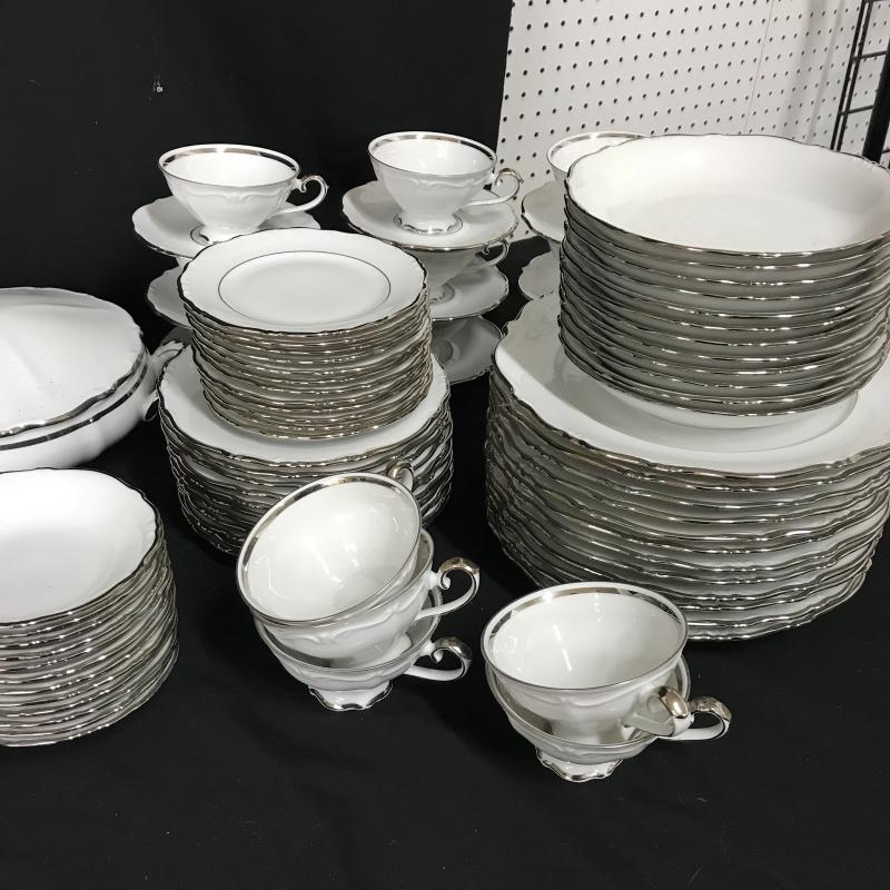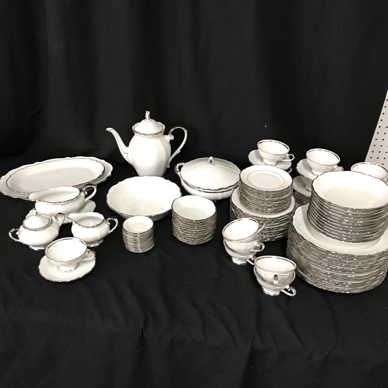 8-piece place setting includes 10 full place settings and 8 serving pieces. Elegant but refined china set. Includes several extra pieces totaling 107 pieces including lids. Lot is available for local pick up in Maggie Valley, NC only.