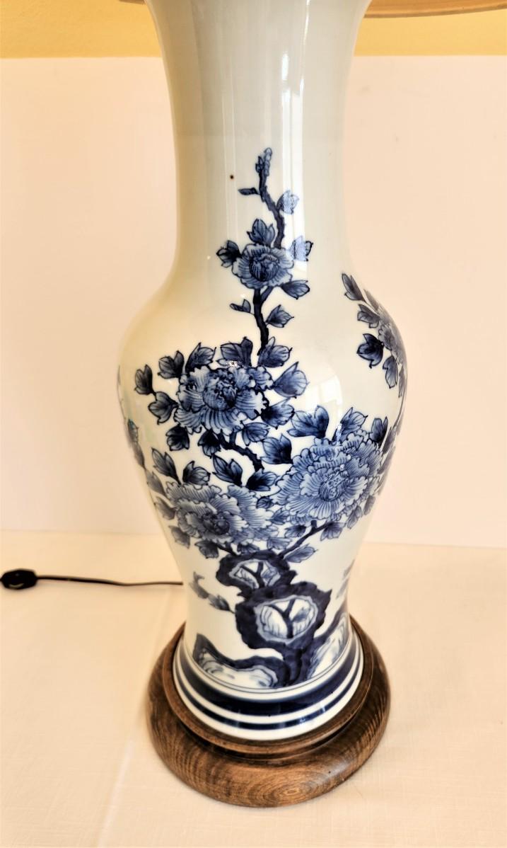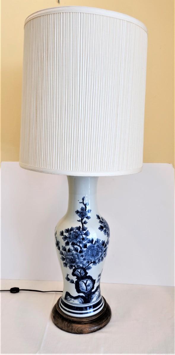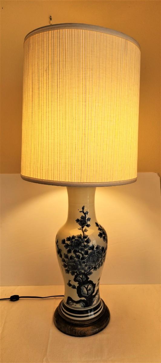 Pretty blue/white Asian style table lamp on wooden base - switch on cord, 2 bulbs. 36" tall - good condition, works.