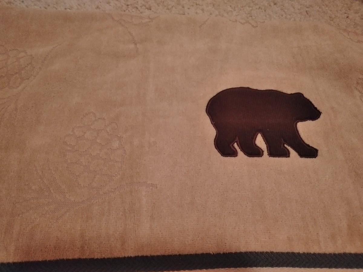 HOME BRAND BROWN BEAR BATHROOM TOWELS, WITH MATCHING TRASH CANS, ALSO ELK. CAMO SHOWER CURTAIN, NEW IN PACKAGE PINECONE SHOWER CURTAIN HOOKS, PINECONE LOTION DISPENSER, AND BROWN BEAR SOAP DISPENSER.