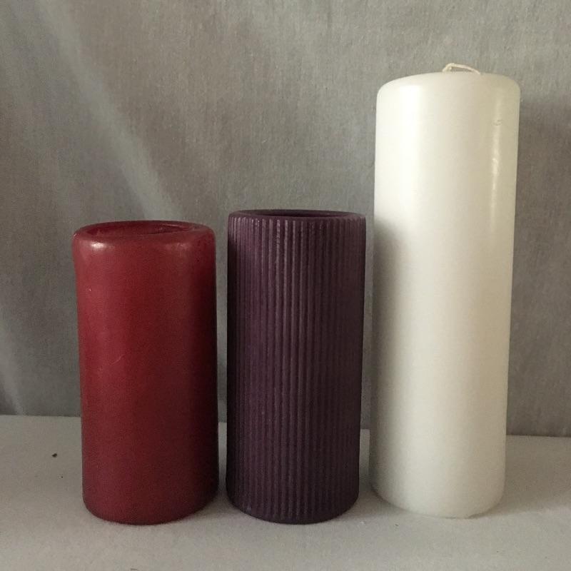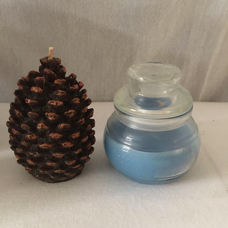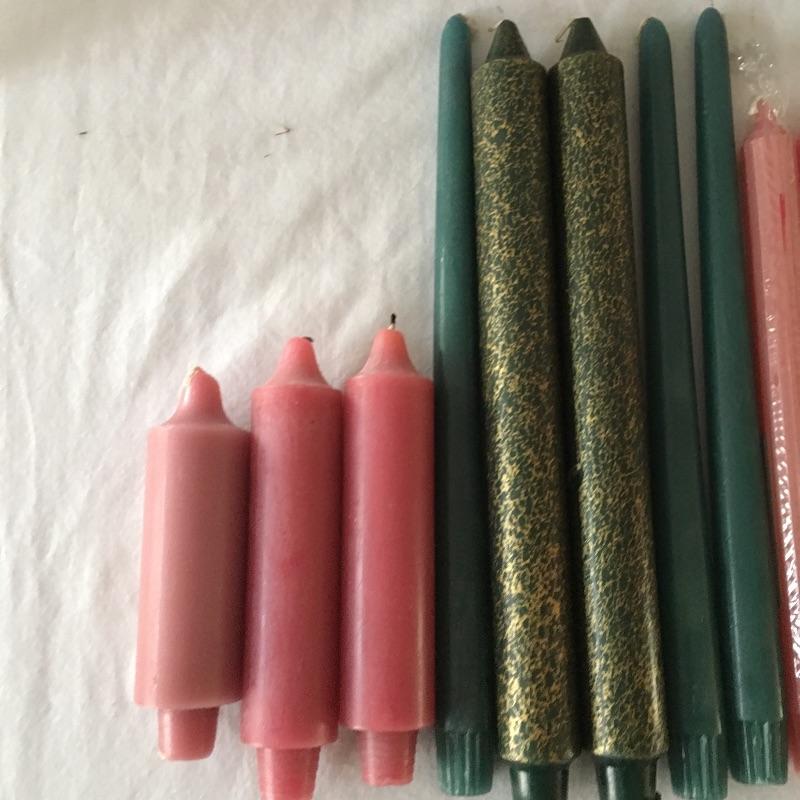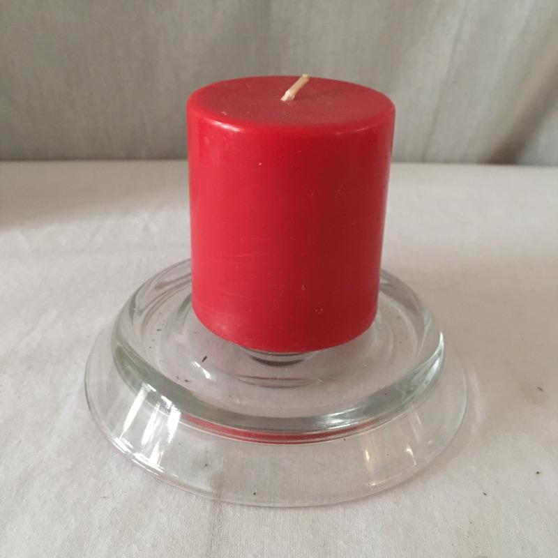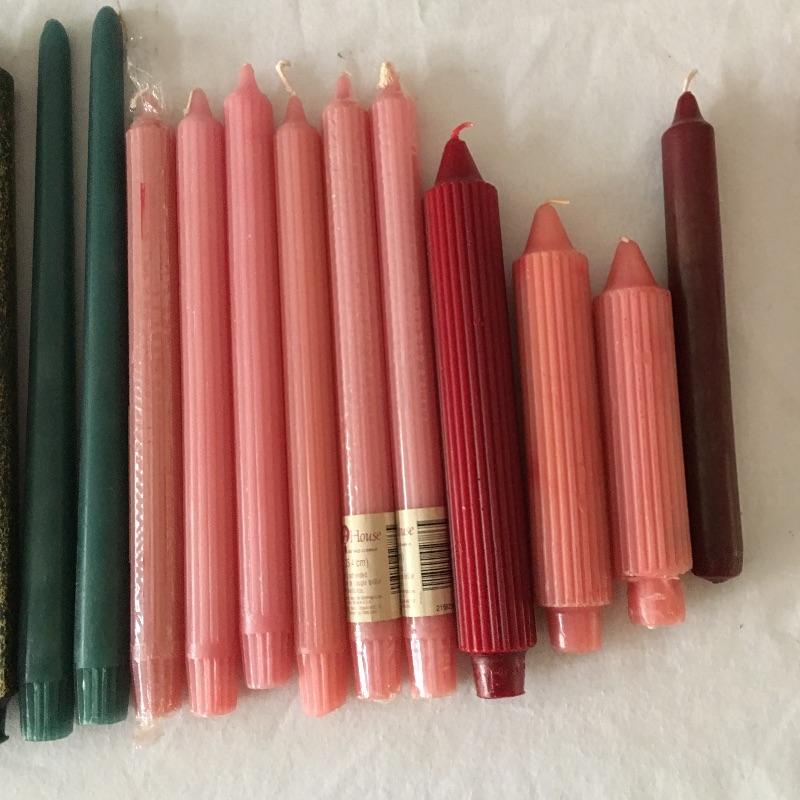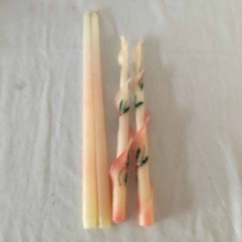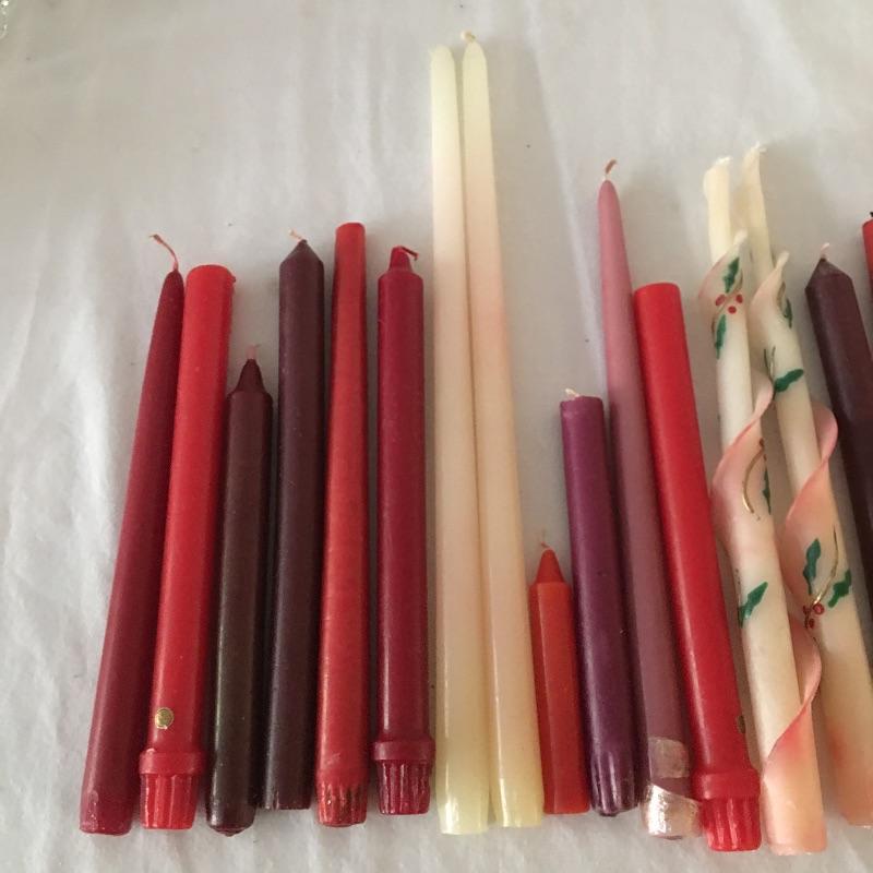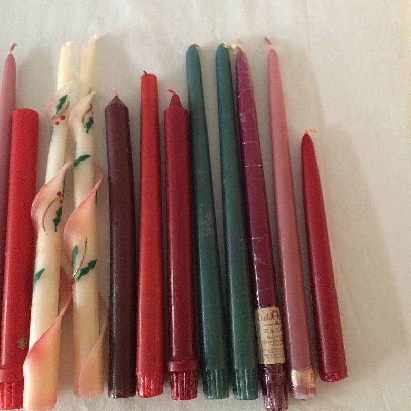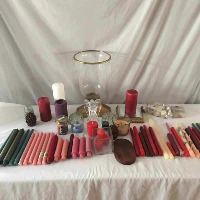 Candles, Candles, Candles includes a plethora of tapered candles, tea lights, candles in glass, large glass and brass candle holder, angel candle holder and more. Light up your life with this large array of candles. Glass and brass holder measures 15.5” tall.