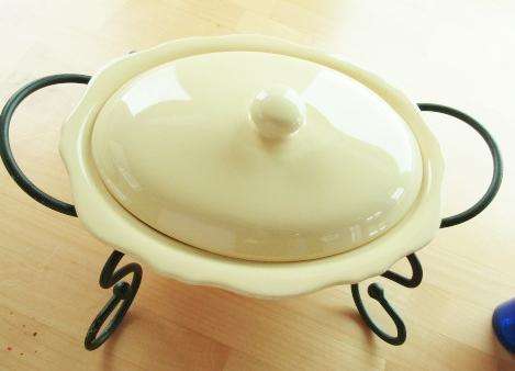 NICE CERAMIC DISH WITH IRON HOLDER. OVEN AND MICROWAVE SAFE. MEASURES 10.5 X 8.5. ALSO 2 PC BLUE PLASTIC SALT SHAKER AND PEPPER MILL .. . 4 PIECES TOTAL. CERAMIC DISH DESIGNED BY HOSPITALITY