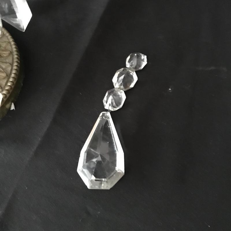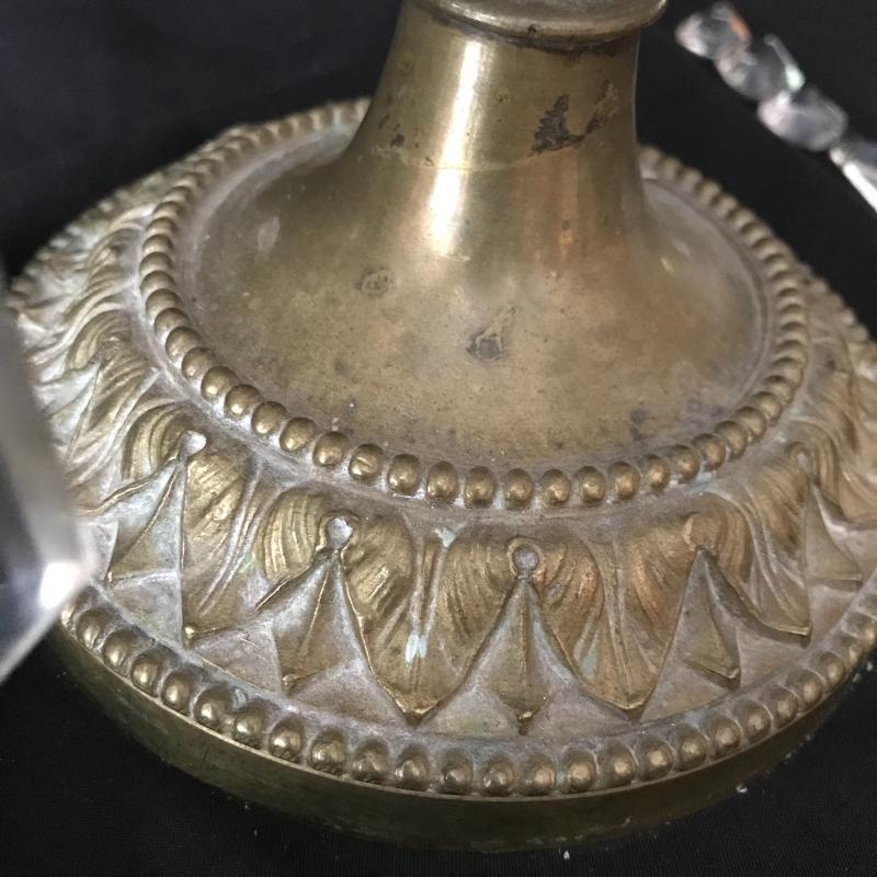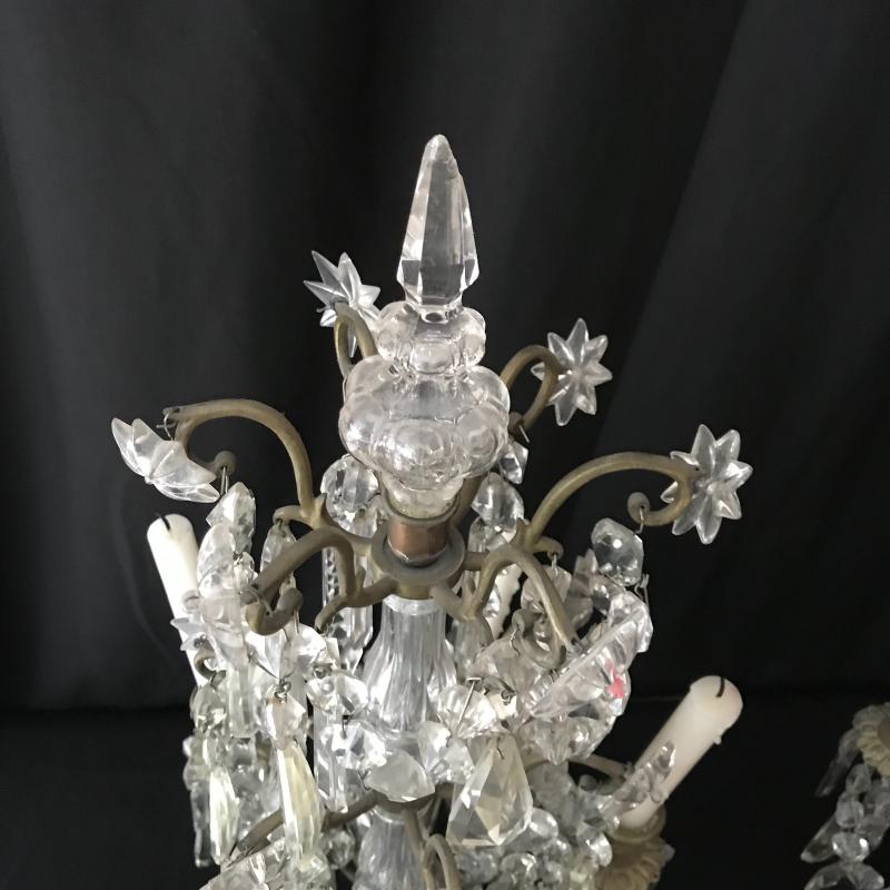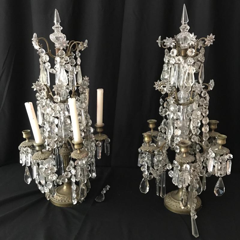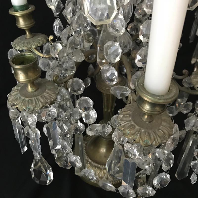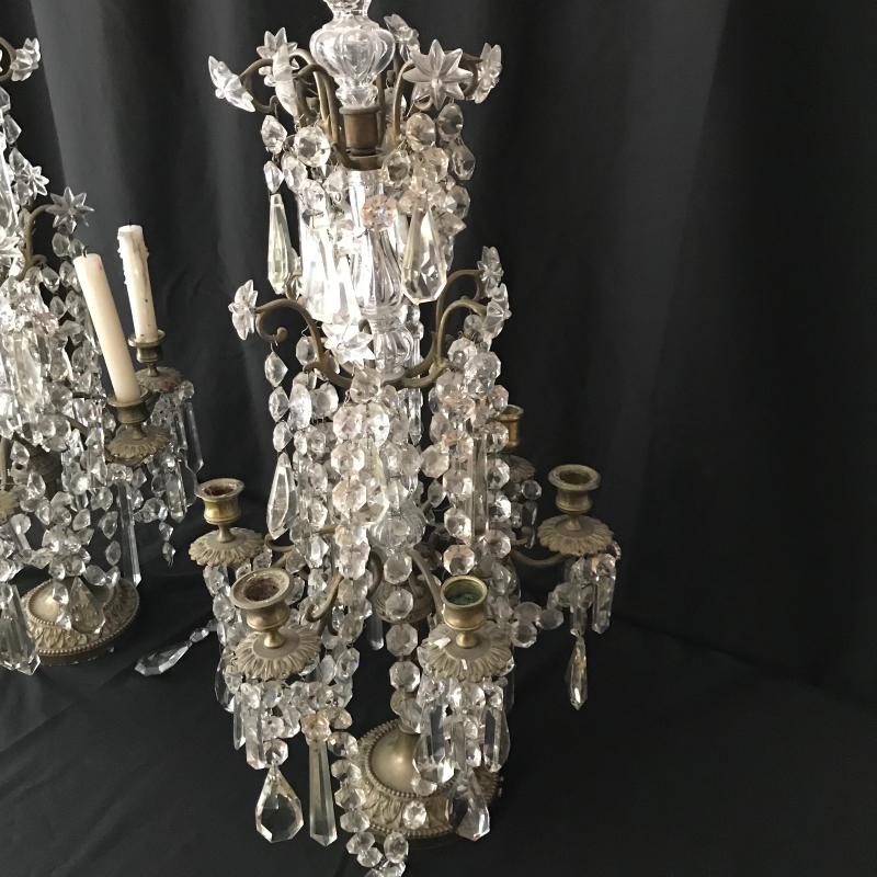 Two impressive statement brass candelabras covered in hanging crystals. At least one piece has separated, but appears to be a simple fix. Pieces are very heavy and measure approx. 13” x 27.75”. No shipping.