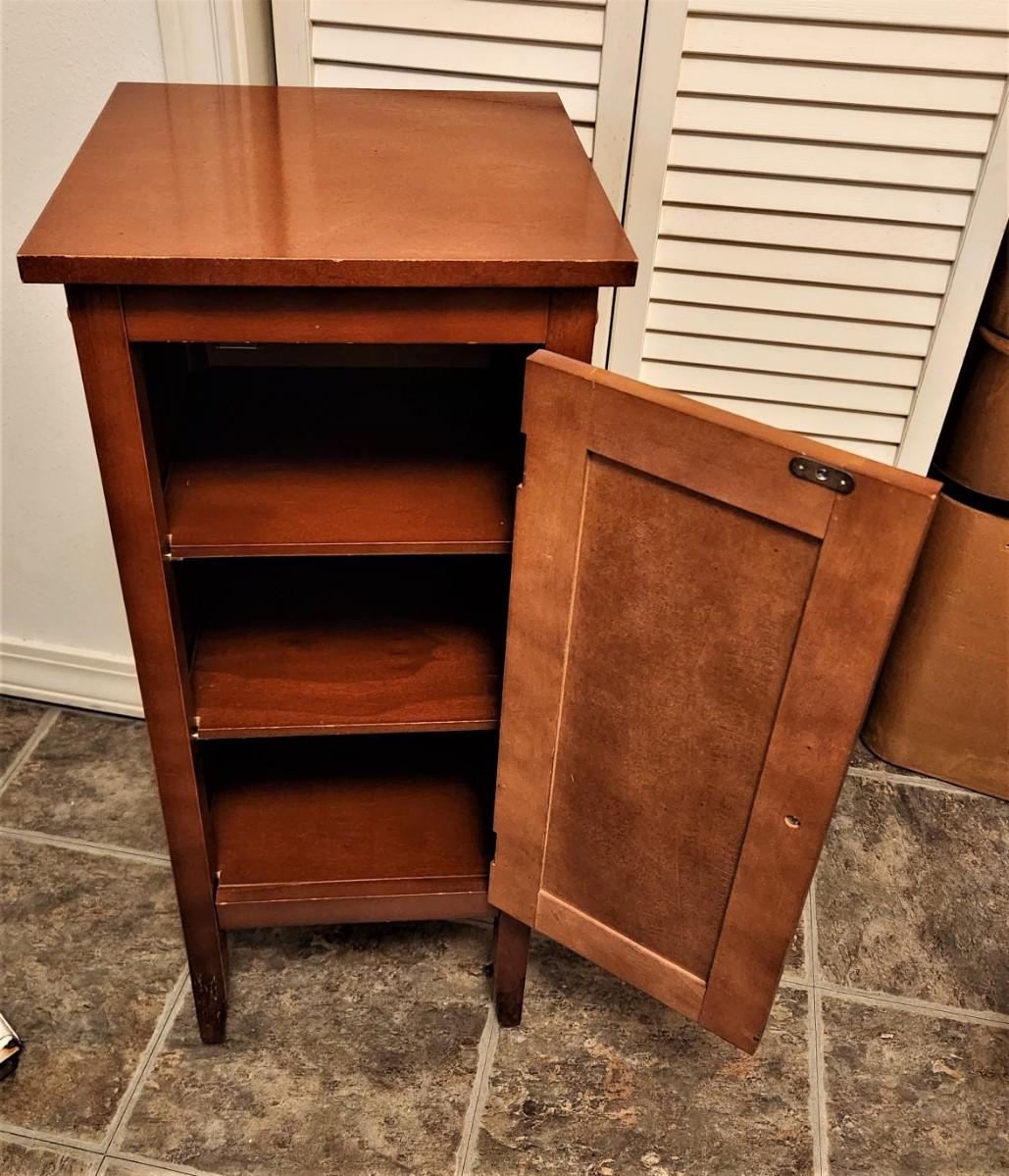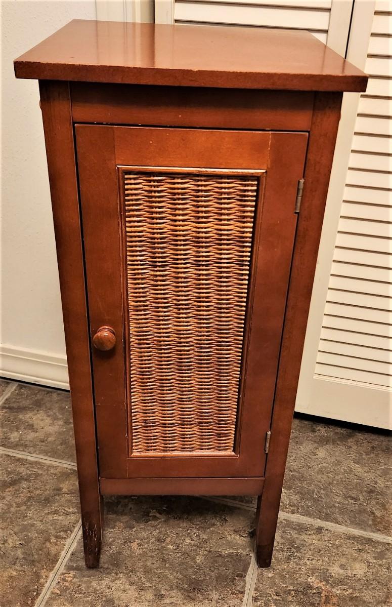 Contemporary cabinet with rattan accents, 3 shelves, good used condition. 13" across, 30.5" tall, 13" deep.