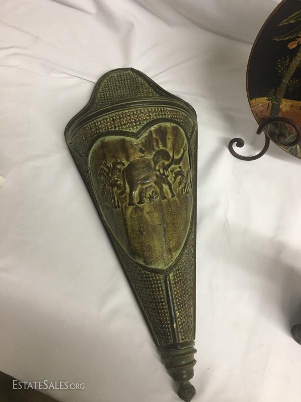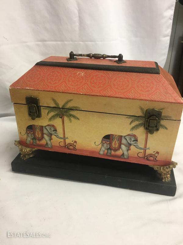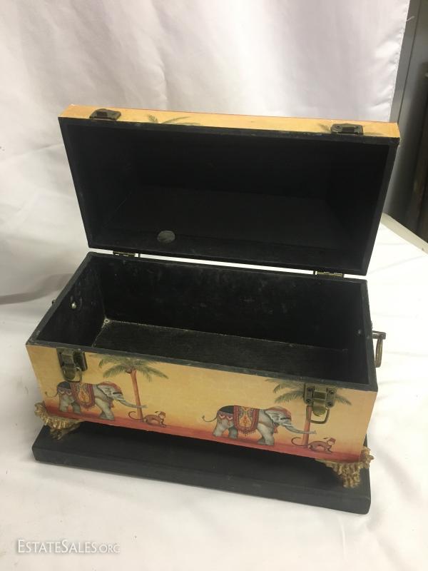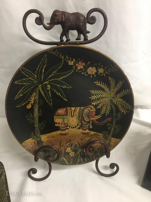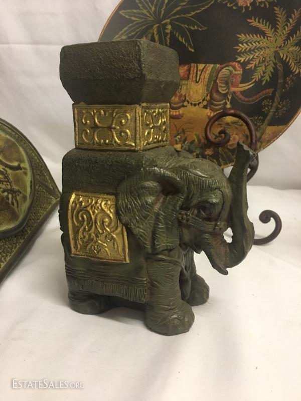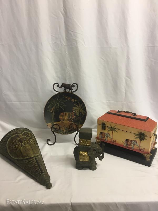 4 cute elephant decor items. Wood wall hanging vase-style item. Measures 22" long. Decorative plate with stand. Stands approx. 15" tall. Heavy cast elephant of man-made materials, stands 7.5" tall. Decorative wood box measures 13" x 7". This lot is available for shipping or local pick up in Waynesville, NC.