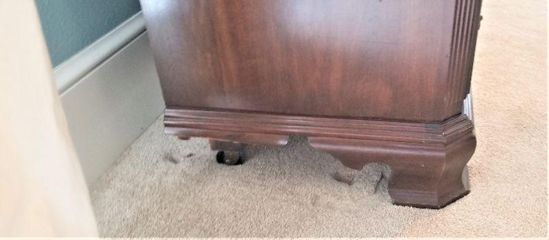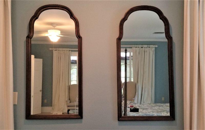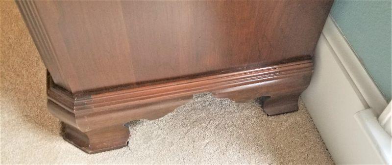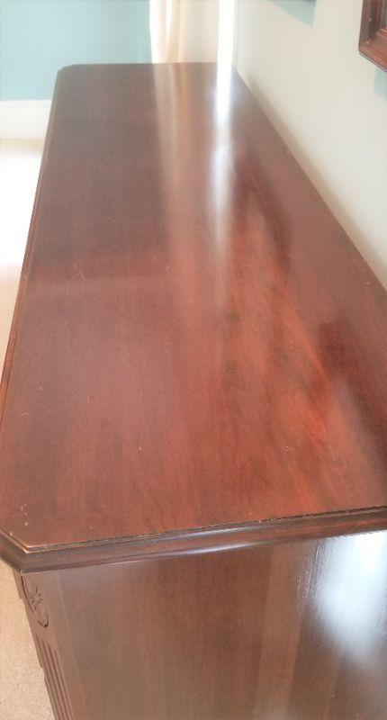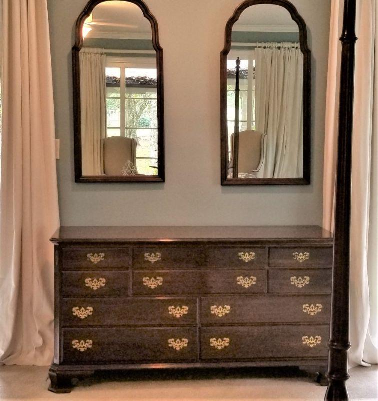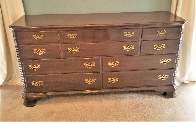 Classic Ethan Allen dresser with two wall mirrors. 10 drawers - used condition. Note: back left trim has come off. We HAVE it, but it needs to be reattached - see photos. Leg is ok - it's just the trim. Easy repair. Some scratching to the top of the dresser. We are pricing this low to sell. Brass hardware, solid construction. 65.5" across, 20.25" deep, 34" tall. The mirrors look good. They are each 47" tall and 22.5" across.