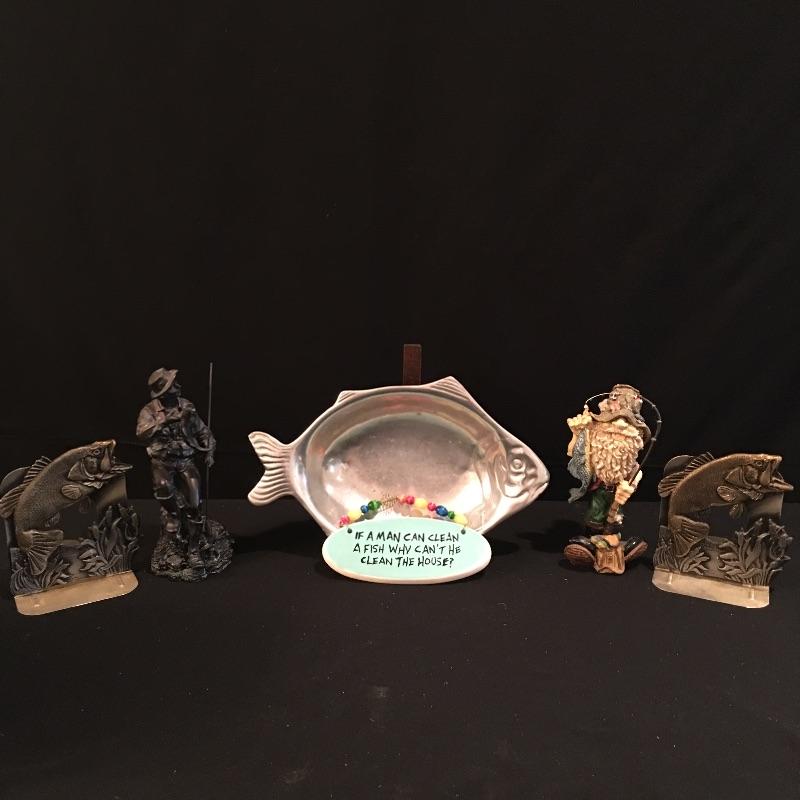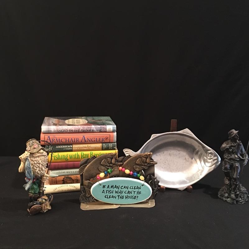 All you anglers out there will love this collection of fisherman’s decor that includes pewter fish dish, pair of fish bookends, fishing sign, two resin fishing figurines and eight books on fishing.