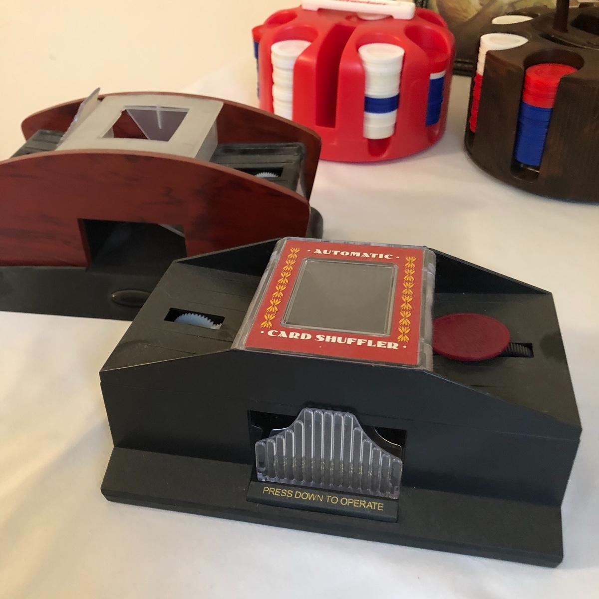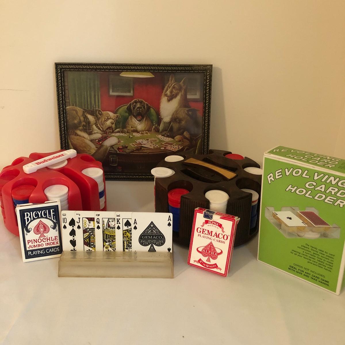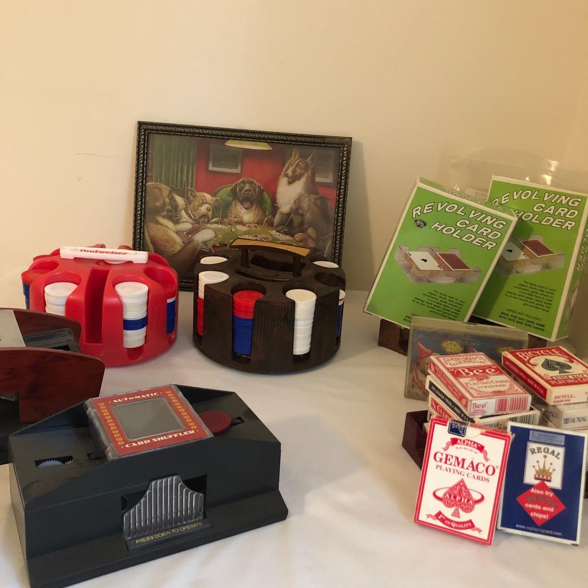 All you need for a fun night playing poker with friends. This all inclusive lot includes 10 plus packs of cards, 2 chip holders full of chips, 2 revolving card holders and much more.