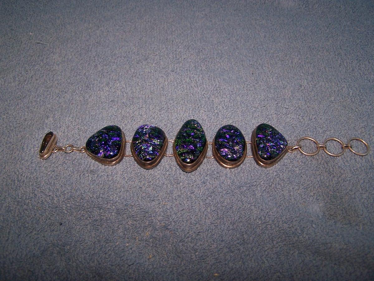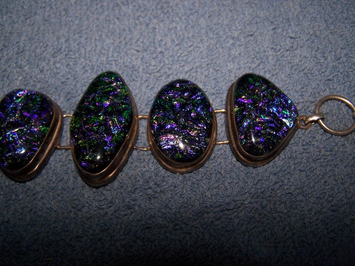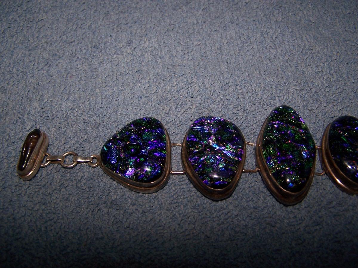 THIS IS A GORGEOUS LARGE STERLING & DICROHIC ART GLASS BRACELET!!! MARKED.. IT IS 1 5/8'' WIDE X 9'' LONG. 78.93 GR TW.. LIGHT WEAR..