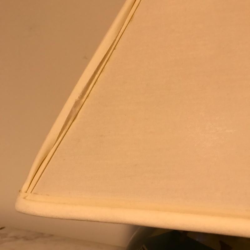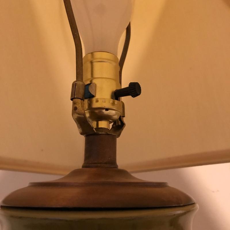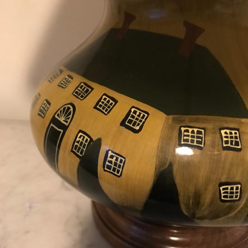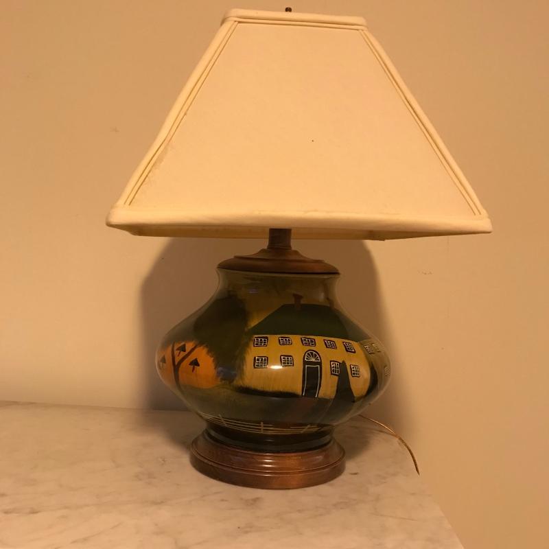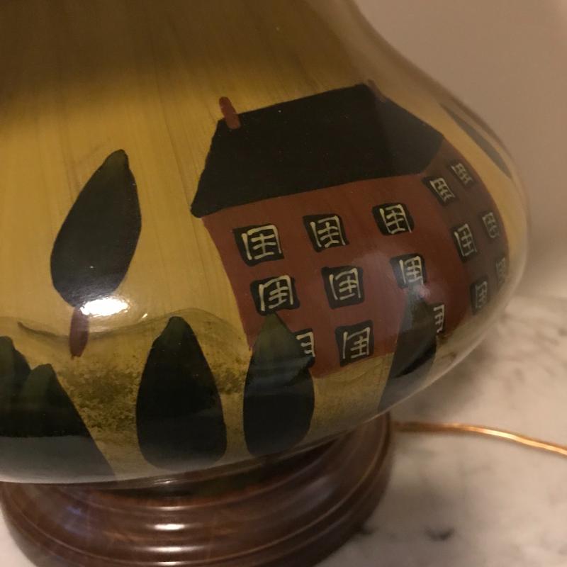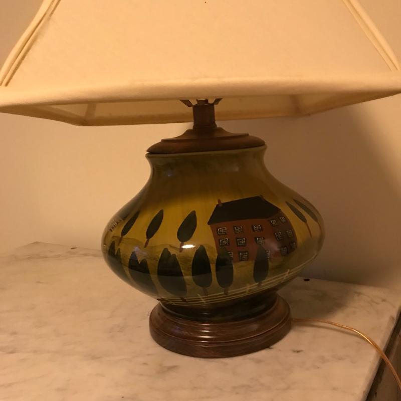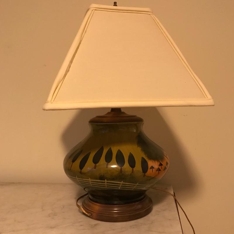 This sweet hand-painted lamp of folk art style will bring charm and whimsy to any room. 20” tall. Lampshade in decent shape, though could use a little fabric glue to secure in a few places.