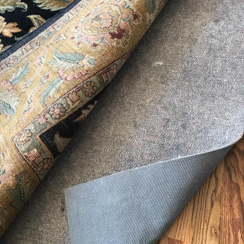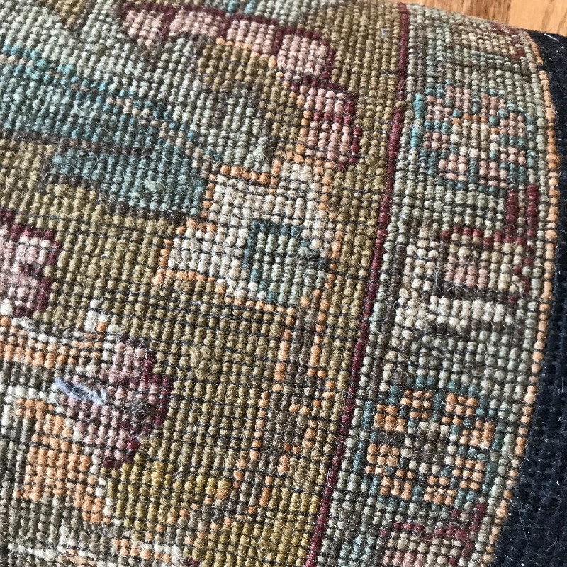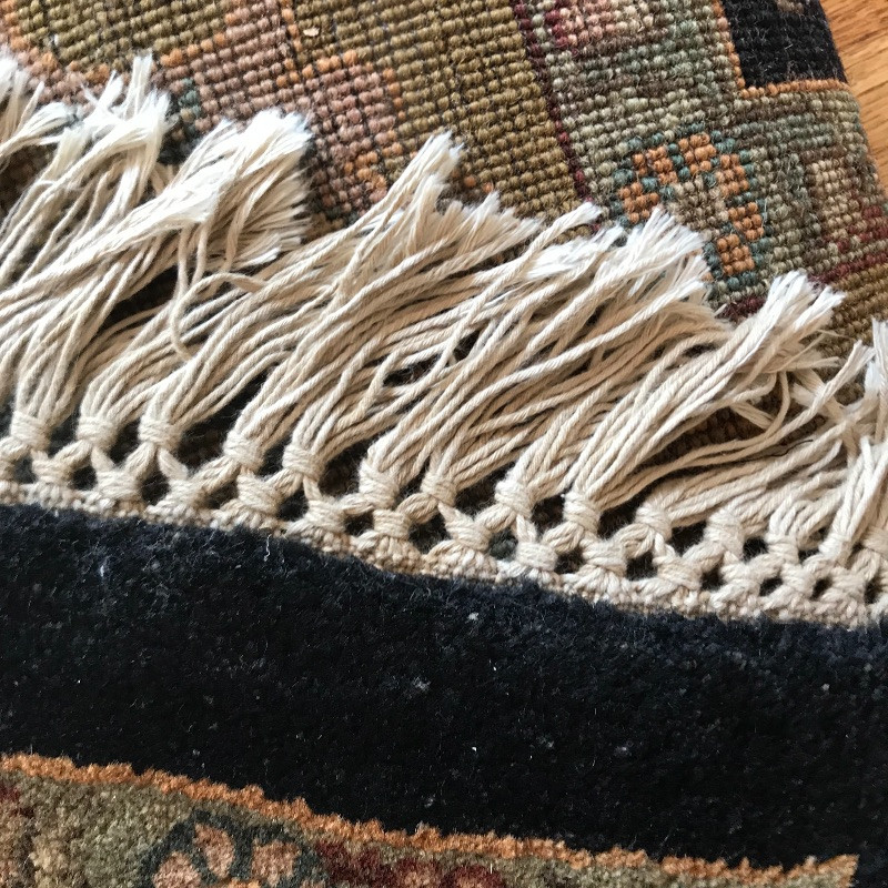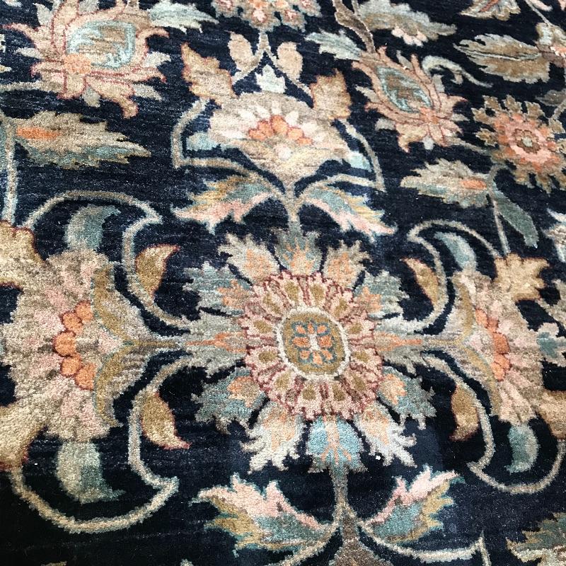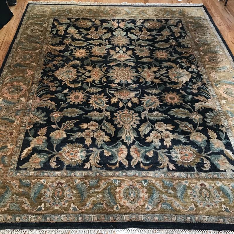 Gorgeous 8’ x 10’ area rug with midnight blue/black center, greens and blush accents. Zoom into photos for a better grasp on the amazing color scheme. A dark spot in one corner shows up bright in photos, but is a little less noticeable in person. It is unknown if it is a stain or sun-bleached. This item is extremely well made and well kept, the outside border and fringe are in great shape. Rug is accompanied by a non-slip rug pad. Local pick up only.