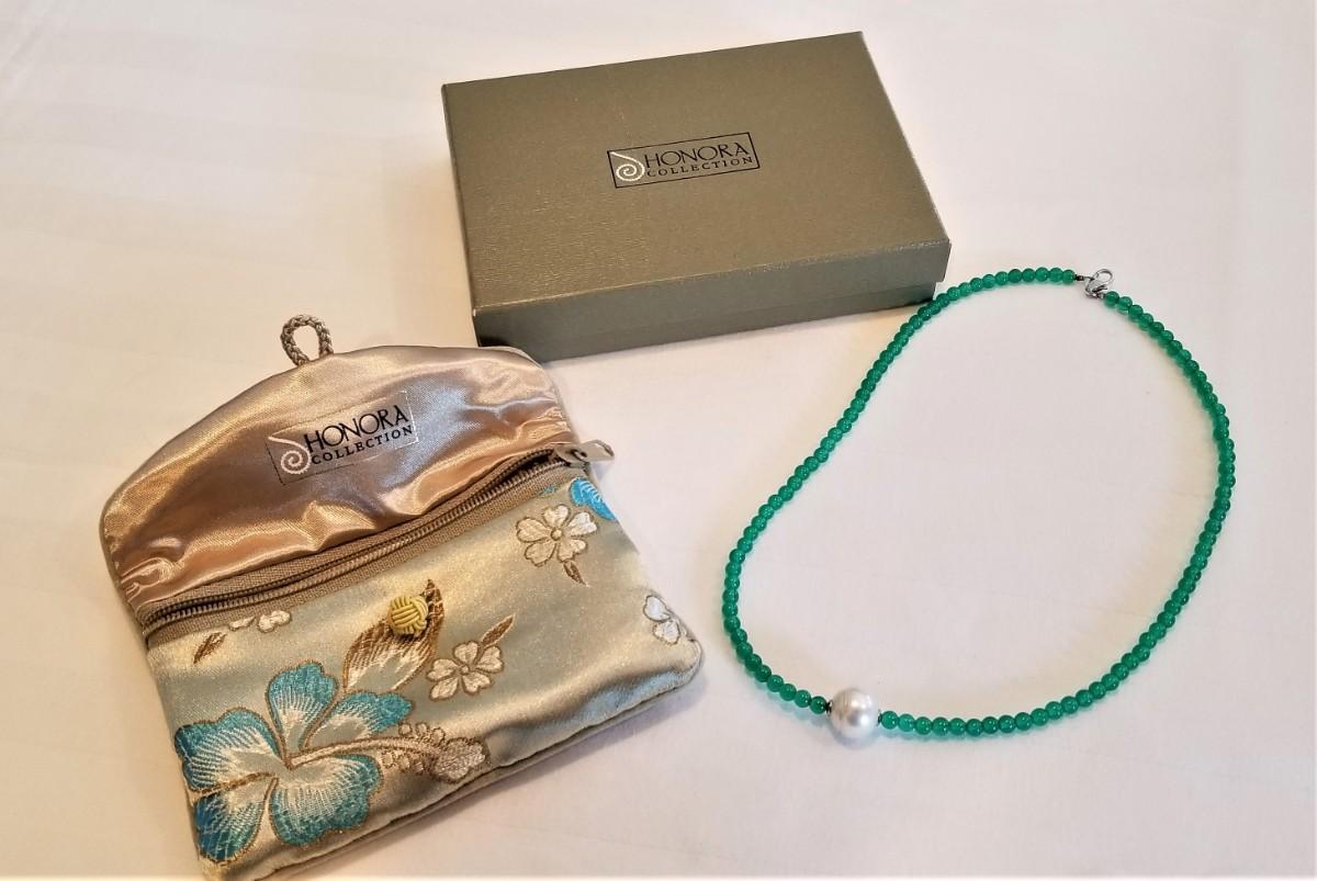 Perfect for a young lady - perhaps her first piece of "real" jewelry? Sterling silver clasp, polished green stones and a lovely, single natural pearl. 12 inches long. Comes with original box and pouch.
