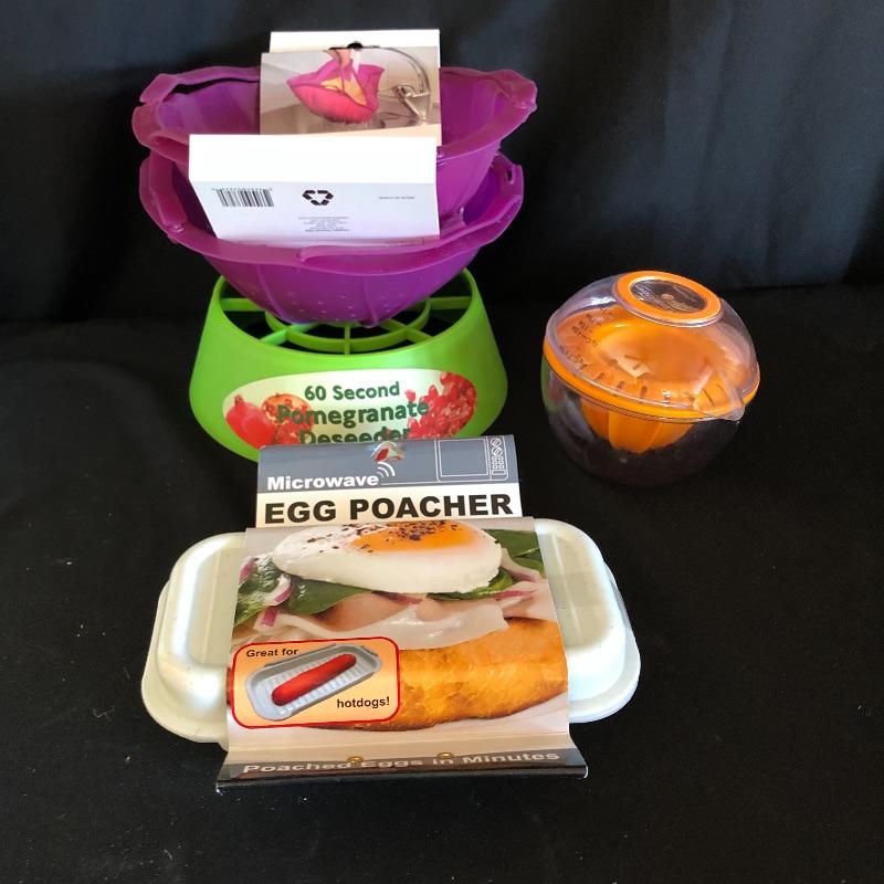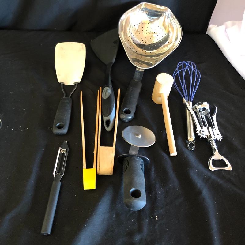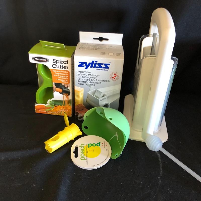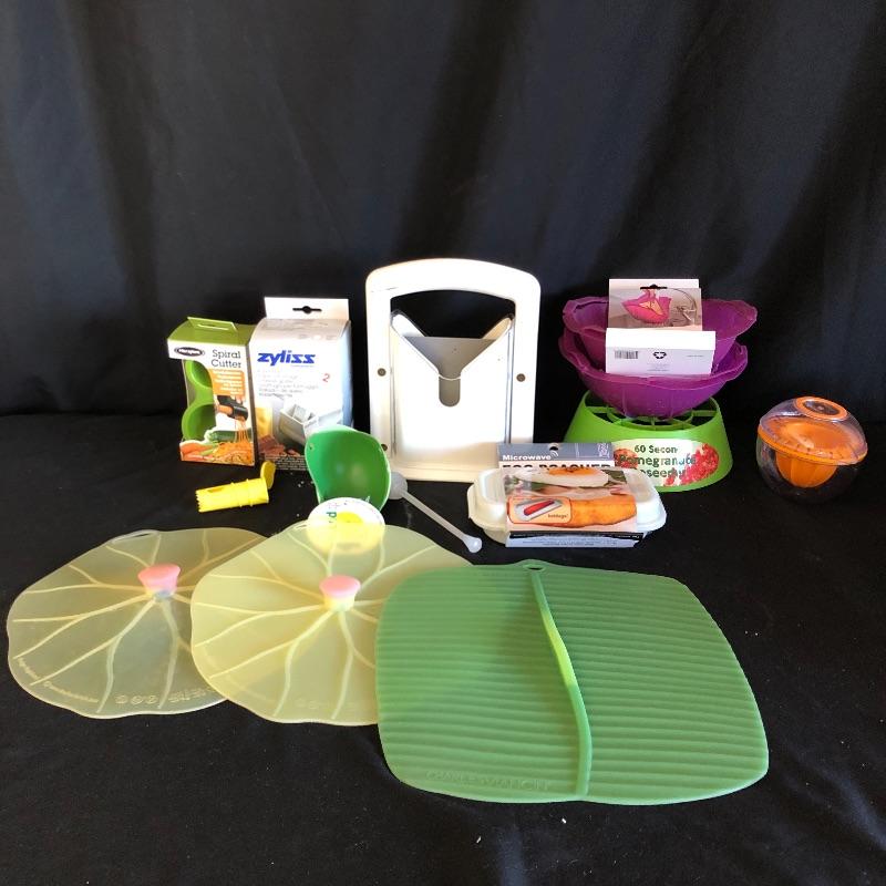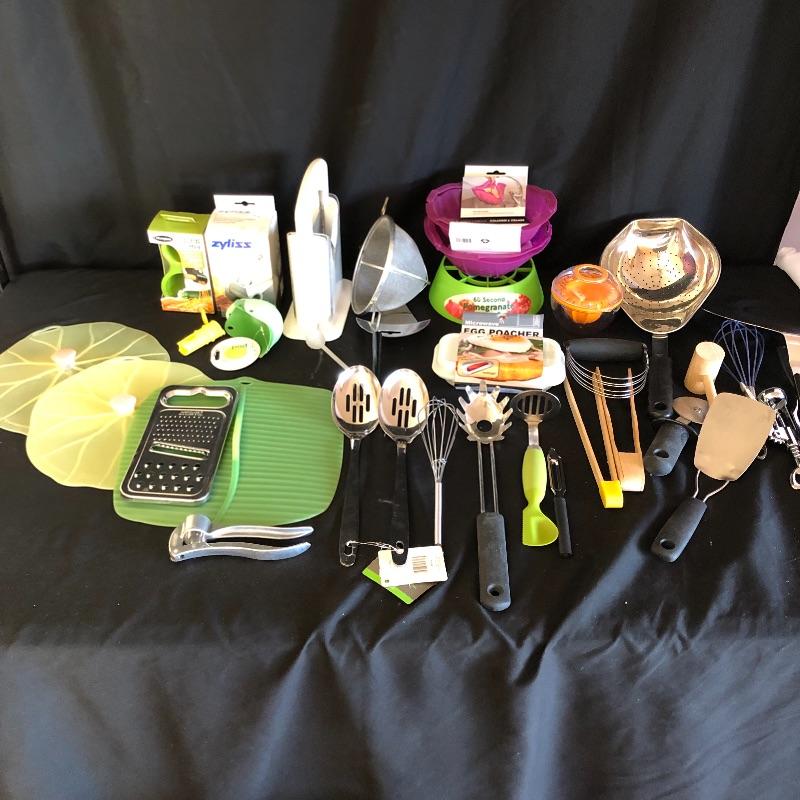 Get your kitchen utensils all in one fell swoop with this selection. Lot includes three Charles Viancin covers, Bagel Biter, two colanders, cheese grater, spiral cutter, pomegranate deseeder, egg poacher, garlic press, mixing spoons and more. Most item appear to be new and unused.