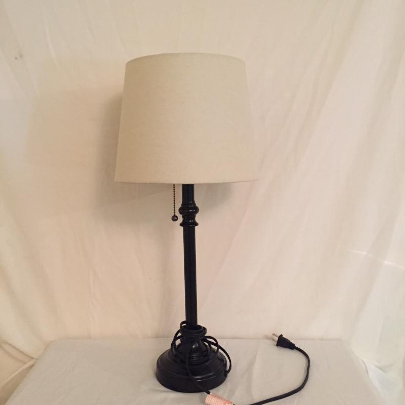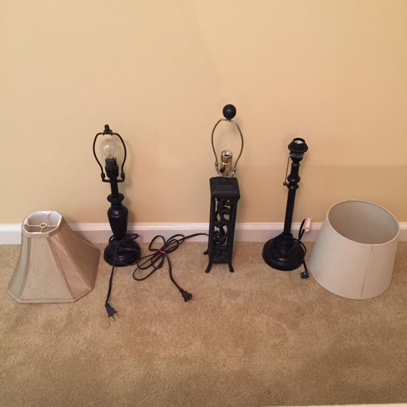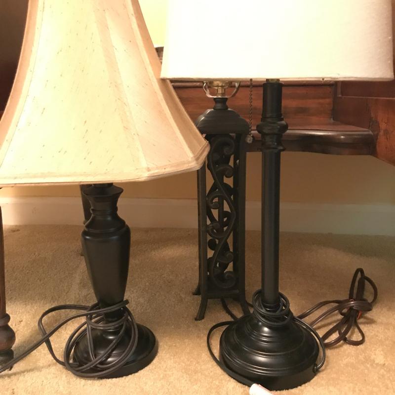 Three black metal lamps. Two of which have shades that are in great condition. Tallest Lamp Measures 22.5”. Local Pickup Only
