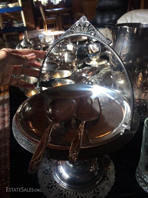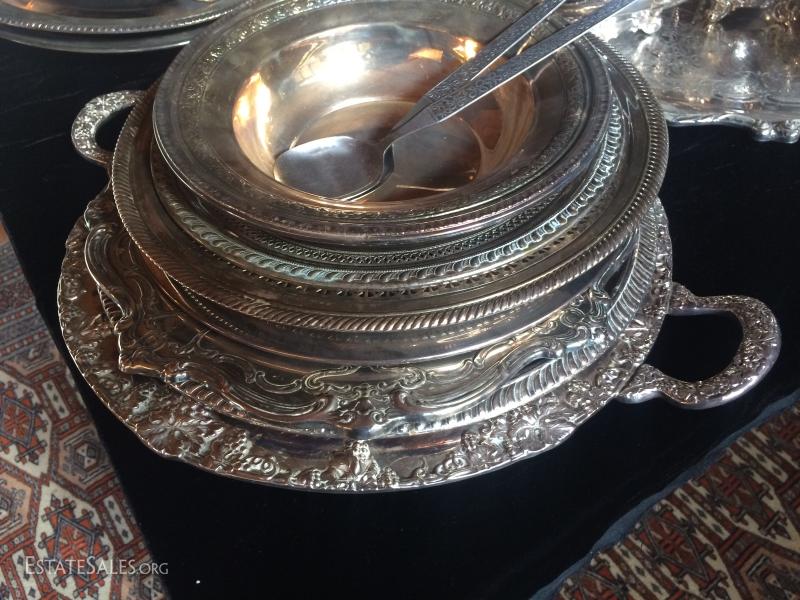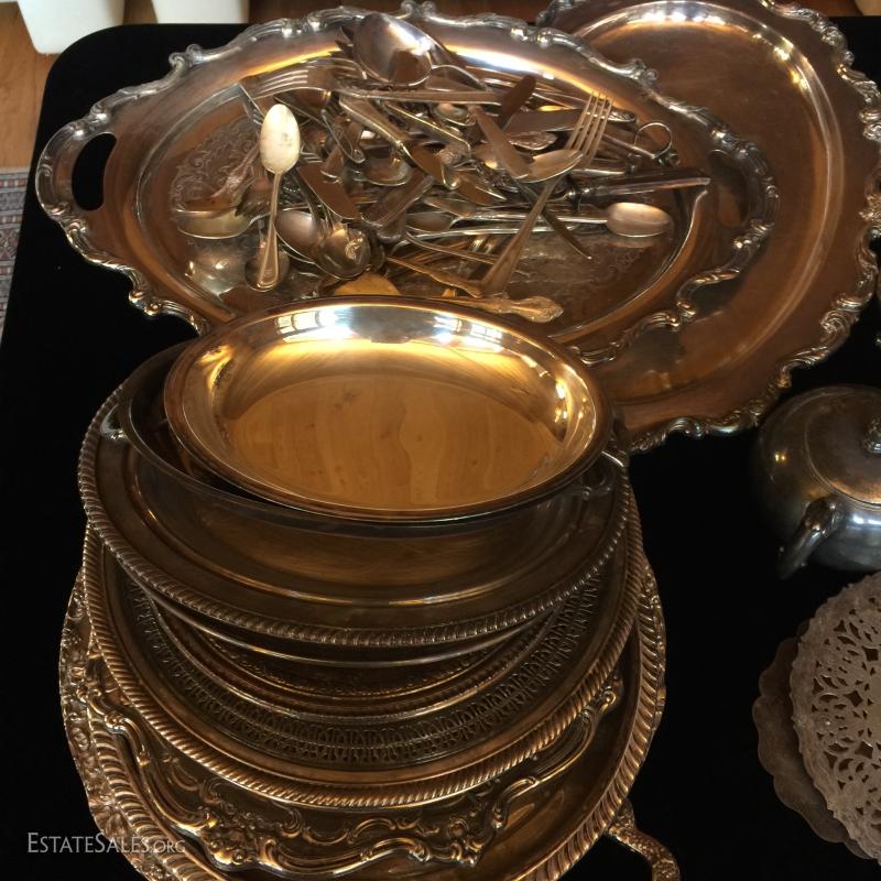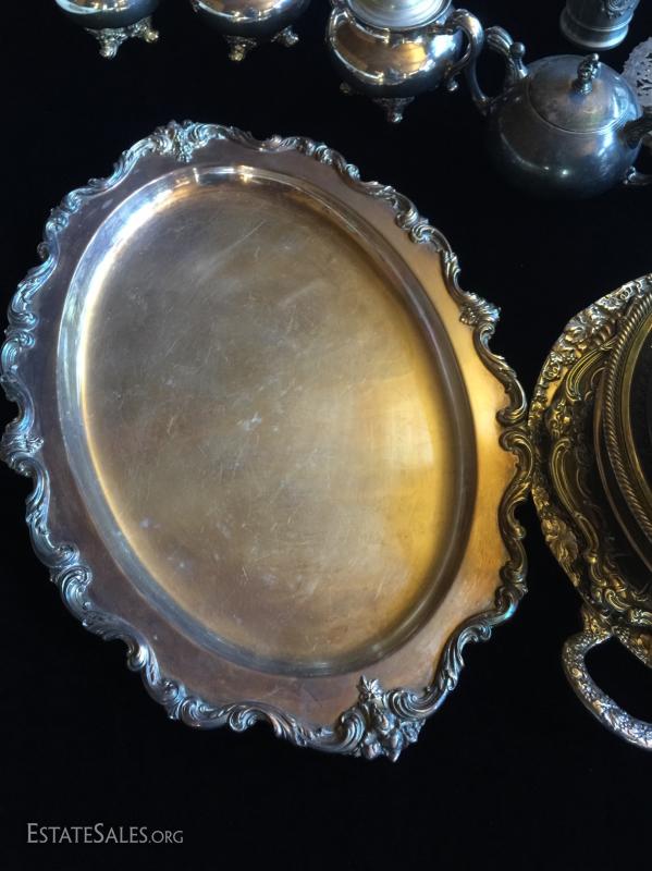 Silver plated collection of Platters, Service pieces and Utensils. Varied styles and origins. Includes: 2 large serving trays, cake stand, 25+ small trays/serving pieces, tea service, gravy boat, wine glasses and basket.