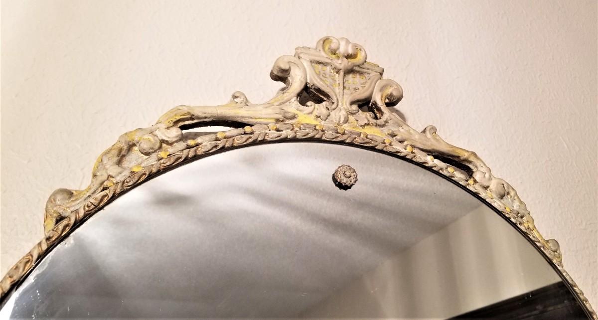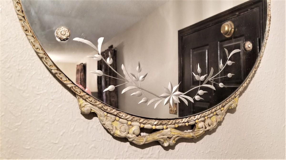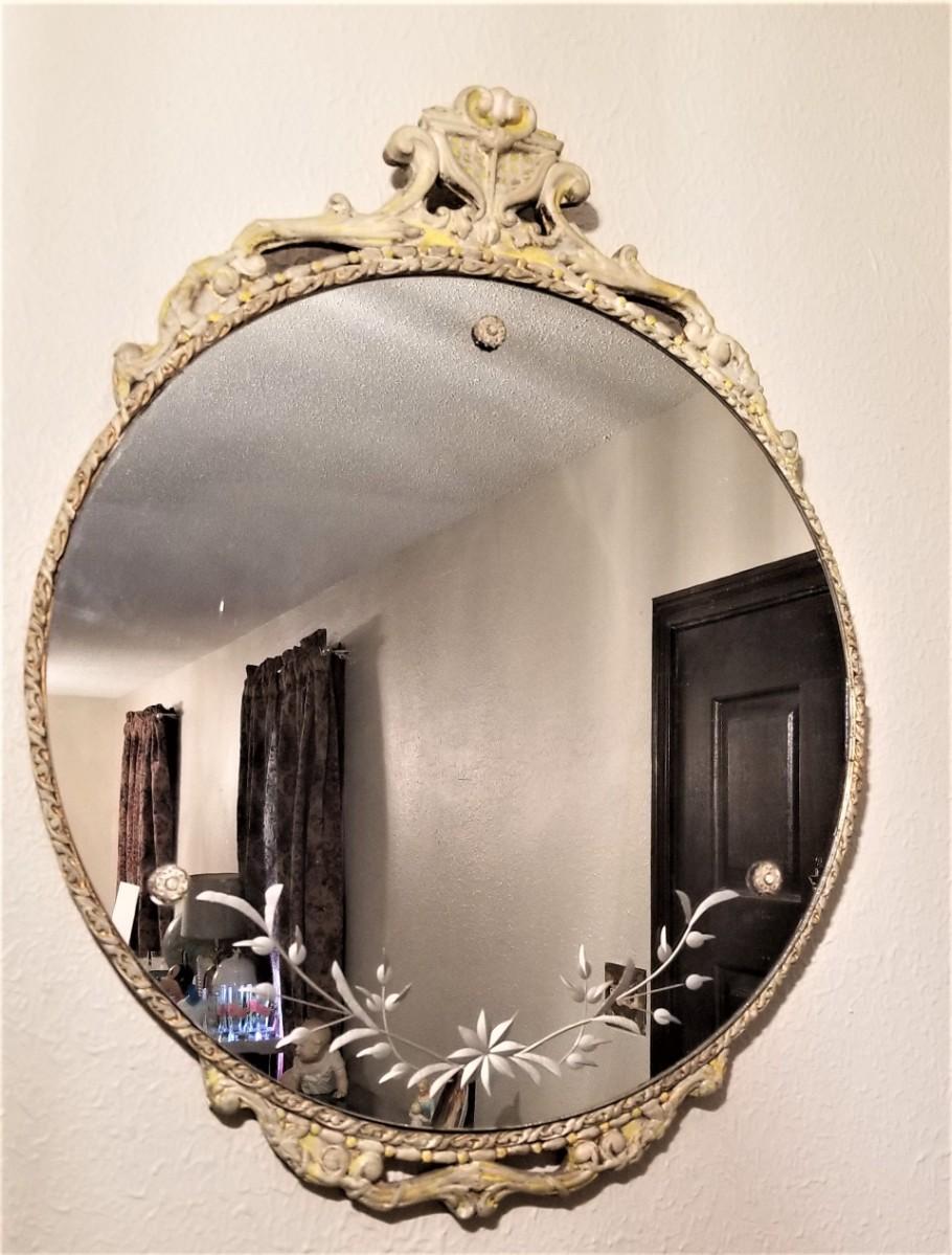 This vintage round wall mirror has a distinctly Shabby Chic look - etched design at bottom - wood Gesso painted frame, soft colors. Great condition. Heavy. 18.5" across, 24" tall.