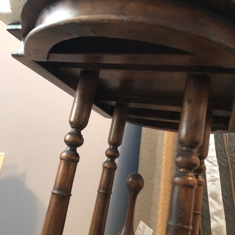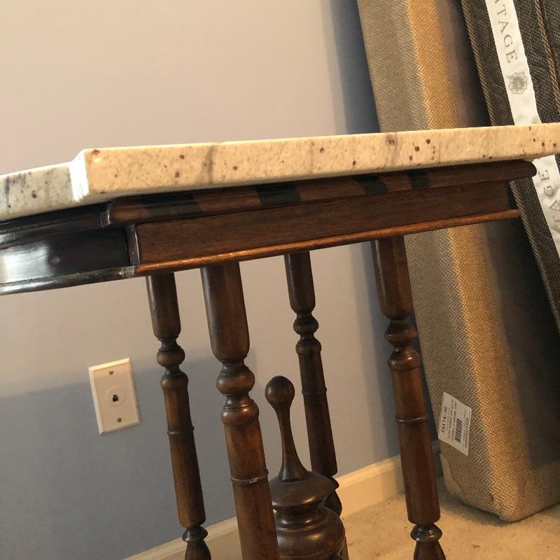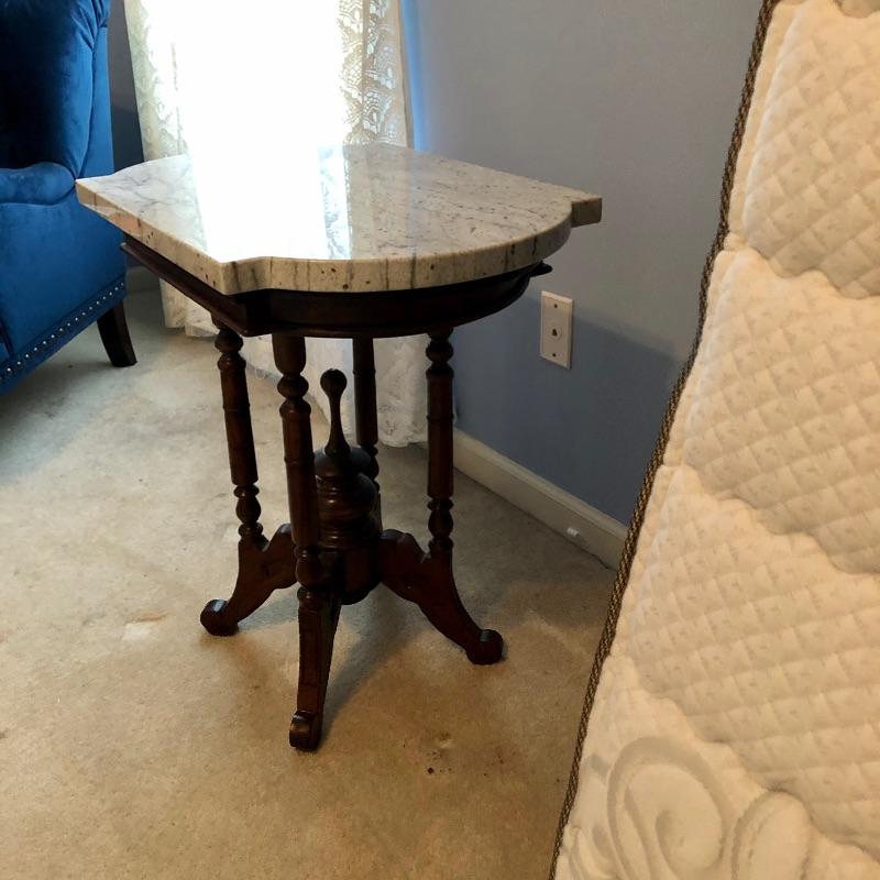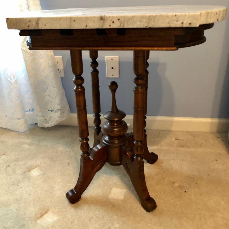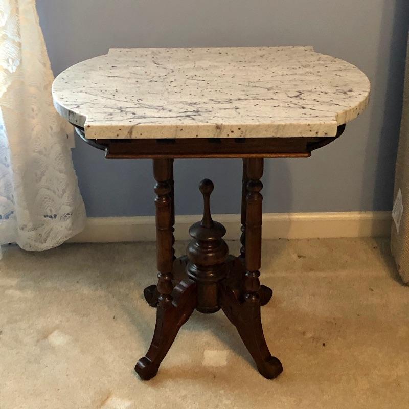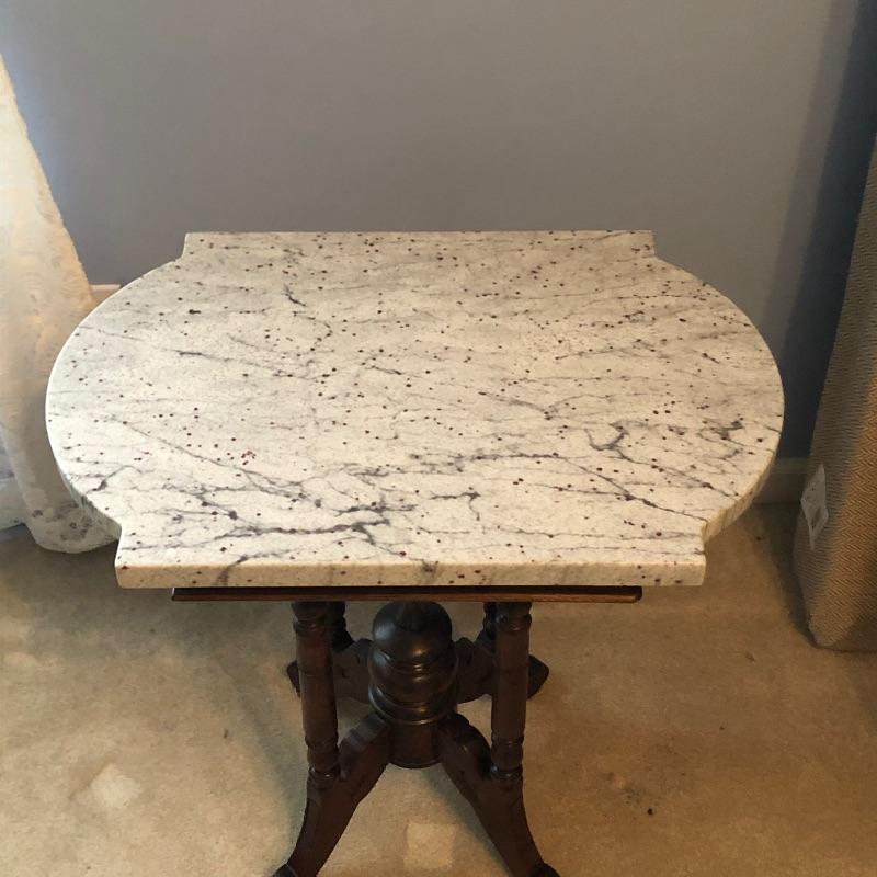 This stunning side table appears to be a refinished vintage piece. Victorian in style with elegant carved features, this table has at some point in its life had a marble top added. The top has the same curved ends to match the wood and is a grey marble with darker grey veins and dark red spots. It has a nice finial detail on the bottom. Another piece with the same marble top can be found in lot 39. Please note it is a heavy piece.
