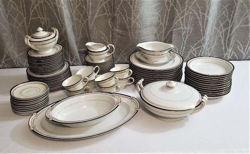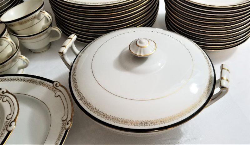 Nice vintage set (made in Japan) of fine china - You get everything you see here. Oval platter, Serving Bowl, 8 tea cups, 11 saucers, 12 bread/butter plates, 11 dinner plates, Cream & Sugar, 12 Salad plates, 12 soup bowls , Tureen, 12 salad plates, 12 small bowls, sauce/gravy boat. Nice condition. Note: These cannot go into the microwave or dishwasher.