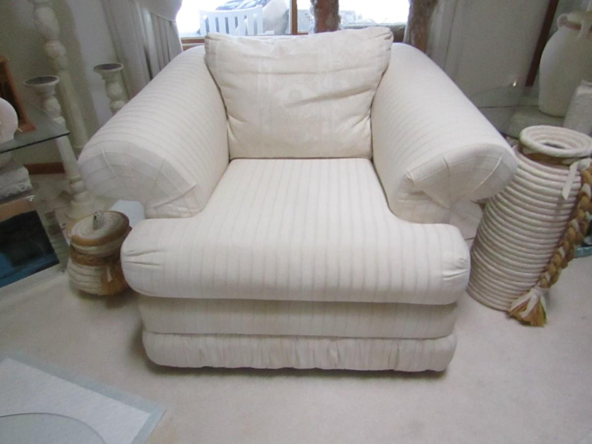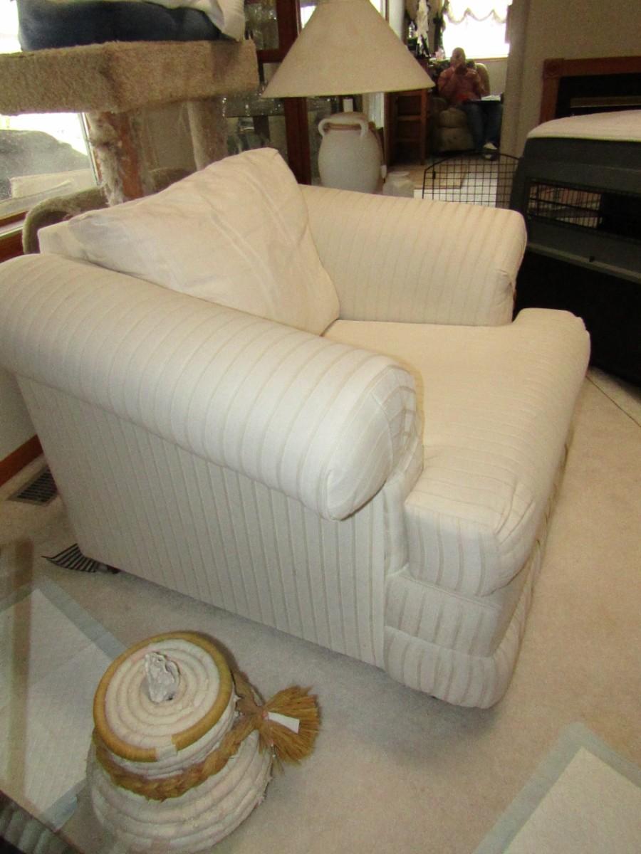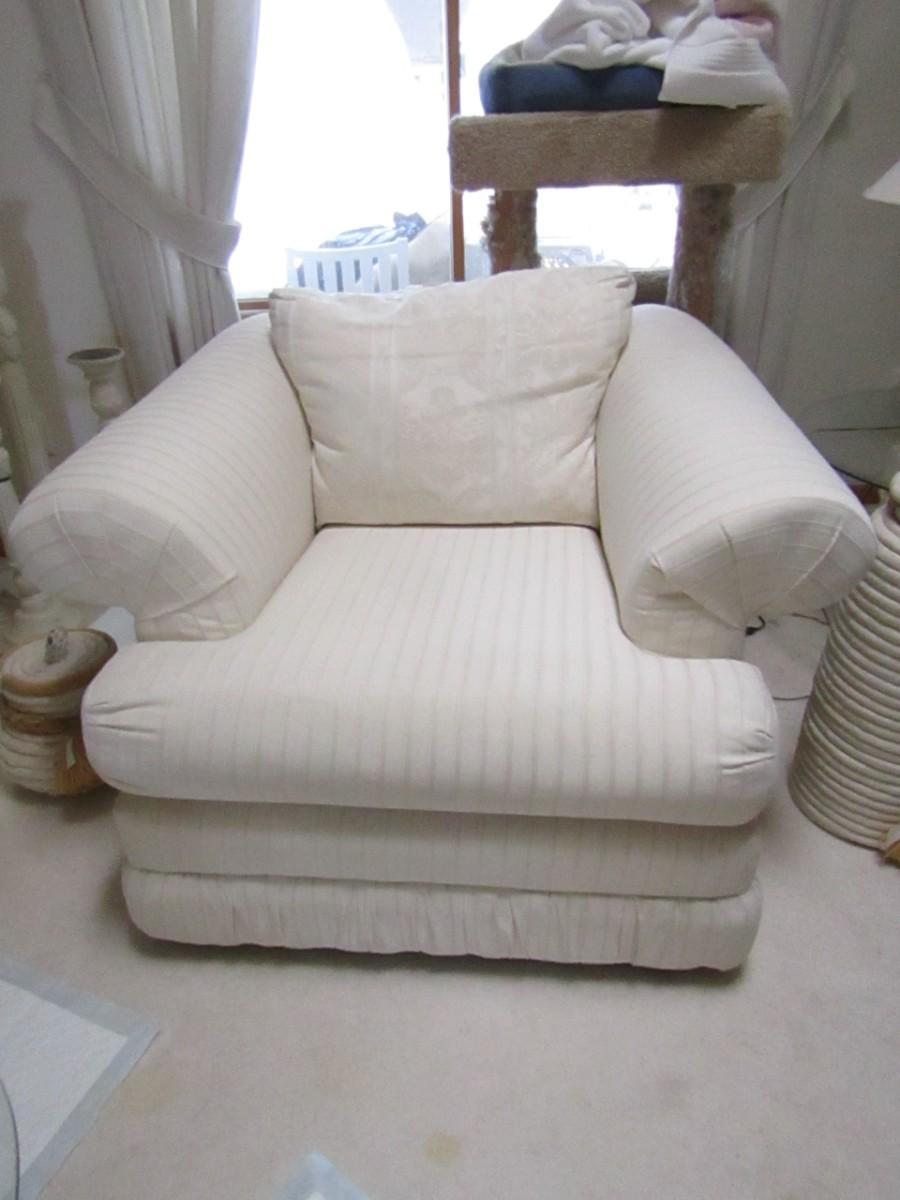 CHAIR IS IN GOOD SHAPE WITH NO STAINS OR DAMAGE BUT THIS CHAIR IS LOCATED UP THE STREET FROM THE SALE HOUSE AND THERE ARE CATS WHO LIVE IN THE HOME THEREFORE THERE WILL PROBABLY BE SOME CAT HAIRS EVEN THOUGH THE CHAIR IS ALWAYS COVERED WITH SHEETS