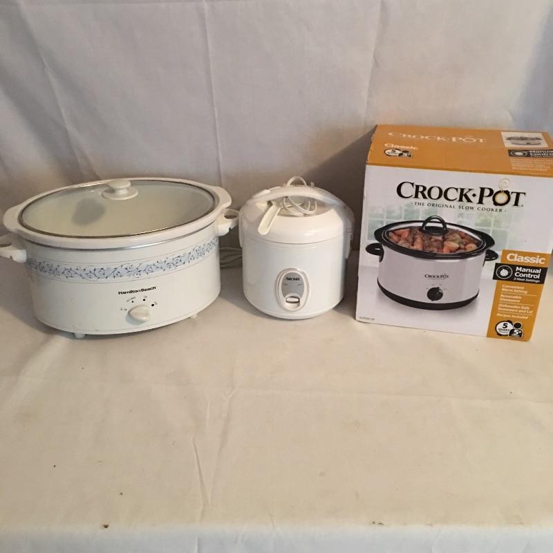 Hamilton Beach slow cooker, Crock Pot appears to be new in box and Aroma rice cooker.