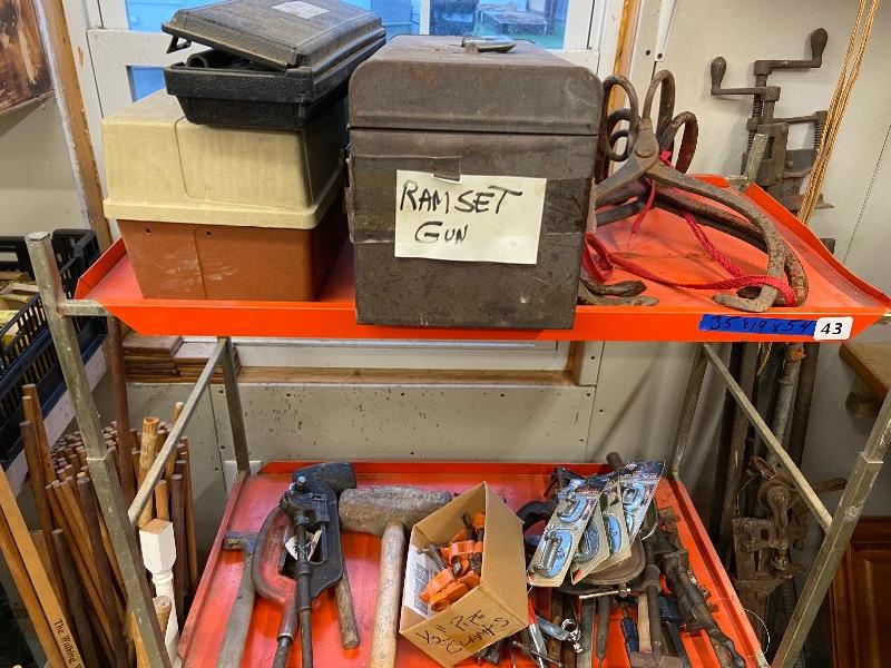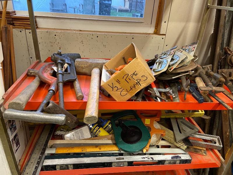 Orange metal shelf of assorted tools, wooden dowels and scraps, vices, rulers, clamps, ramset gun, rulers. levels.