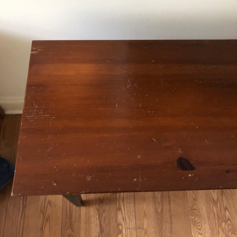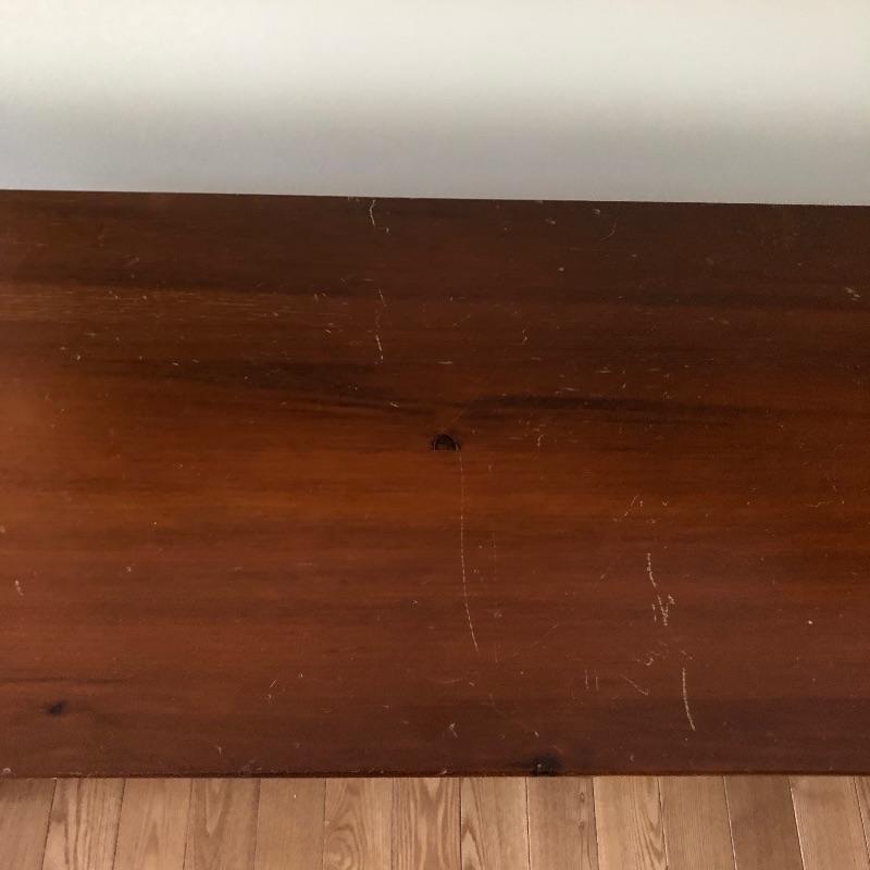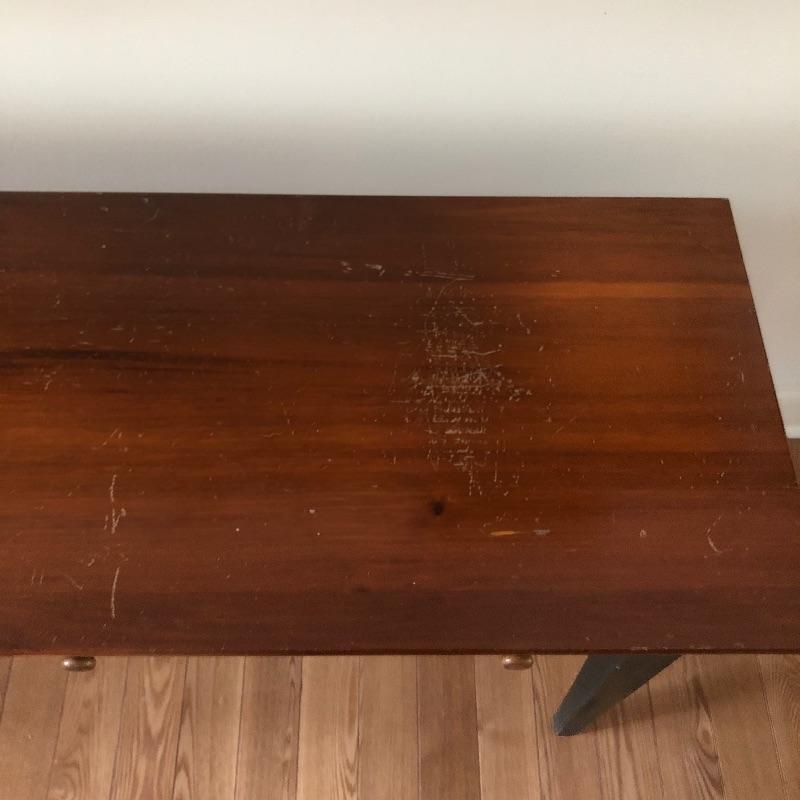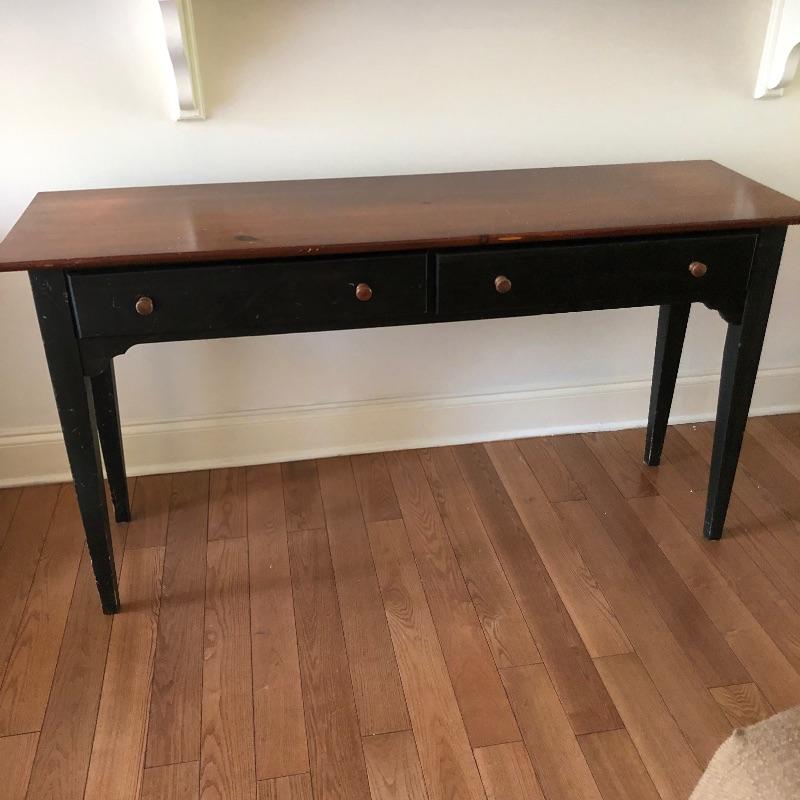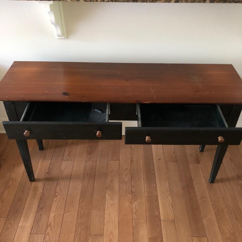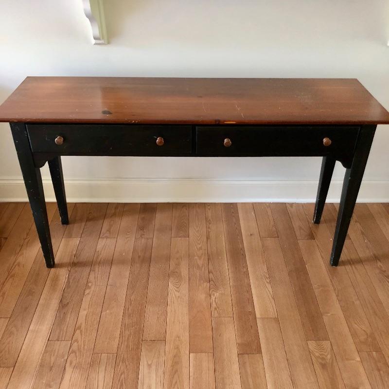which is a natural medium toned wood. The top could do with being sanded as it has scratches and scuff marks. It has two good sized drawers and measures 52” x 16” x 27.5”.