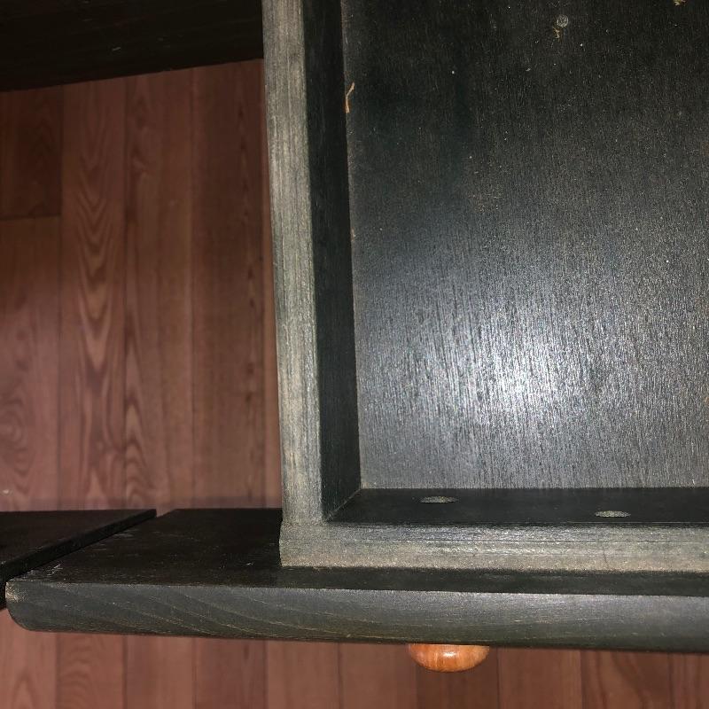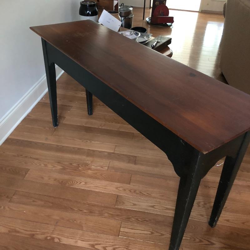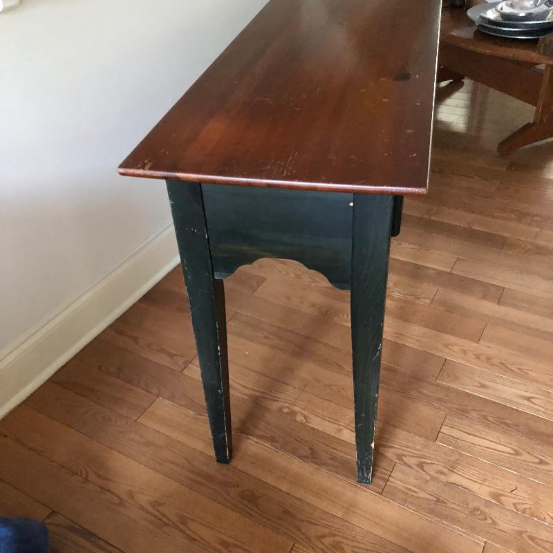 This two toned wood sofa table has been stained a dark green on all but the top surface