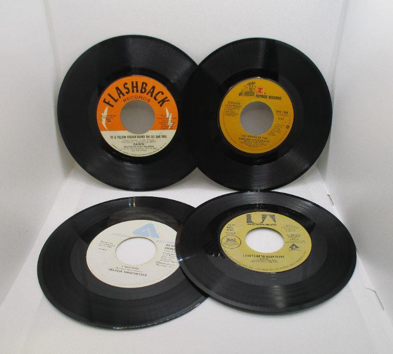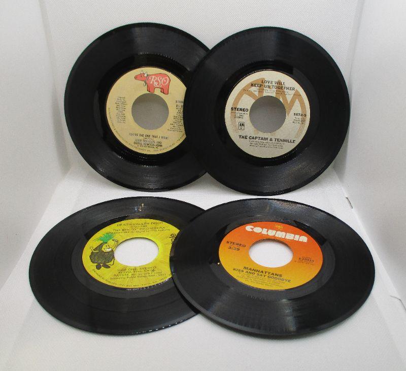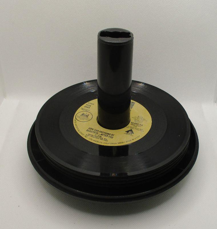 The carrier is in great shape, just needs to be cleaned. The 45s include: Grease, You're the One That I Want; Captain and Tennille, Love Will Keep Us Together; Manhattans, Kiss and Say Goodbye; Death Valley Disco; Tony Orlando and Dawn, Tie a Yellow Ribbon; Gordon Lightfoot, The Wreck of the Edmund Fitzgerald; Paul Anka, I Don't Like To Sleep Alone; and Melissa Manchester, I Got Eyes. The 45s are in great shape.