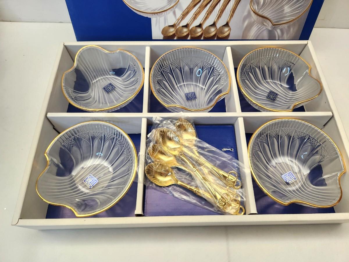 This vintage set is new in box - Six shell-shaped serving bowls with gold-colored (metal) spoons - TOYO Japan - bowls are 4.5" across and 2" tall.