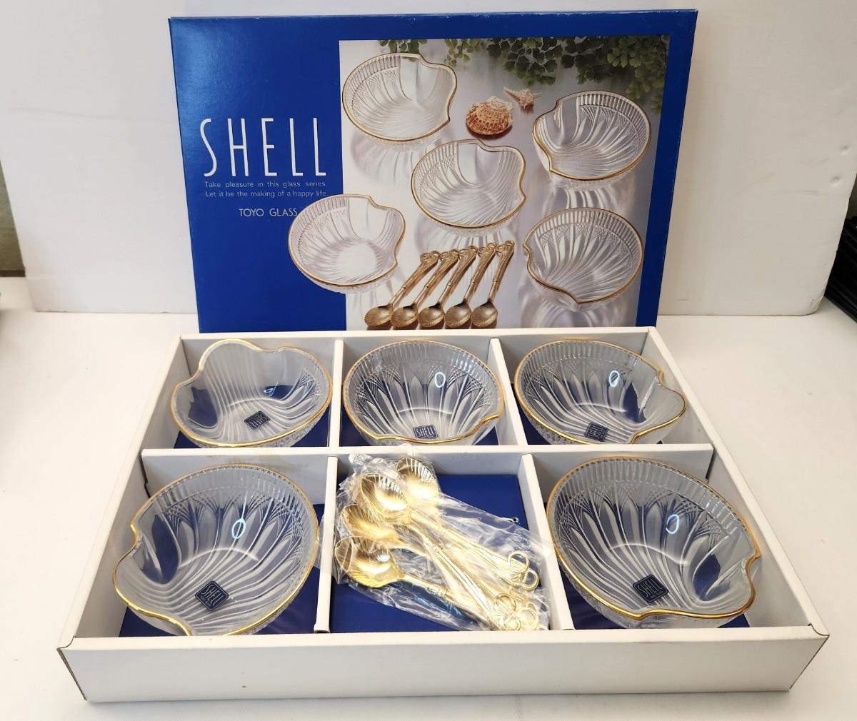 Lot #43 TOYO Glass (Japan) Shell Serving Dishes w/spoons New in Box