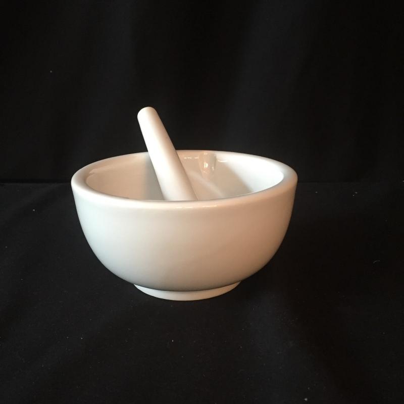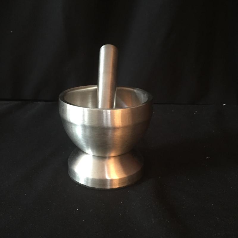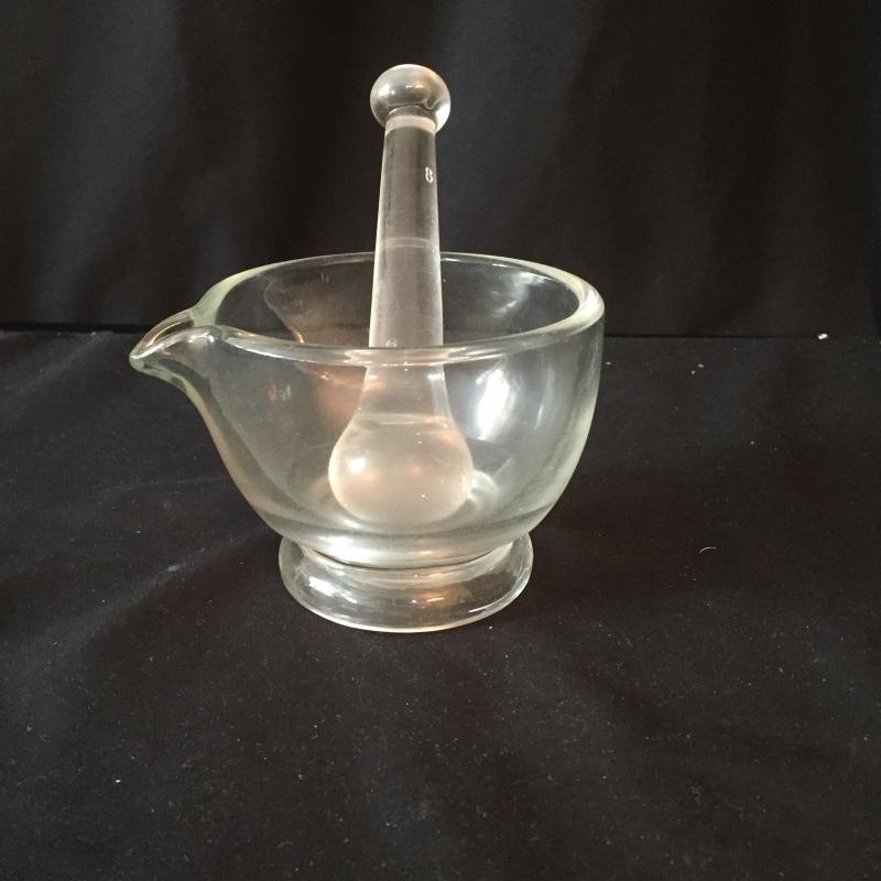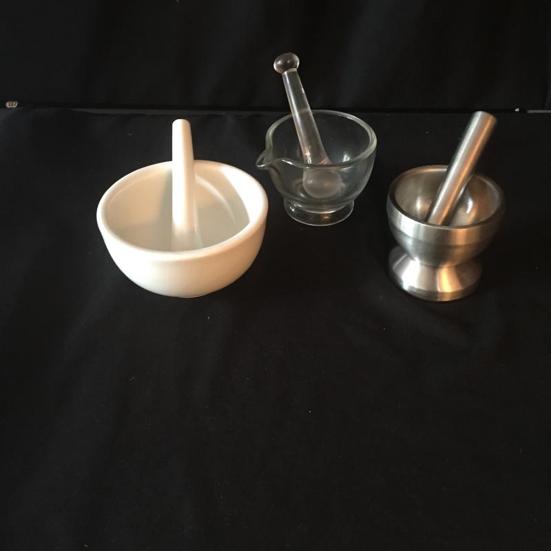 Trio of mortar and pestles. One Stainless, one clear glass and and one white ceramic. White mortar measures 6” D.