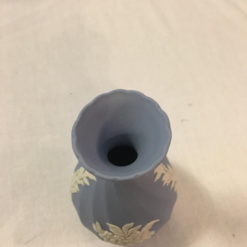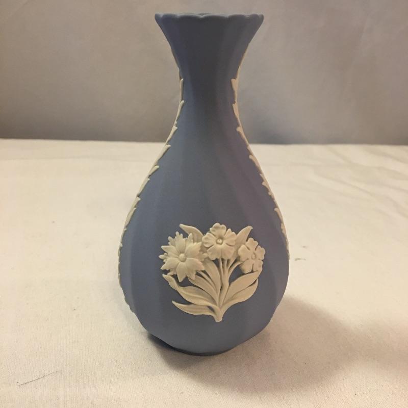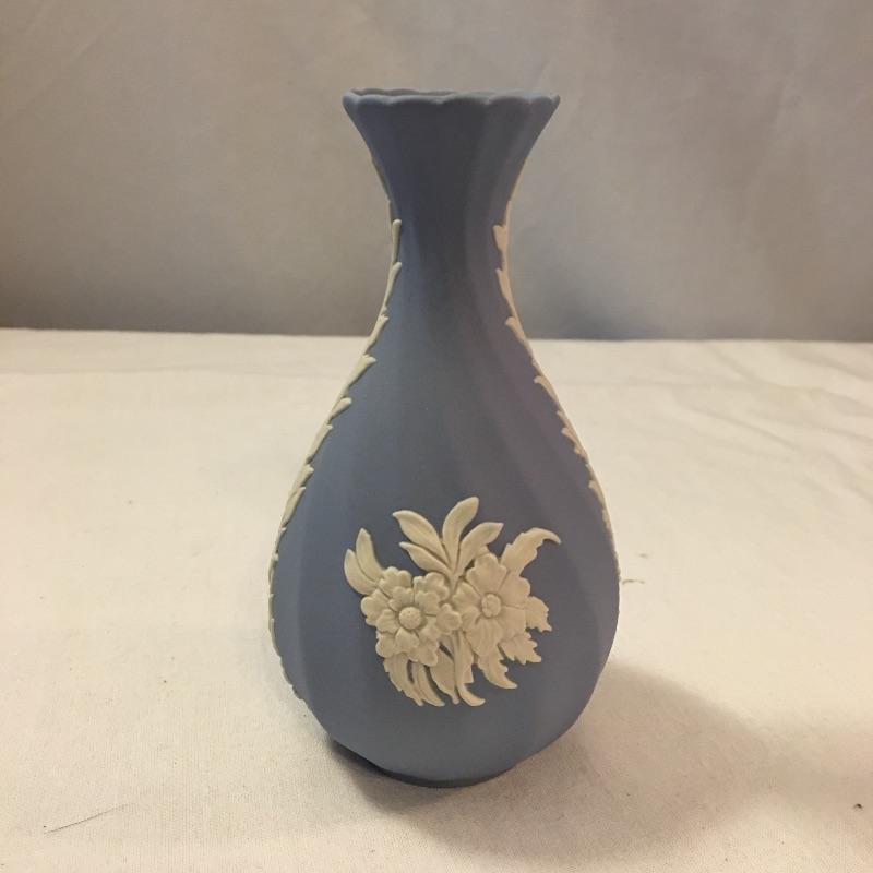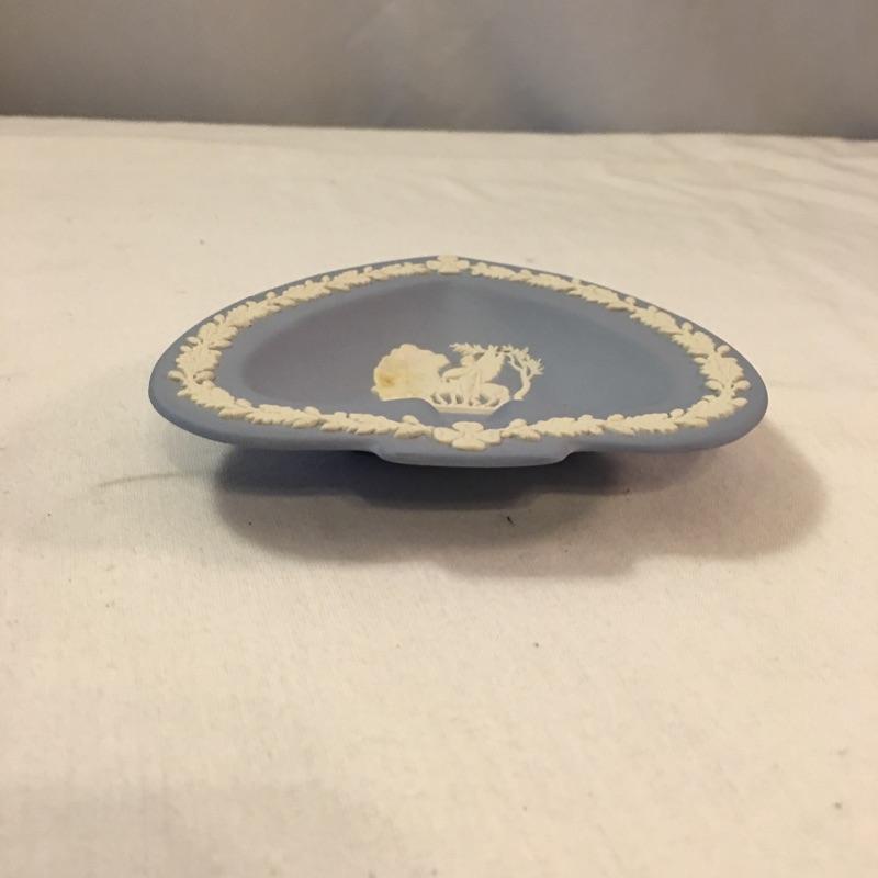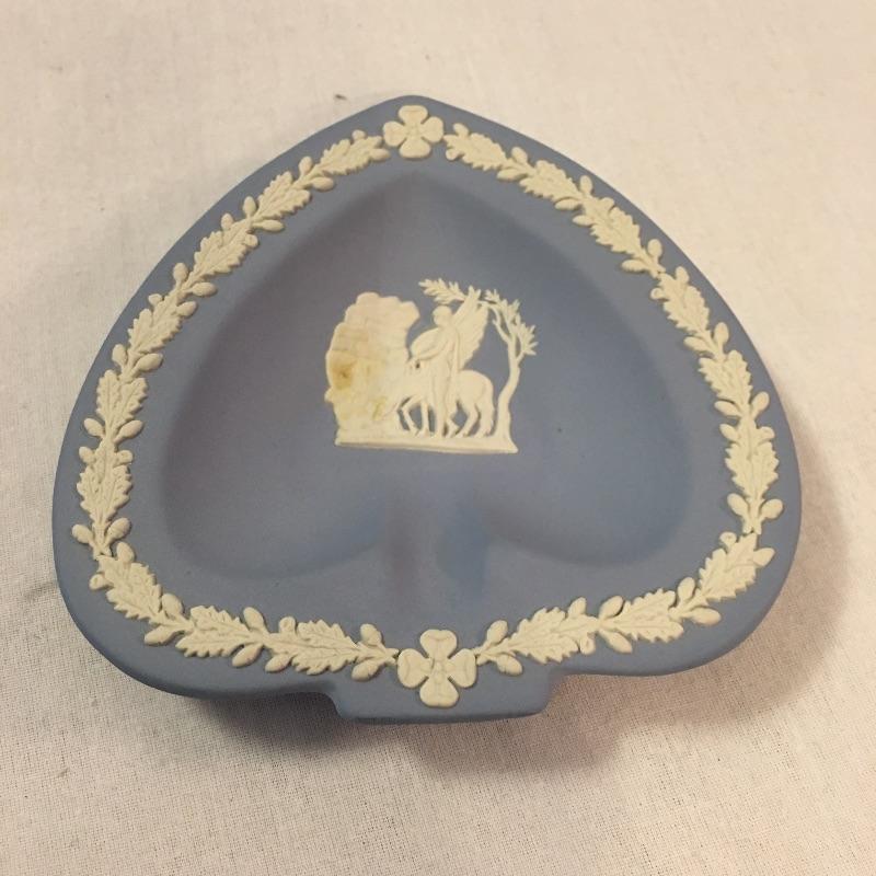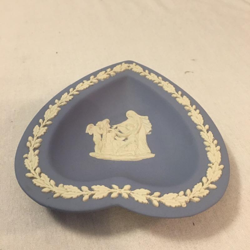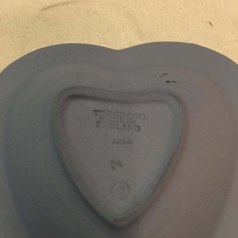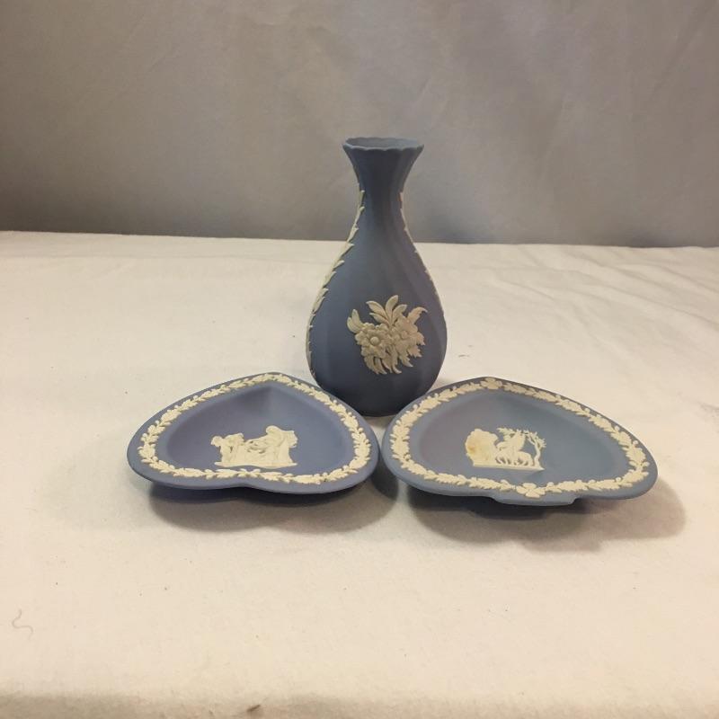 Relax and enjoy this selection of English Wedgwood that includes two heart shaped dishes and a small vase. Vase measures 2.25”D x 5.25”. One dish has a small discoloration on a small area of white, see pictures. All three pieces are marked Wedgwood.