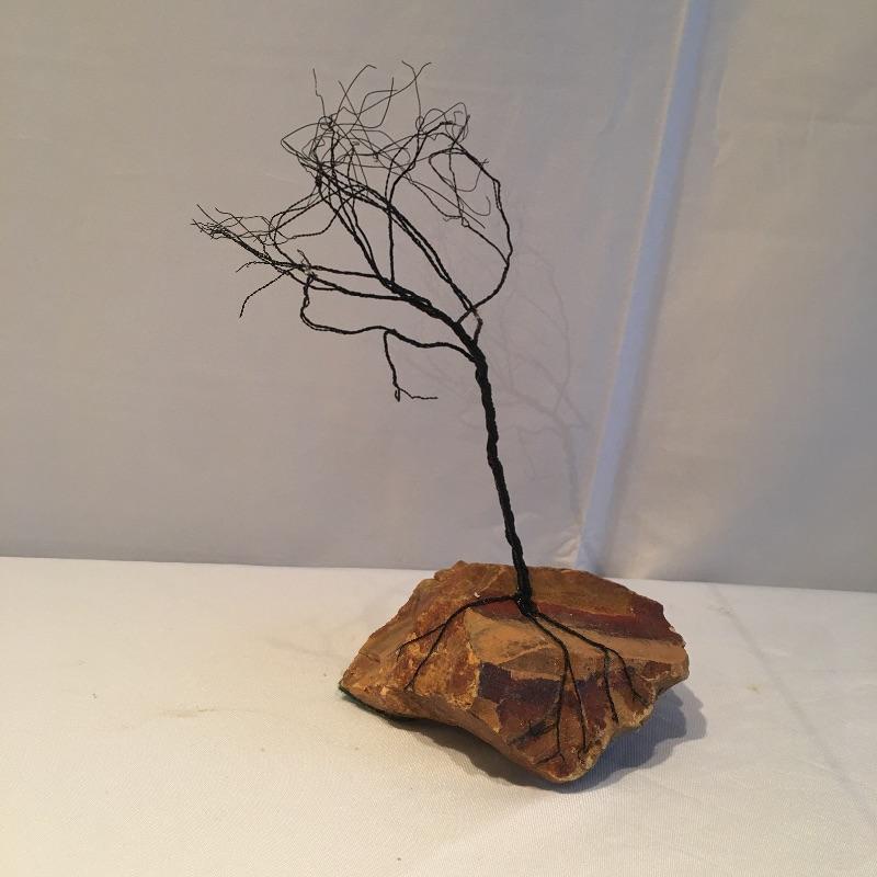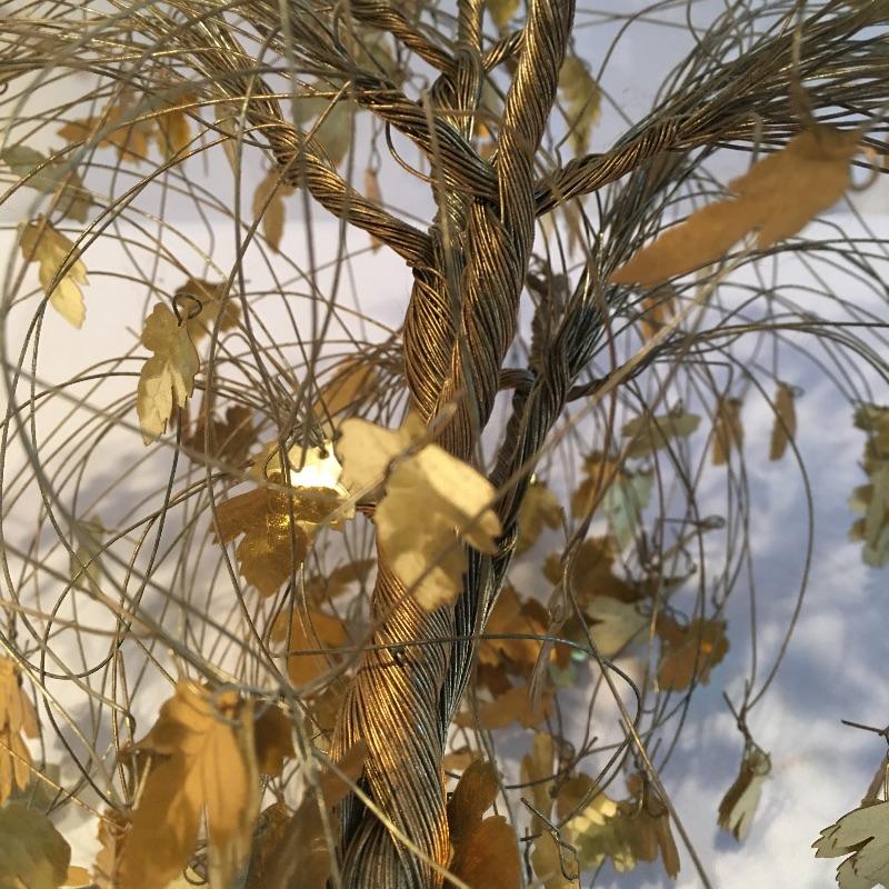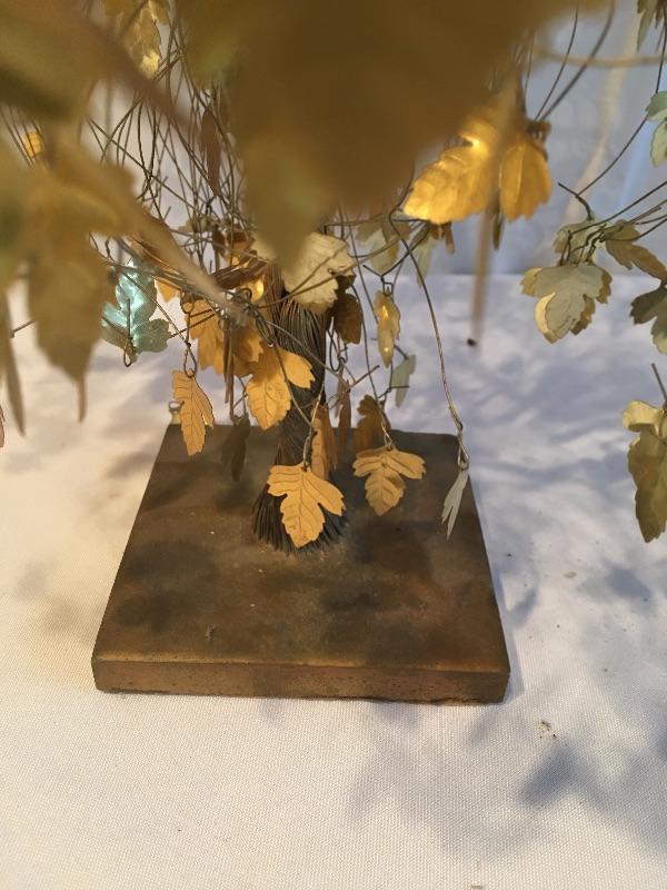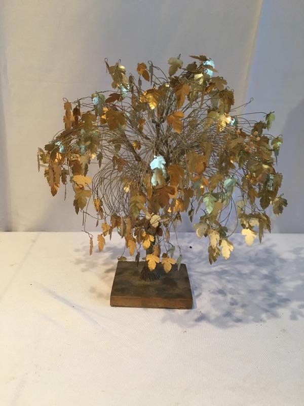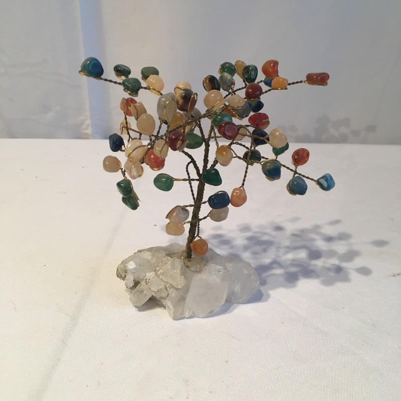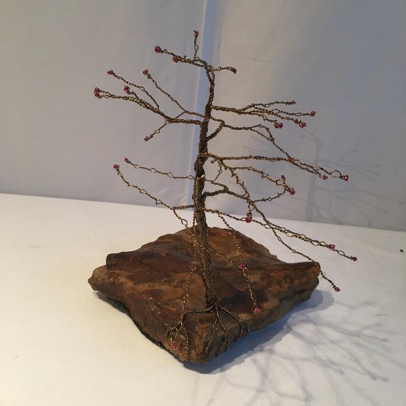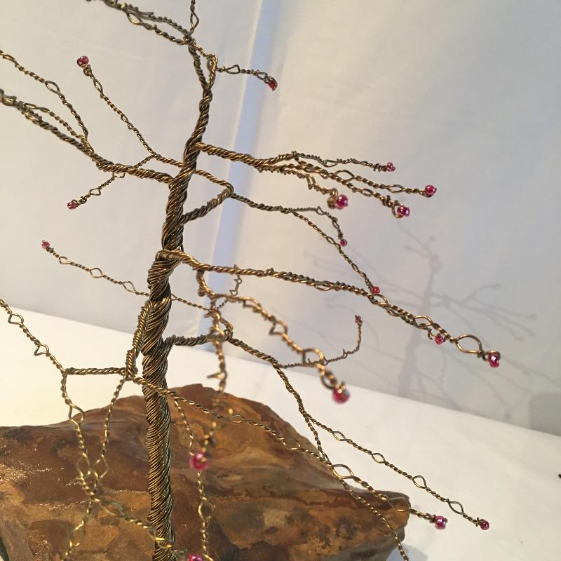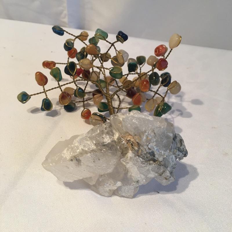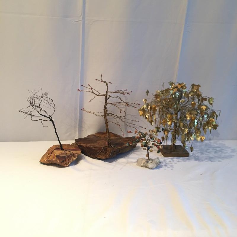 A shimmering display of twisted wire trees with two having stone bases, a quartz based tree with colored stones and a twisted wire tree with gold colored leaves.